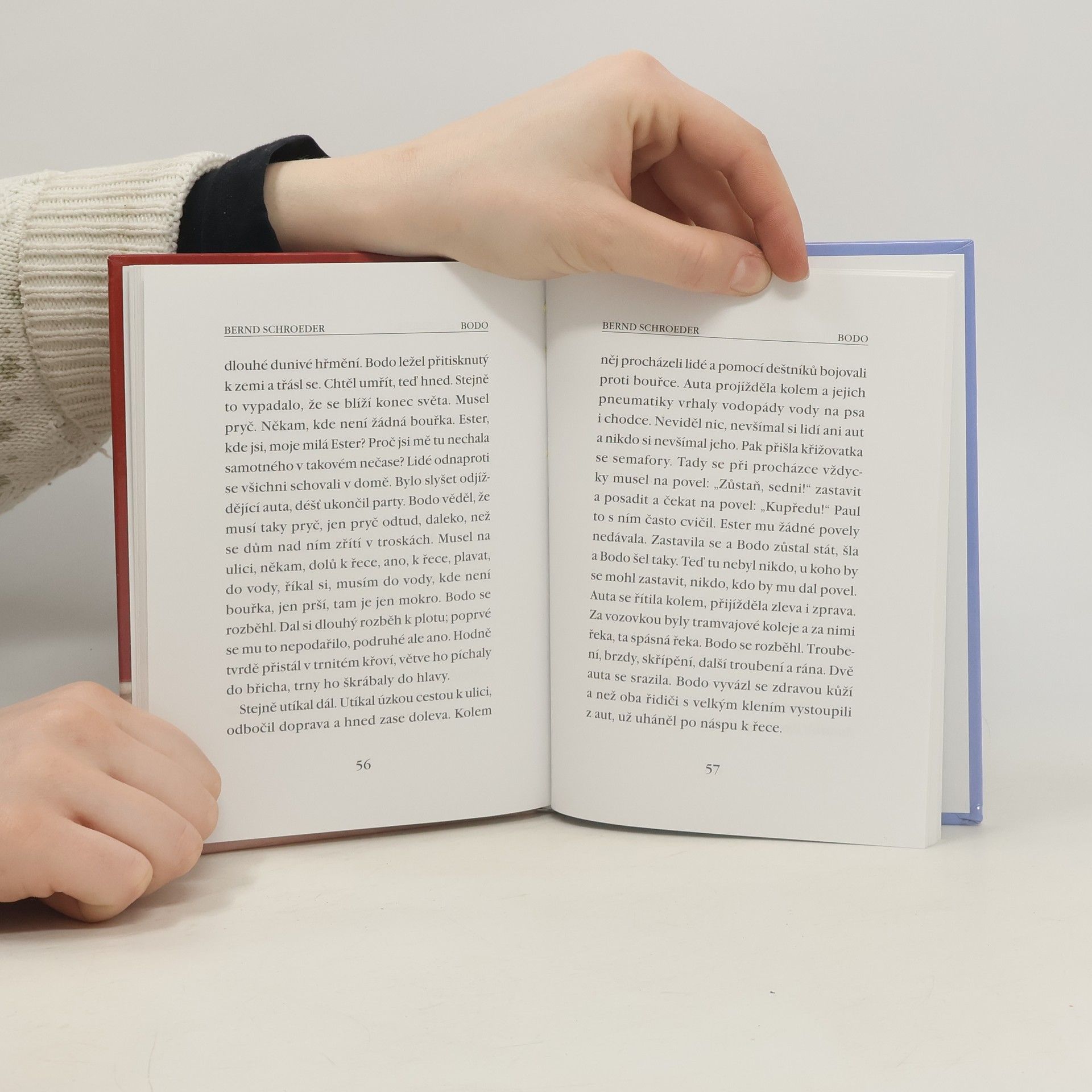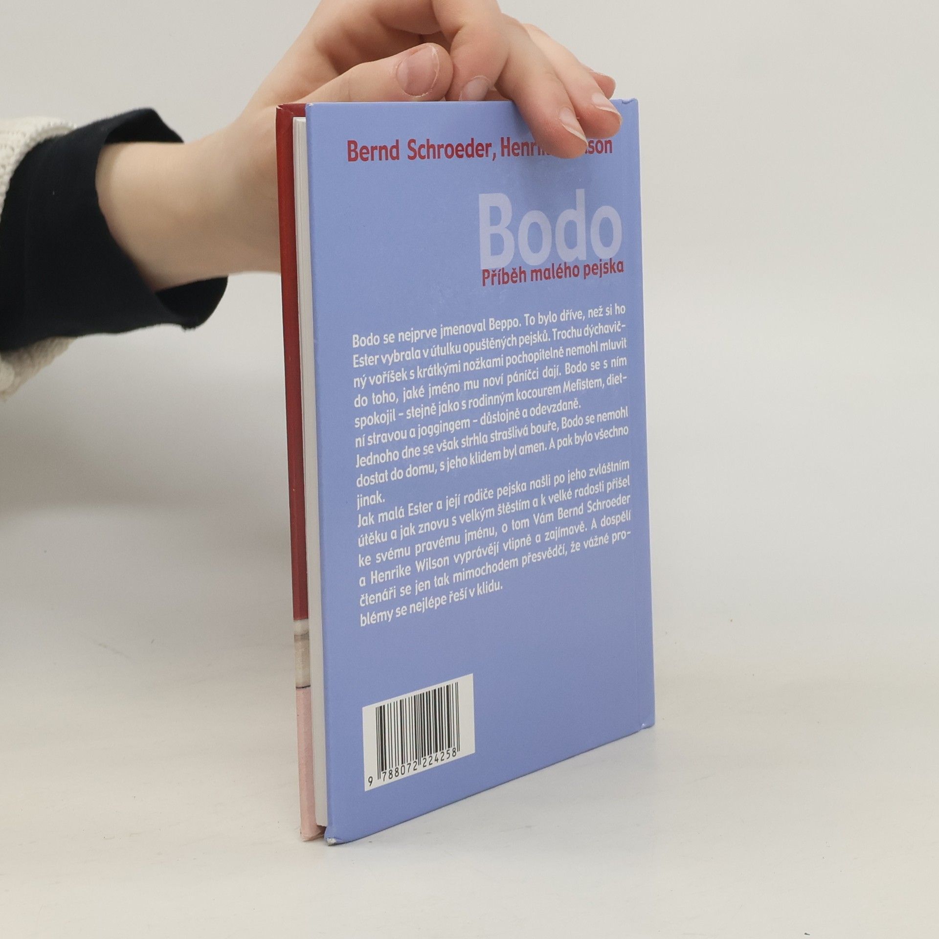 Bodo se nejprve jmenoval Beppo. To bylo dříve, než si ho Ester vybrala v útulku opuštěných pejska. Trochu dýchavičný voříšek s krátkými nožkami pochopitelně nemohl mluvit do toho, jaké jméno mu noví páníčci dají. Bodo se s ním spokojil - stejně jako s rodinným kocourem Mefistem, dietní stravou a joggingem - důstojně a odevzdaně. Jednoho dne se však strhla strašlivá bouře, Bodo se nemohl dostat do domu, s jeho klidem byl amen. A pak bylo všechno jinak. Jak malá Ester a její rodiče pejska našli po jeho zvláštním útěku a jak znovu s velkým štěstím a k velké radosti přišel ke svému pravému jménu, o tom Vám Bernd Schroeder a Henrike Wilson vyprávějí vtipně a zajímavě. A dospělí čtenáři se jen tak mimochodem přesvědčí, že vážné problémy se nejlépe řeší v klidu.
