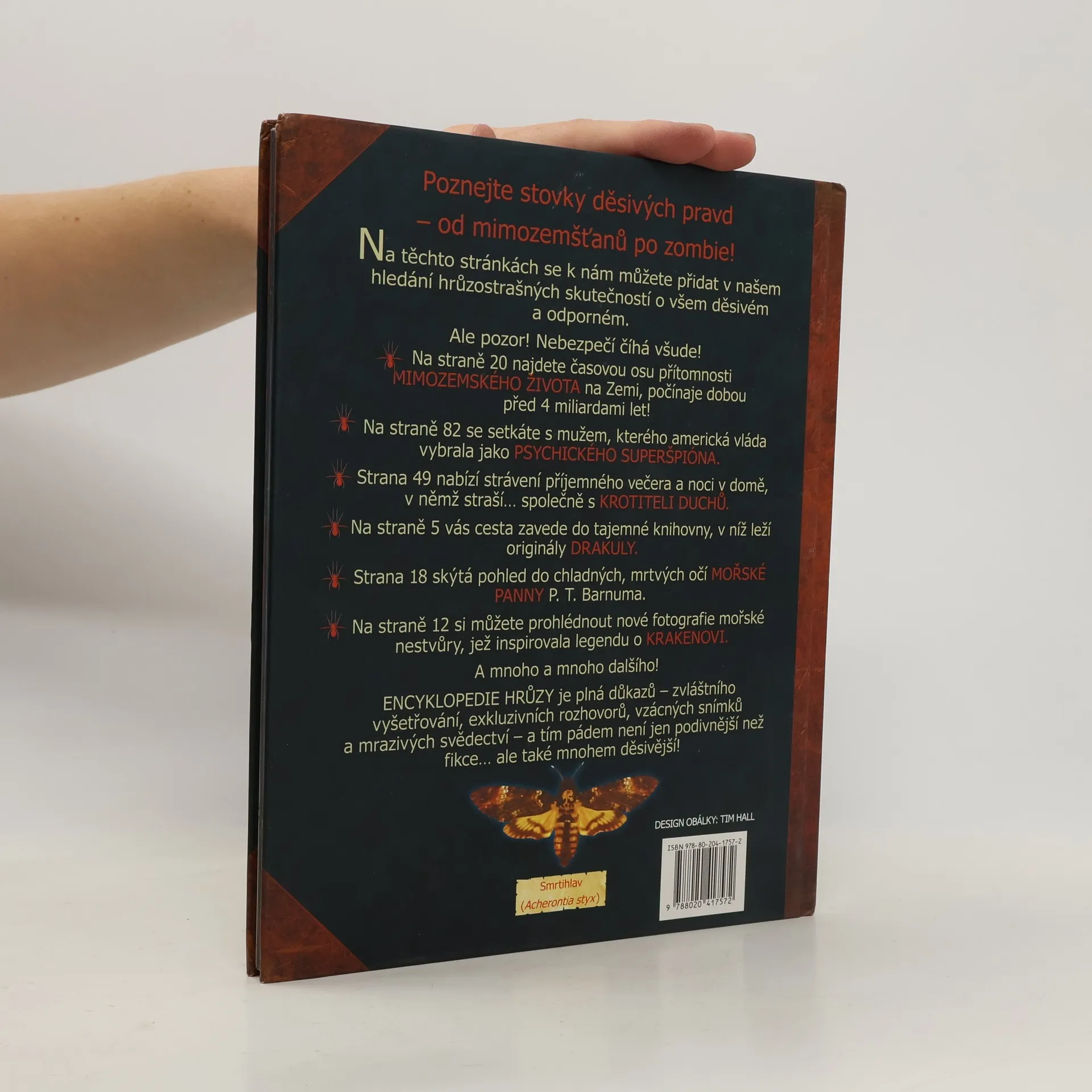 Spisovatel, redaktor a badatel v oblasti paranormálních jevů sestavil bohatě ilustrovanou encyklopedii „hrozivých pravd" o upírech, duchách, monstrech, bájných stvořeních a dalších nevysvětlitelných jevech, kterou doplnil i vylíčením jejich rolí v literatuře a filmu. Na těchto stránkách se k nám můžete přidat v našem hledání hrůzostrašných skutečností o všem děsivém a odporném. Ale pozor! Nebezpečí číhá všude! * Na straně 20 najdete časovou osu přítomnosti mimozemského života na Zemi, počínaje dobou před 4 miliardami let! * Na straně 82 se setkáte s muže, kterého americká vláda vybrala jako psychického superšpióna. * Strana 49 nabízí strávení příjemného večera a noci v domě, v němž straší… společně s krotiteli duchů. * Na straně 5 vás cesta zavede do tajemné knihovny, v níž leží originály Draculy. * Strana 18 skýtá pohled do chladných, mrtvých očí mořské panny P. T. Barnuma. * Na straně 12 si můžete prohlédnout nové fotografie mořské nestvůry, jež inspirovala legendu o krakenovi. A mnoho a mnoho dalšího! Encyklopedie hrůzy je plná důkazů – zvláštního vyšetřování, exkluzivních rozhovorů, vzácných snímků a mrazivých svědectví – a tím pádem není jen podivnější než fikce… ale také mnohem děsivější!
