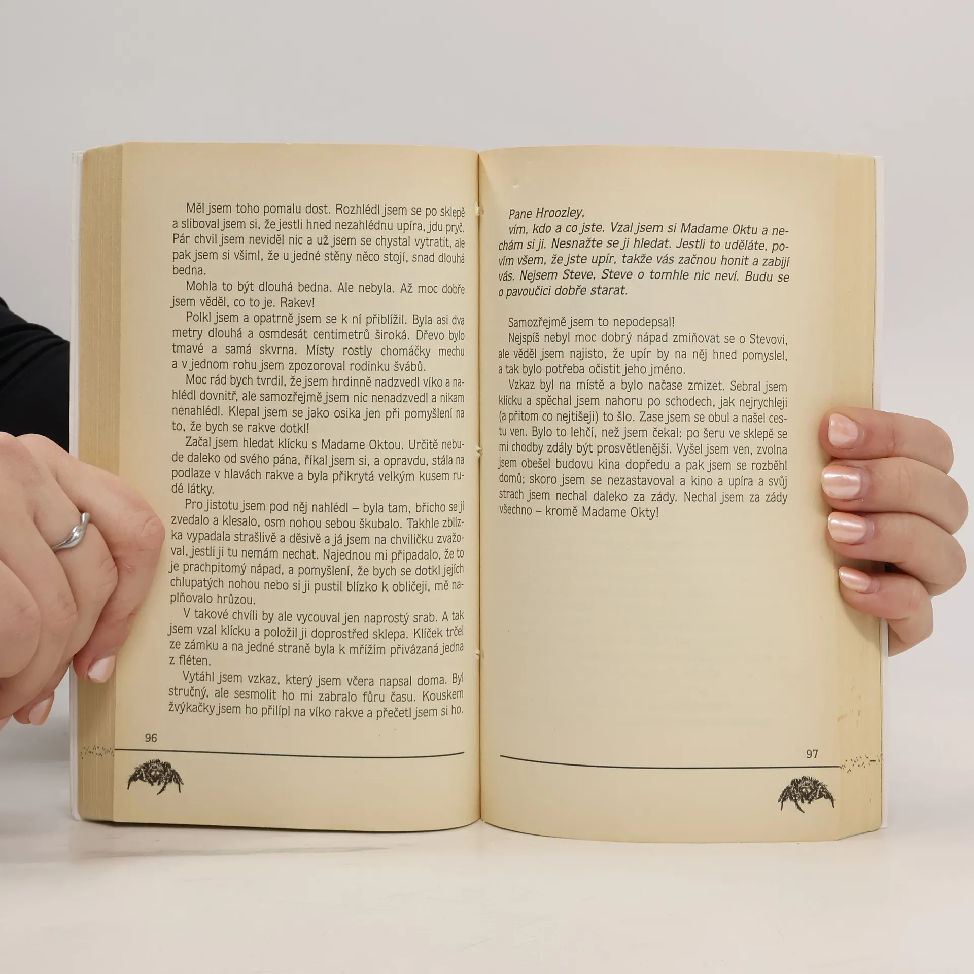 První kniha série Příběhy Darrena Shana. Spolužáci Darren a Steve si navzdory varování svého učitele nenechají ujít neobvyklé představení v utajovaném Cirku Mostruoso, o kterém si přečetli na nalezeném letáku. Oba chlapci jsou představením uchváceni - Darren cvičenou pavoučicí, Steve jejím cvičitelem Hroozleym, který mu připomíná upíra z jedné knížky. Ve 33 kapitolách, do nichž Darren své vyprávění vtěsnal, stíhá jako v horečnatém snu jedna noční můra druhou a oba kamarádi se ocitnou v ohrožení života.