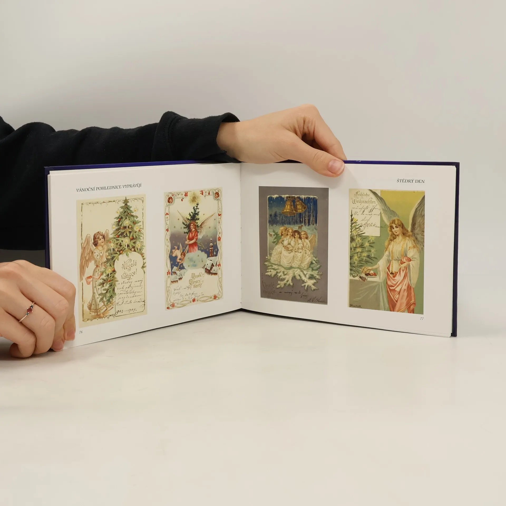 Publikace netradičního obdélníkového formátu na křídovém papíře obsahuje 150 barevných fotografií historických pohlednic, které jsou rozděleny do tří tématických okruhů: - pohlednice k Mikuláši (celkem 13) - pohlednice k Vánočním svátkům (celkem 97) - pohlednice k Novému roku (celkem 40) V knížce jsou i příklady sdělení psaných na pohlednicích. Úvodní doprovodný text "O skromných poslech lásky a pokoje" je přeložen do němčiny i do angličtiny. Další doprovodné texty (již logicky pouze v češtině) jsou mikulášský příběh "Andělíček" , "Pidimužíčkův Štědrý večer", ˇPři změně letopočtu" (Úvaha z 1. ledna 1906) a závěrečný krátký text "Pohlednice - předmět sběratelského zájmu".