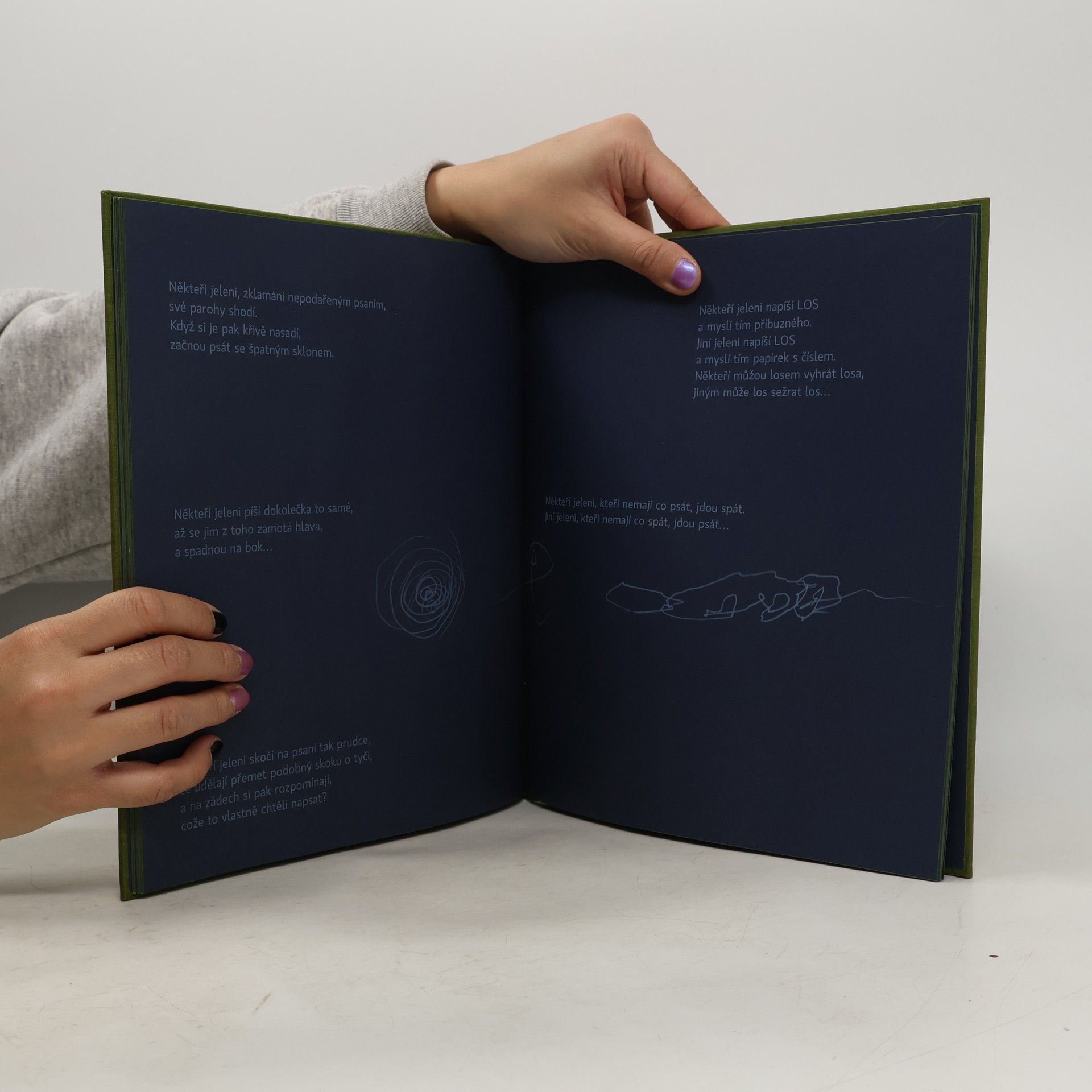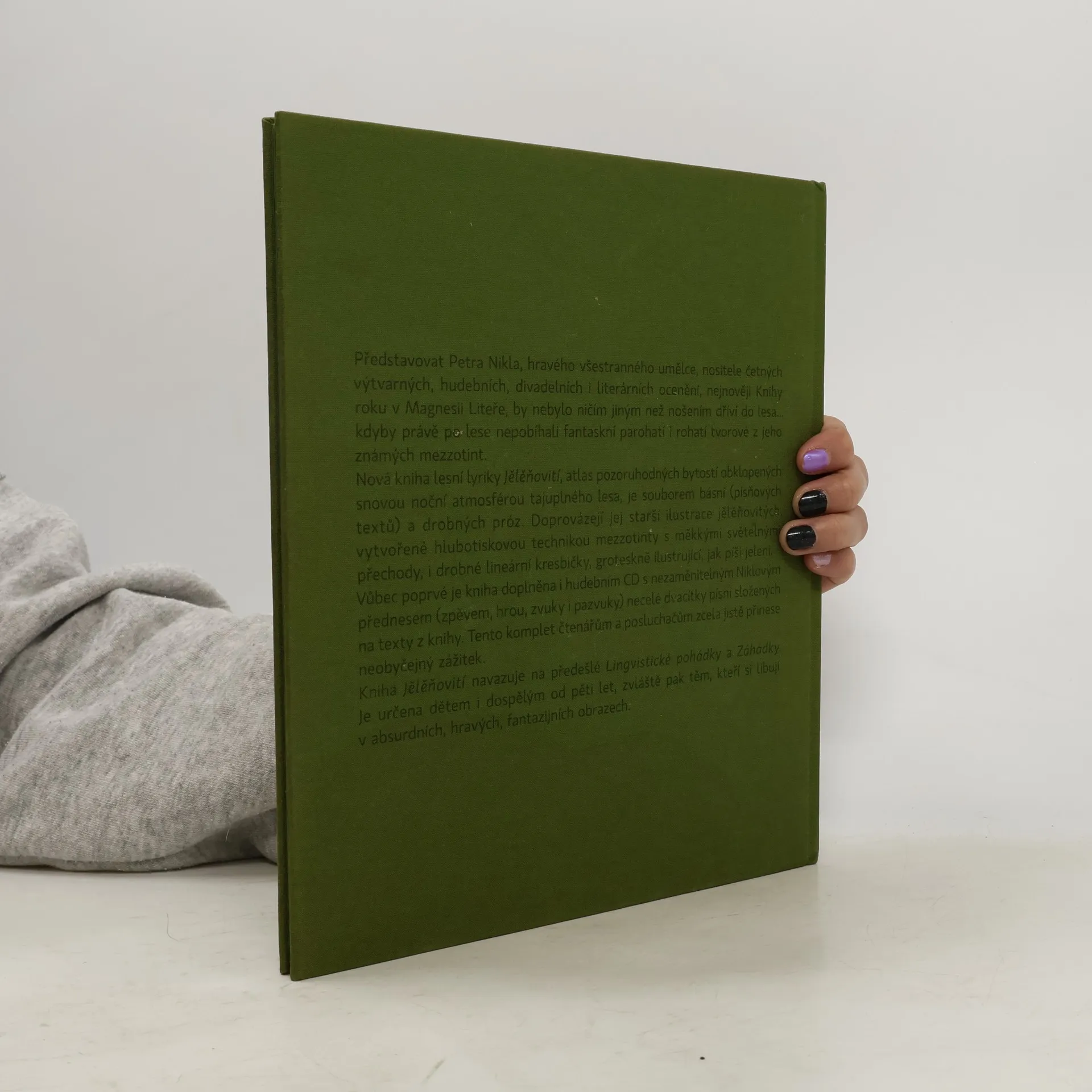 Představovat Petra Nikla, hravého všestranného umělce, nositele četných výtvarných, hudebních, divadelních i literárních ocenění, nejnověji Knihy roku v Magnesii Liteře, by nebylo ničím jiným než nošením dříví do lesa... kdyby právě po lese nepobíhali fantaskní parohatí i rohatí tvorové z jeho známých mezzotint. Nová kniha lesní lyriky Jělěňovití, atlas pozoruhodných bytostí obklopených snovou noční atmosférou tajůplného lesa, je souborem básní (písňových textů) a drobných próz. Doprovázejí jej starší ilustrace jělěňovitých, vytvořené hlubotiskovou technikou mezzotinty s měkkými světelnými přechody, i drobné lineární kresbičky, groteskně ilustrující, jak píší jeleni. Tento komplet čtenářům a posluchačům zcela jistě přinese neobyčejný zážitek. Kniha Jělěňovití navazující na předešlé Lingvistické pohádky a Záhádky je určena dětem i dospělým od pěti let, zvláště pak těm, kteří si libují v absurdních, hravých a fantazijních obrazech. --------------------------------------------------------------------------------