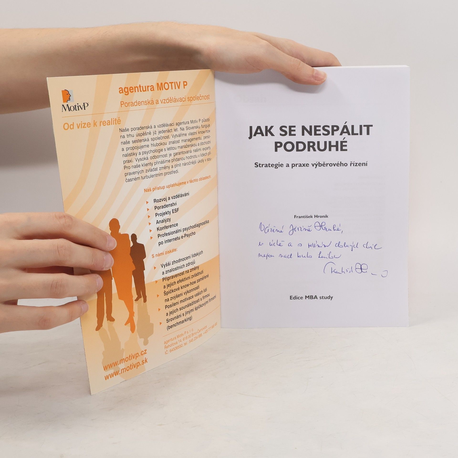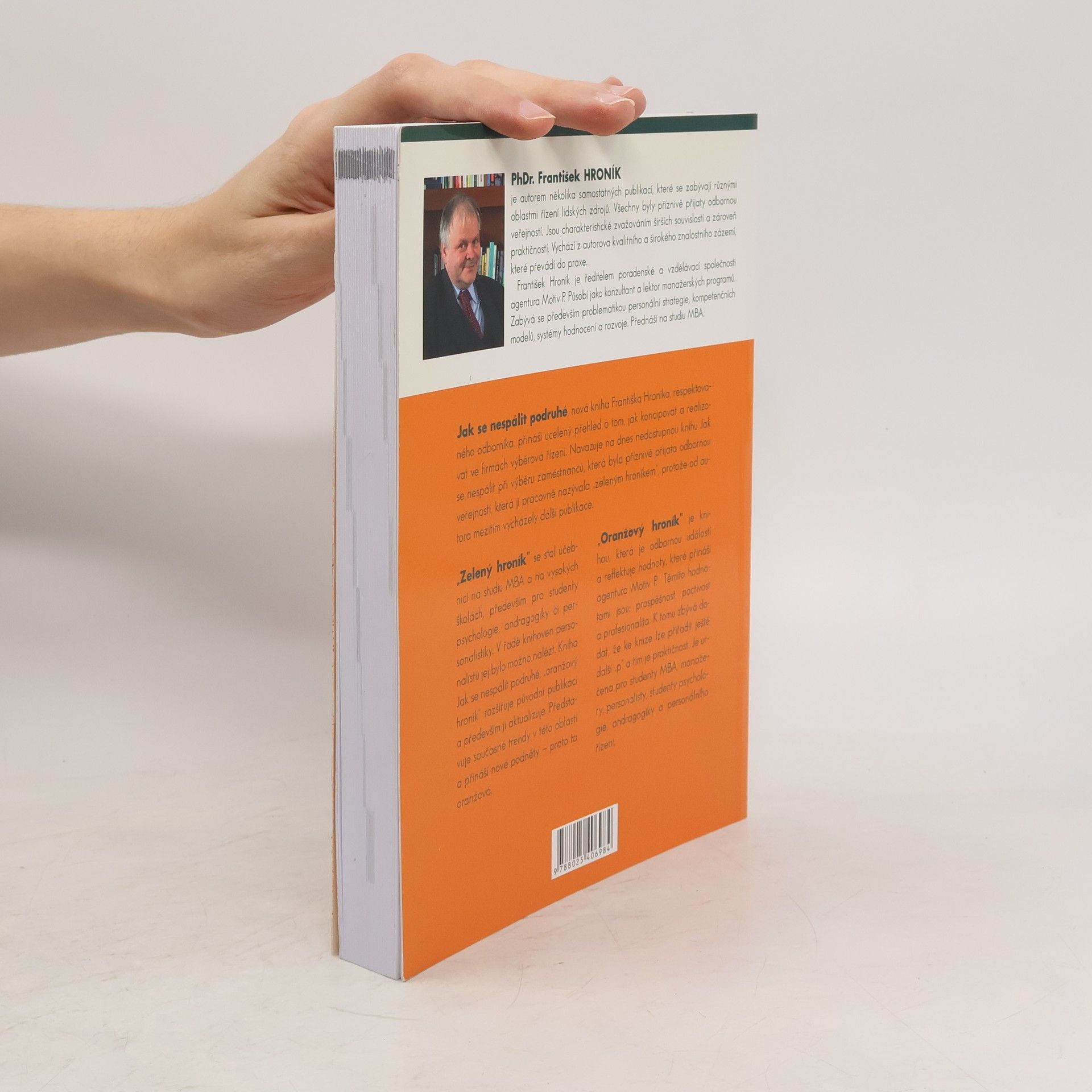 Jak se nespálit podruhé, nová kniha Františka Hroníka, respektovaného odborníka, přináší ucelený přehled o tom, jak koncipovat a realizovat ve firmách výběrové řízení. Navazuje na dnes nedostupnou knihu Jak se nespálit při výběru zaměstnanců, která byla příznivě přijata odbornou veřejností, která ji pracovně nazývala zeleným hroníkem, protože od autora vycházely další publikace. Oranžový hroník je knihou, která je odbornou událostí a reflektuje hodnoty, které přináší agentura Motiv P. Těmito hodnotami jsou: prospěšnost, poctivost a profesionalita. K tomu zbývá dodat, že ke knize lze přidat ještě další p a tím je praktičnost. Je určena pro studenty MBA, manažery, personalisty, studenty psychologie, andragogiky a personálního řízení.