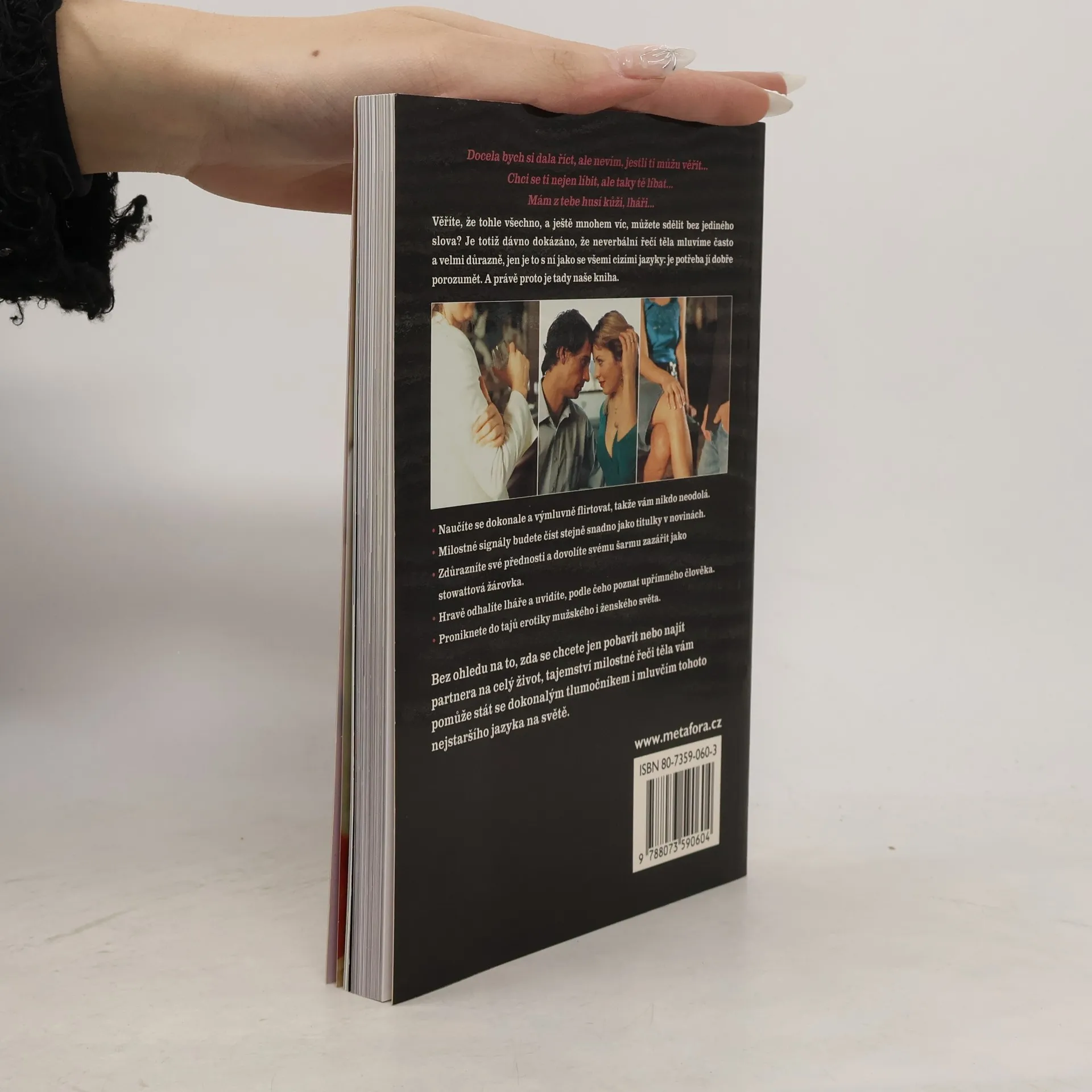 Tajemství svádění a milostných her Učebnice "nejstarší řeči světa", která vám odhalí taje mimoslovních erotických signálů. Docela bych si dala říct, ale nevím, jestli ti můžu věřit… Chci se ti nejen líbit, ale taky tě líbat… Mám z tebe husí kůži, lháři… Věříte, že tohle všechno, a ještě mnohem víc, můžete druhým sdělit bez jediného slova? Je totiž dávno dokázáno, že neverbální řečí těla mluvíme často a velmi důrazně, jen je to s ní jako se všemi cizími jazyky: je potřeba jí dobře rozumět. A proto je tady naše kniha. Naučíte se dokonale a výmluvně flirtovat. Milostné signály budete číst stejně snadno jako titulky v novinách. Zdůrazníte své přednosti a dovolíte svému šarmu zazářit jako stowattová žárovka. Hravě odhalíte lháře a uvidíte, podle čeho poznat upřímného člověka. Proniknete do tajů erotiky mužského i ženského světa. Přestože jde o vážnou vědu, kniha je napsaná lehkou zábavnou formou, takže se u ní často zasmějete. Množství názorných barevných fotografií vám zase pomůže zorientovat se v bludišti lidských milostných náznaků a vyzkoušet si jejich čtení prozatím alespoň nanečisto.