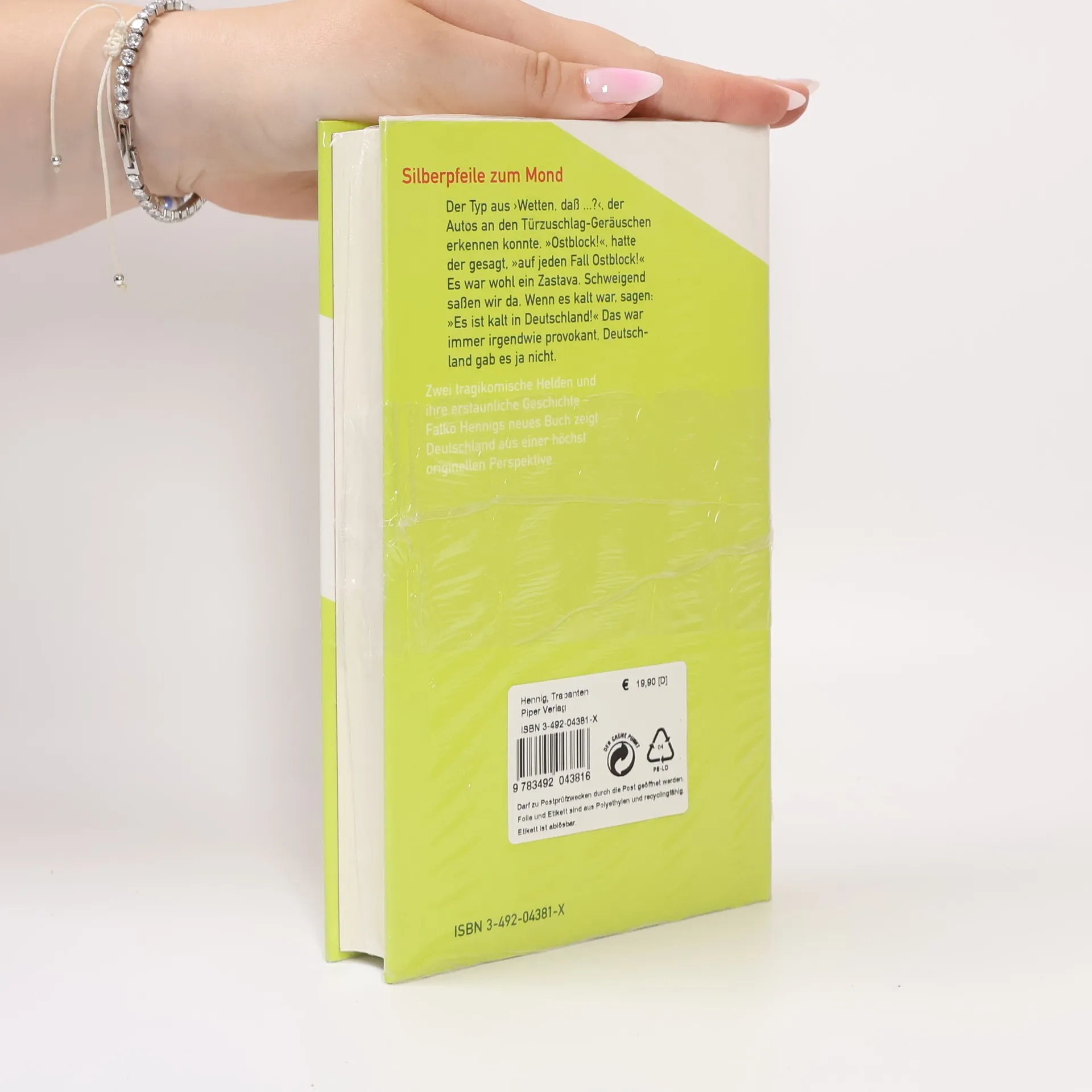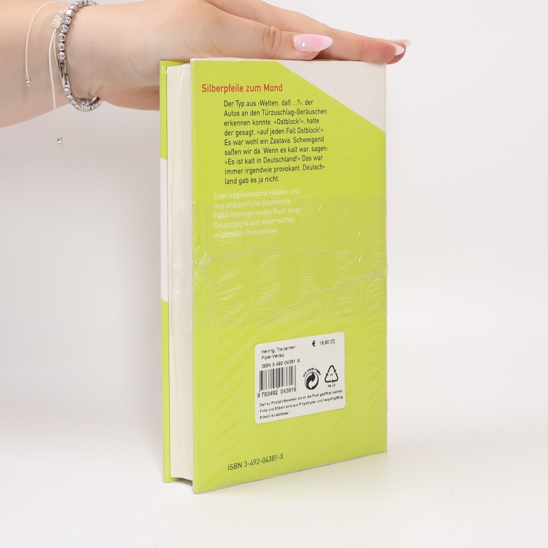 "Es gab Püppchen mit großem, gestricktem Rock oder gehäkelte Zylinderhüte, unter denen Klopapierrollen versteckt waren. Oder Kissen mit gestrickten Bezügen, darauf das Nummernschild mit dem richtigen Kennzeichen, man konnte es mit dem Original vergleichen.§Auf anderen Hutablagen auch noch Wackeldackel und Wackelboxer, das Messemännchen mit einer Pfeife im Mund, der kugelrunde Kopf war voller riesiger Leberflecken. Dabei waren es gar keine Leberflecken, sondern die Kontinente, der Kopf war ein Globus. Sehr selten waren zu Weihnachten hinten kleine Weihnachtsbäumchen mit leuchtenden bunten Lichtern. Vorn waren Thermometer aller Art, kleine Kilometerzähler. Auf dem Armaturenbrett oft festgeklebt war eine Schneekugel. Richtig konnte es darin erst schneien, wenn das Auto einen Abhang runterrollte.§Manche hatten sich beim Trabbi extra eine Tankanzeige eingebaut. Doch unser orangener Trabant hatte so etwas nicht."