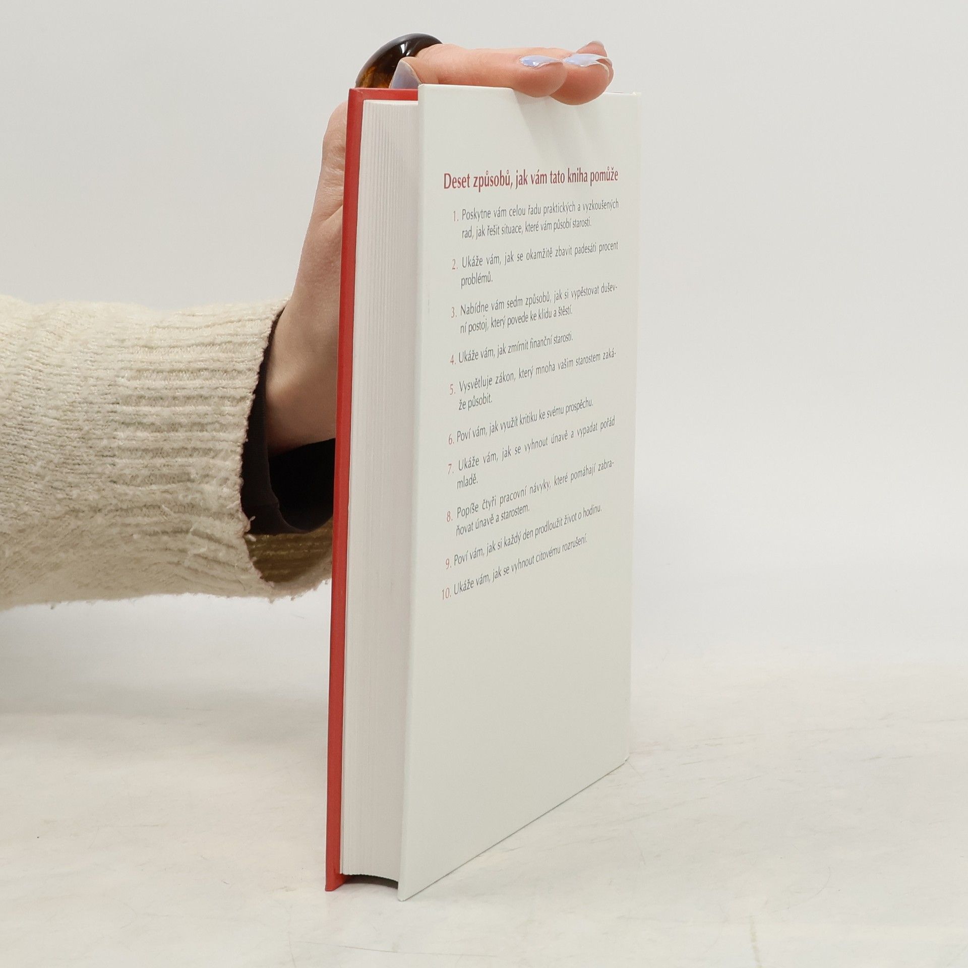Deset způsobů, jak vám tato kniha pomůže: 1. Poskytne vám celou řadu praktických a vyzkoušených rad, jak řešit situace, které vám působí starosti. 2. Ukáže vám, jak se okamžitě zbavit padesáti procent problémů. 3. Nabídne vám sedm způsobů, jak si vypěstovat duševní postoj, který povede ke klidu a štěstí. 4. Ukáže Vám, jak zmírnit finanční starosti. 5. Vysvětluje zákon, který mnoha vašim starostem zakáže působit. 6. Poví vám, jak využít kritiku ke svému prospěchu. 7. Ukáže vám, jak se vyhnout únavě a vypadat pořád mladě. 8. Popíše čtyři pracovní návyky, které pomáhají zabraňovat únavě a starostem. 9. Poví vám, jak si každý den prodloužit život o hodinu. 10. Ukáže vám, jak se vyhnout citovému rozrušení. (méně textu)
