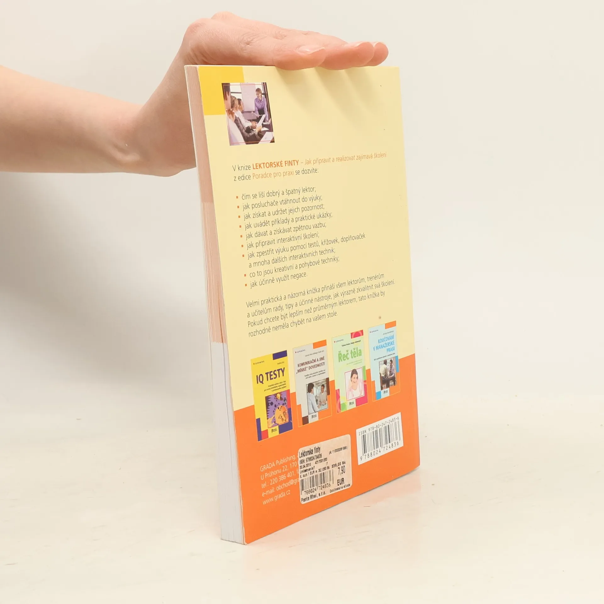 Praktická a názorná knížka přináší zejména začínajícím lektorům, trenérům a učitelům tipy a příklady, jak zkvalitnit svá školení. Dozvíte se, čím se liší dobrý a špatný lektor, jak posluchače vtáhnout do výuky, jak získat a udržet jejich pozornost, jak uvádět příklady a dávat zpětnou vazbu. Hlavní pozornost je věnována interaktivitě při výuce, které se řada lektorů stále brání. Autorka na ukázkách představuje hlavní interaktivní techniky - testy, křížovky, kvízy, kreativní a pohybové techniky, využití negace a další.