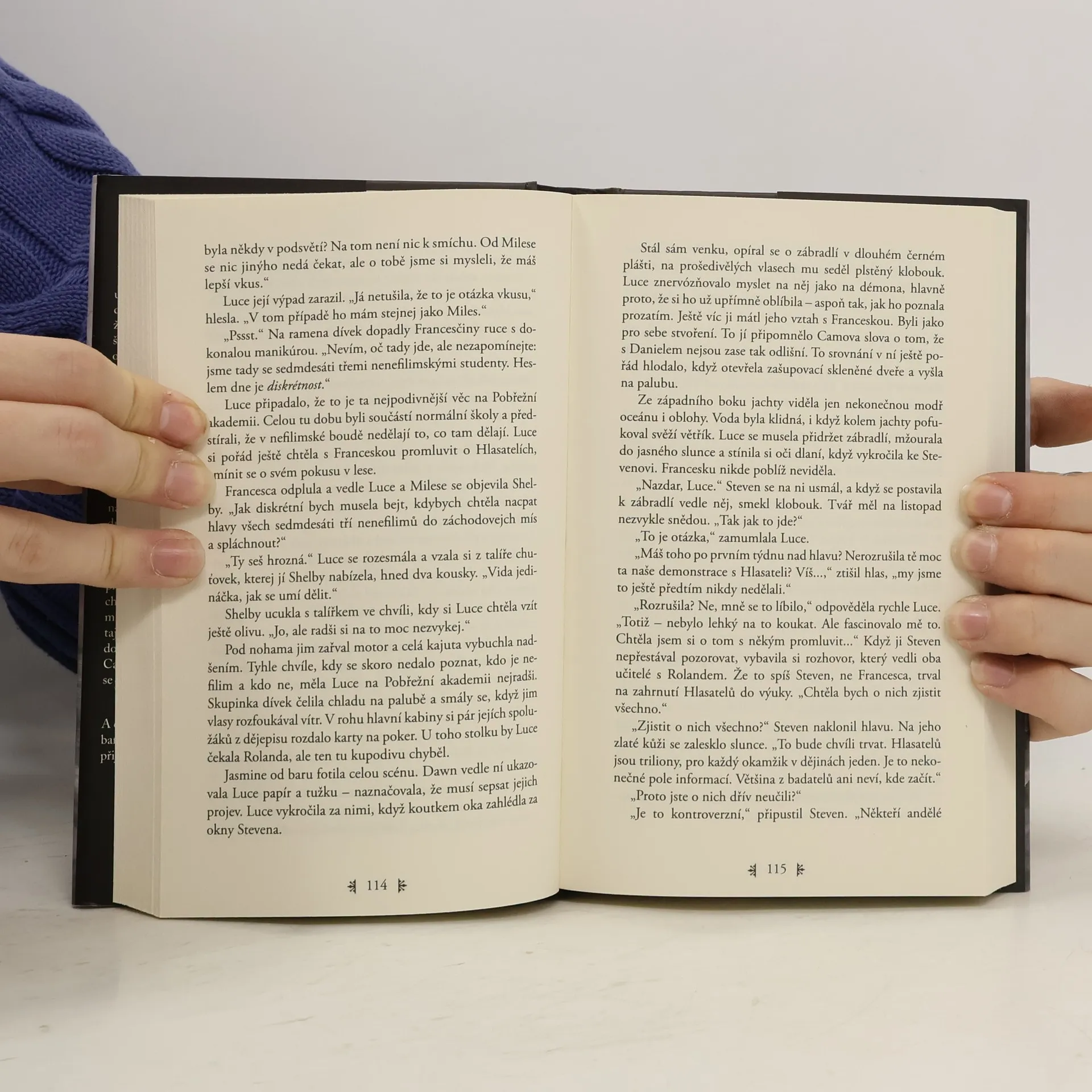 Nebezpečné, vzrušující a tajemné romantické dobrodružství Padlých andělů pokračuje v knize Muka. Druhou část série, ve které láska nikdy neumírá, napsala opět Lauren Kateová. Luce prožívá peklo na zemi. Trvalo dlouho, než našla svou pravou lásku, padlého anděla Daniela. Ten teď tvrdí, že ji musí opustit. Jeho úkolem je jít a bojovat proti Vyhnancům, nesmrtelným, kteří Luce usilují o život. Daniel ji ukryje ve škole na skalnatém kalifornském pobřeží. Jejími spolužáky jsou nezvykle nadaní studenti – Nefilim, potomci padlých andělů a lidí. A Daniel odchází hledat nesmrtelné… Luce se ve škole konečně dozví, co jsou ony záhadné stíny, které vídá od dětství, a jak může s jejich pomocí nahlédnout do minulých životů. Ale čím více se rozšiřují její znalosti, tím víc podezřívá Daniela, že jí neprozradil všechno. Něco skrývá, něco nebezpečného. A co když jí lhal o minulosti? Luce začne mít podezření, že ve skutečnosti je její osud jiný. Předurčeným vyvoleným nemusí být právě Daniel.