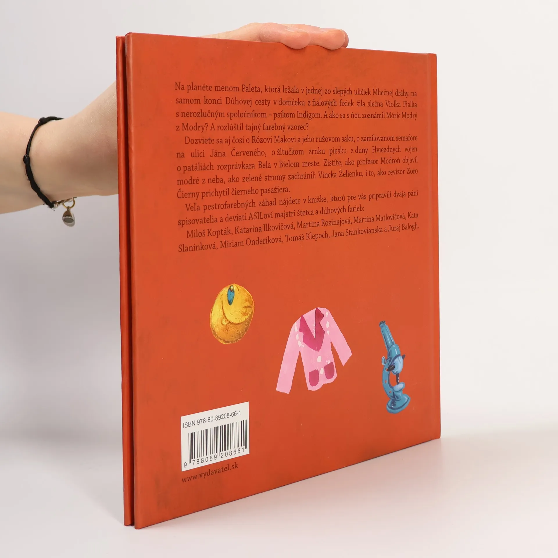 Na planéte menom Paleta, ktorá ležala v jednej zo slepých uličiek Mliečnej dráhy, na samom konci Dúhovej cesty v domčeku z fialových fixiek žila slečna Violka Fialka s nerozlučným spoločníkom – psíkom Indigom. A ako sa s ňou zoznámil Móric Modrý z Modry? A rozlúštil tajný farebný vzorec? Dozviete sa aj čosi o Rózovi Makovi a jeho ružovom saku, o zamilovanom semafore na ulici Jána Červeného, o žltučkom zrnku piesku z duny Hviezdnych vojen, o patáliách rozprávkara Bela v Bielom meste. Zistíte, ako profesor Modroň objavil modré z neba, ako zelené stromy zachránili Vincka Zelienku, i to, ako revízor Zoro Čierny prichytil čierneho pasažiera. Veľa pestrofarebných záhad nájdete v knižke, ktorú pre vás pripravili dvaja páni spisovatelia a deviati ASIlovi majstri štetca a dúhových farieb: Miloš Kopták, Katarína Ilkovičová, Martina Rozinajová, Martina Matlovičová, Kata Slaninková, Miriam Onderíková, Tomáš Klepoch, Jana Stankovianska a Juraj Balogh.