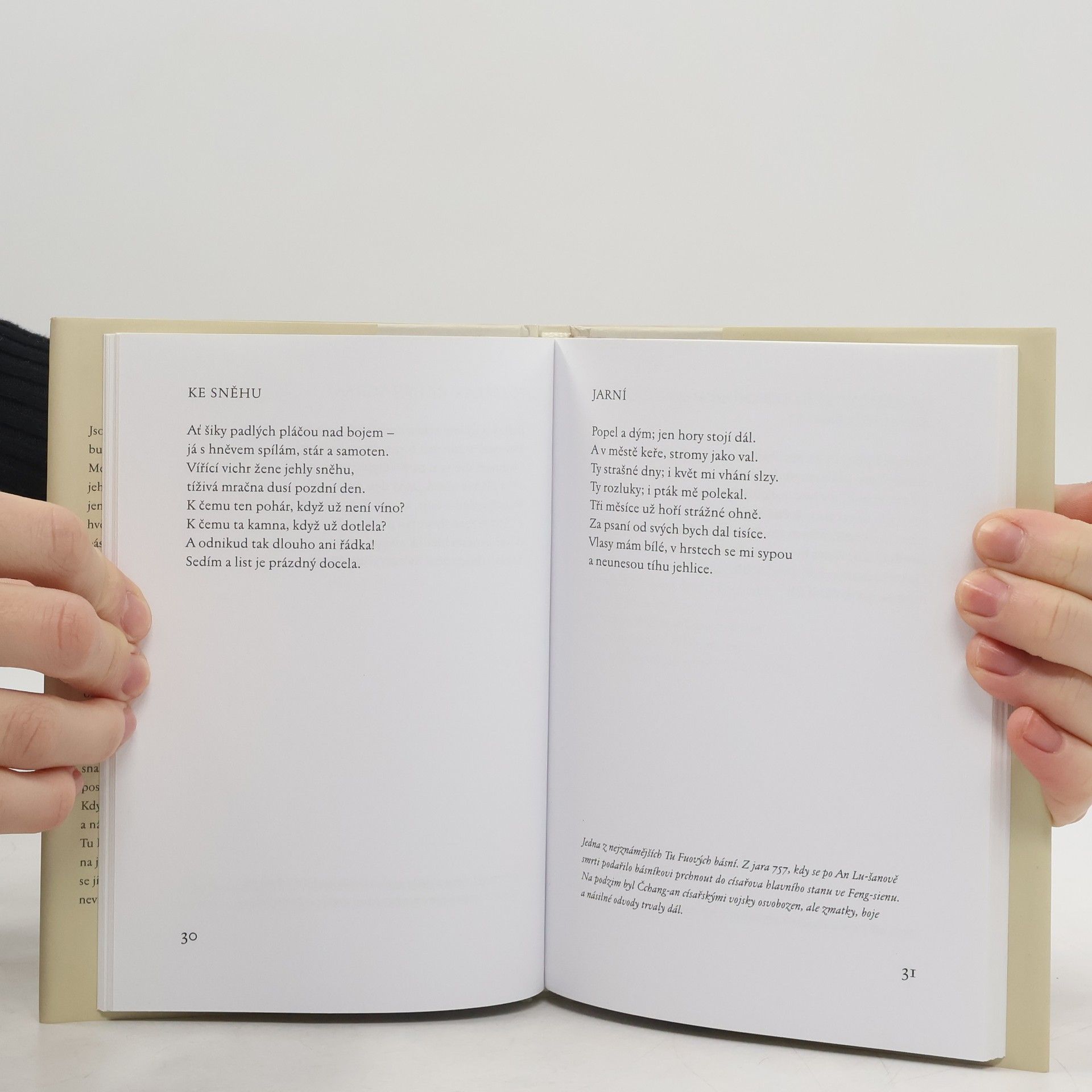 Český čtenář s potěšením spočine zrakem na verších patrona čínské poezie Tu Fua ve skvostném přebásnění Jana Vladislava. Tu Fu, který žil v období dynastie Tang (712–770), představuje spolu se svým současníkem Li Poem dva kulminační body čínského básnictví. Jeho mladistvá tvorba je ve znamení nebývale svěžích romantických veršů o přírodě, o víně, o přátelích. Později, pod tlakem doby, kdy Čína trpěla hladem, válkami a bídou a básník strádal na útěku před vzbouřenci, odloučený od rodiny, proměnil se tón i témata jeho poezie, v níž převážila tesknota a chmury v kriticky a protiválečně zaměřených básních.