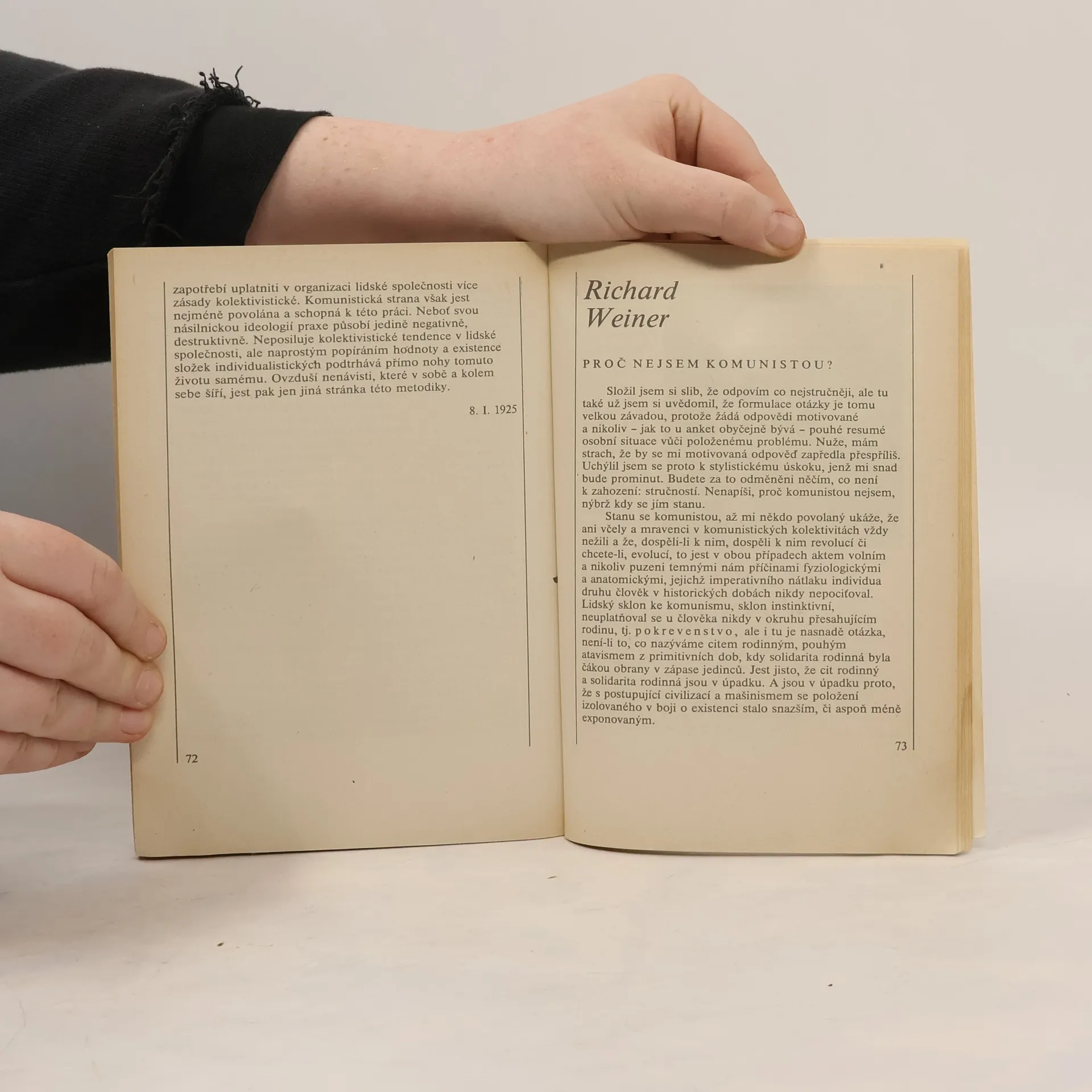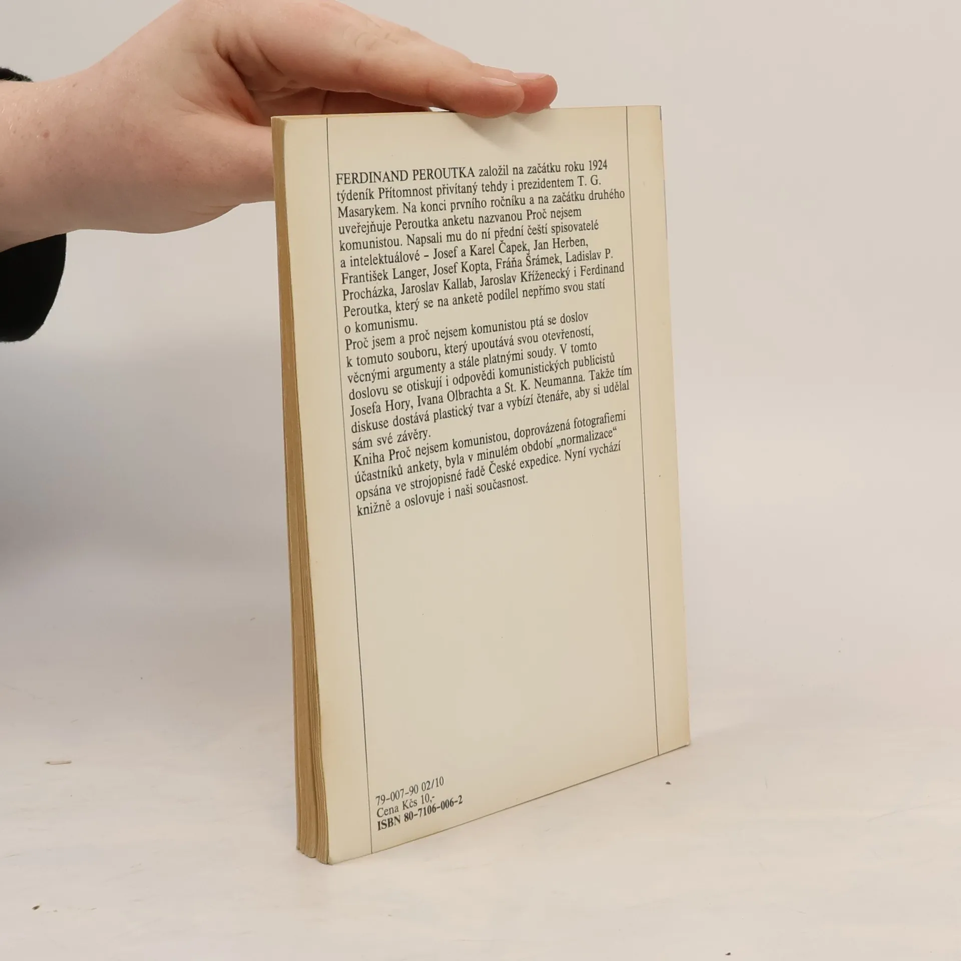 Knihu uspořádal a doslovem opatřil J. Hořec. Odpovědi na otázku Proč nejsem komunistou? Uveřejnili v periodiku Přítomnost v roce 1924 až 1925 následující osobnosti: K. Čapek, F. Langer, L. P. Procházka, F. Šrámek, J. Kopta, J. Čapek, J. Herben, J. Kallaba, J. Kříženecký, R. Weiner, a F. Peroutka. Do knihy jsou zařazena i tři stanoviska levicových autorů na probíhající anketu v Přítomnosti, která byla uveřejněna v Rudém právu a dalších novinách komunistické strany. Jedná se o články J. Hory, S. K. Neumanna a I. Olbrachta.
