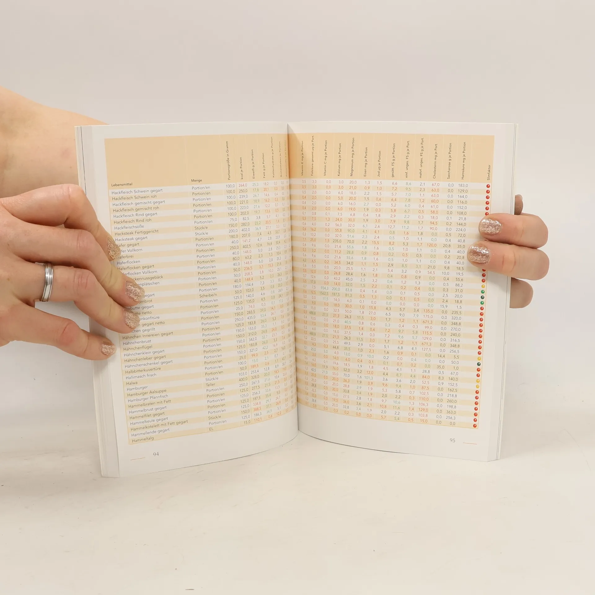 Gesunde Ernährung. Inhaltsstoffe unserer Lebensmittel. Diätetik - Ernährung bei Krankheiten. Kalorien- und Nährwerttabelle. Kalorien, Eiweiß, Fett, Kohlenhydrate, Broteinheiten, Ballaststoffe, Vitamin E, Folsäure, Vitamin C, Kalzium, Magnesium, Eisen, Jod, gesättigte, einfach ungesättigte und mehrfach ungesättigte Fettsäuren, Cholesterin, Zucker, Harnsäure - portionsweise Angabe zu jedem Lebensmittel. Mit extra Slimfaktor. Markenprodukte mit Angaben zu Fett, Cholesterin und Kohlenhydraten in einer extra Tabelle.