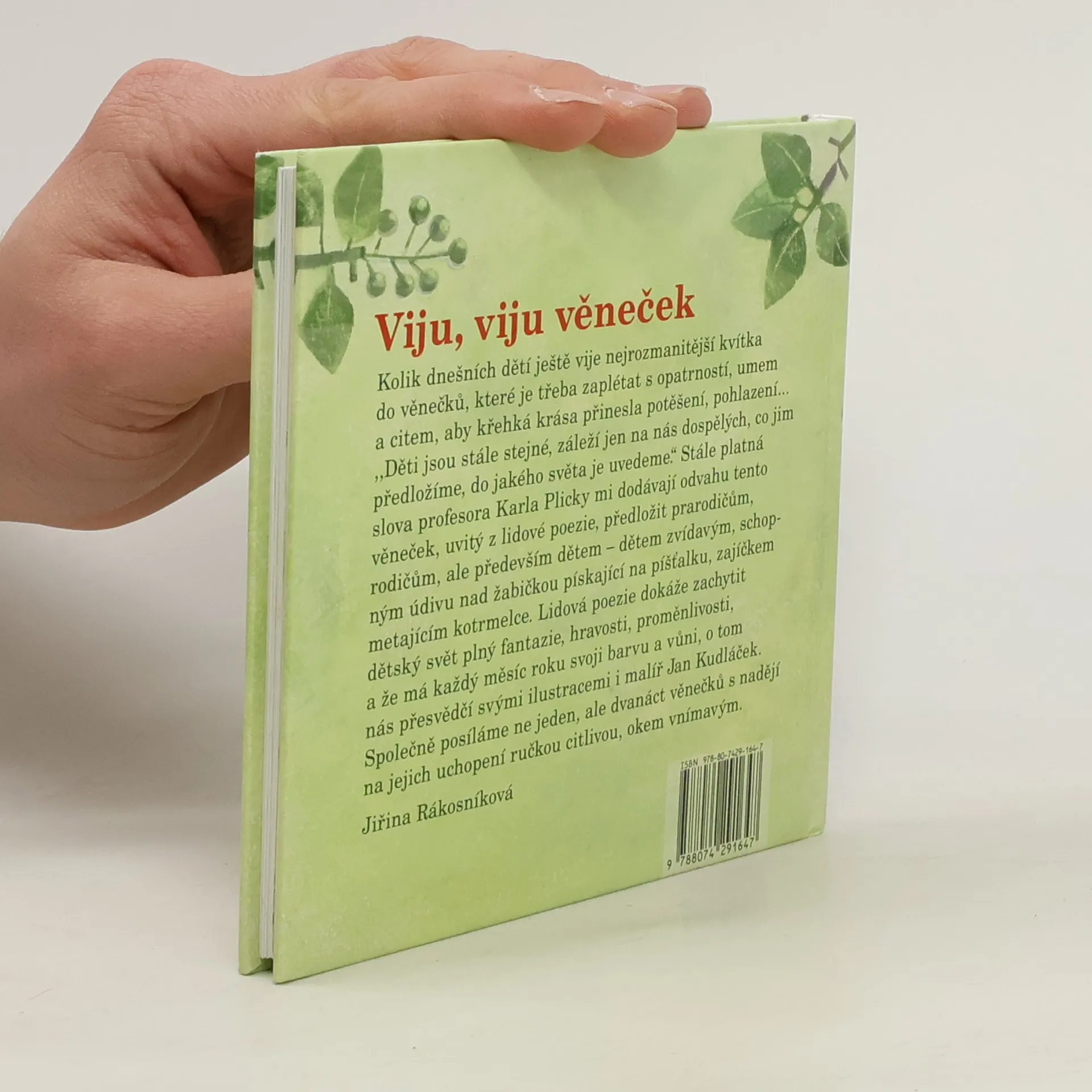 Dětská knížka Viju, viju věneček od oblíbených autorů Jiřiny Rákosníkové a Jana Kudláčka. Pletla v kytku rozmarýnu,devatero divný květ, házela je po voděnce, aby plula v širý svět…ano, tak jako se házely věnečky zaplétané z nejrozmanitějších kvítků po vodě s nadějí, že přinesou pozdravení, potěšení milované osobě, tak i já posílám po pomyslné čisté voděnce věneček těch nejprostších veršů, říkadel, které vytryskly doslova z touhy vyjádřit momentální náladu, pocit. Doba i společnost se přirozeně mění, ale jsem přesvědčena, že ona potřeba čistoty a krásy, krásy prosté, zbavené všech pozlátek přetrvává.Kéž by tento věneček, upletený z obdivu a úcty k odkazu našich předků, našel své adresáty, kteří jej nejen z onoho pomyslného proudu vyloví, ale též rozeznají krásu i vůni vpletených kvítků lidové poezie.
