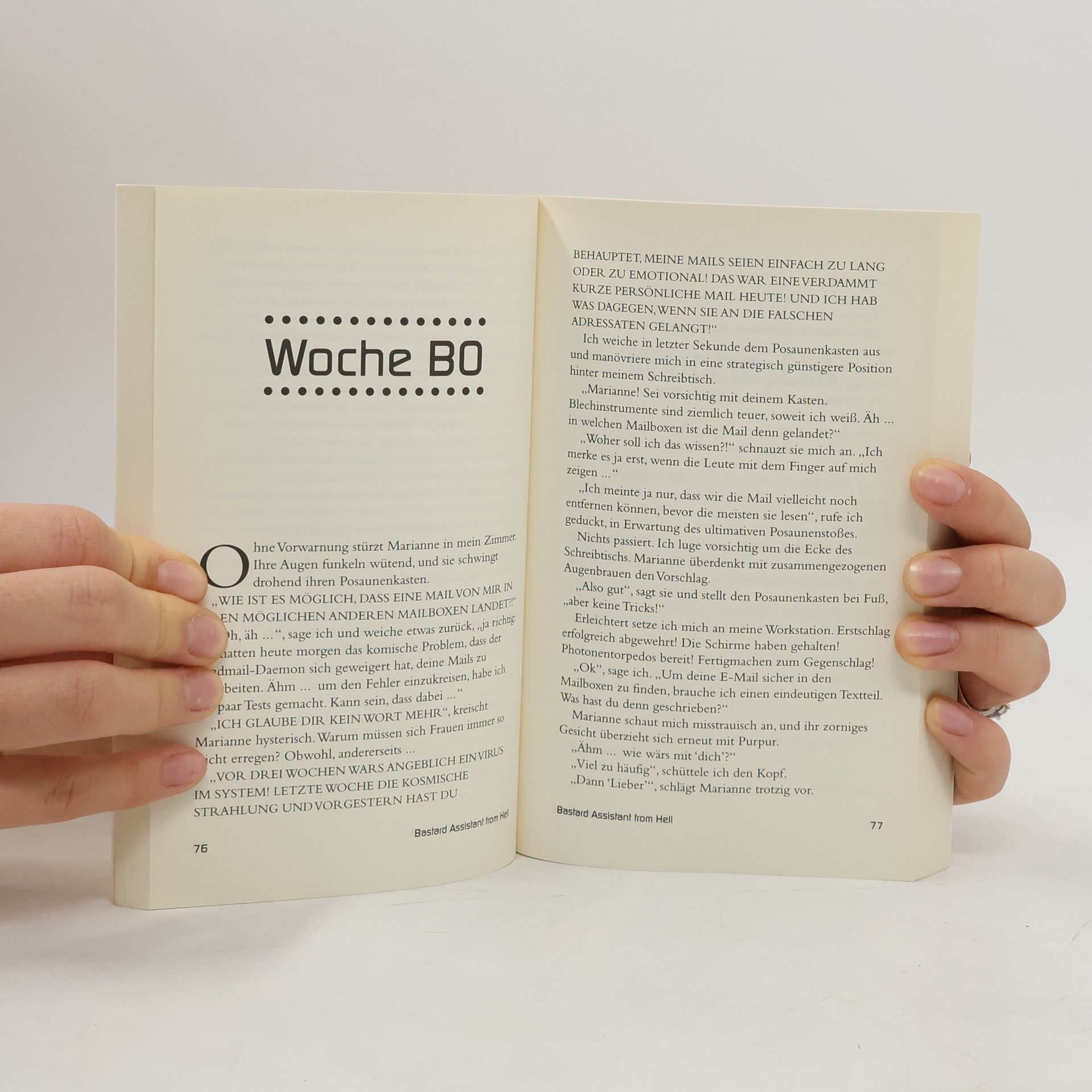 Deutsche Universitäten und ihre Belegschaften gelten gemeinhin als ziemlich humorlose Veranstaltungen -, doch ein kleines Münchner Institut scheint diese Auffassung zu widerlegen, seit dort der „Bastard Assistant from Hell“ sein Unwesen treibt. Mit viel Sarkasmus und bösartigem Witz macht er seinem Chef, seinen Kollegen und nicht zuletzt seinen Studenten das sonst oft so beschauliche akademische Alltagsleben zu einer privaten kleinen Hölle, in der nie etwas so funktioniert, wie es sollte, nie etwas einfach erledigt wird, wenn es auch kompliziert geht, und kein Tag vergeht, ohne das eine mittlere Katastrophe über den Leerstuhl, äh Lehrstuhl, hereinbricht. Dazu kommt noch, dass B. A. f. H. das ganze Institut unerbittlich im Griff hält, weil nur er allein das Superuser-Passwort aller Institutsrechner kennt. Zu seinen Lieblingsbeschäftigungen zählt das Abwimmeln von Studenten bei gleichzeitigem Anlocken von hübschen Studentinnen. Dann hängt er vielleicht mal wieder das Schild „NOTFALL BEIM S. O. P. L.“ vor seine Tür. Natürlich weiß niemand, was S. O. P. L. heißt, klingt aber arbeitsintensiv. Und zur Entlastung seiner Telefonleitung legt er gerne mal den „DUMMY MODE ON“. „Der Bestseller im Netz!“ Tomorrow „Ja, im Netz entsteht Druckbares! Jetzt haben es auch die Verlage bemerkt.“ Berliner Zeitung