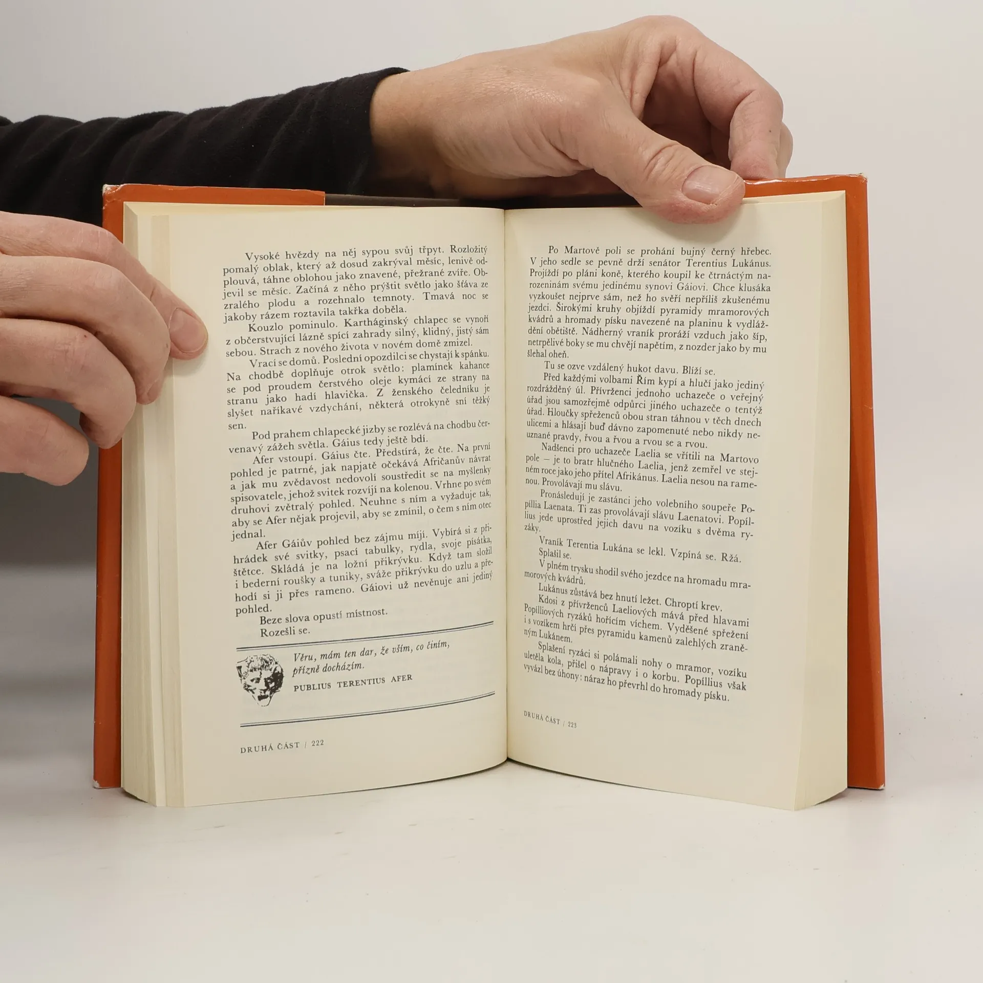 Román z prostředí starého Říma v období mezi druhou a třetí punskou válkou. Hlavním hrdinou románu je Publius Terentius Afer, jehož komedie, psané podle řeckých vzorů, ovlivnily spolu s díly Pautovými a Aristofanovými vývoj světového dramatického umění. V útlém dětství byl spolu se synky nejbohatších rodin Kartága poslán vítězným Římanům darem jako otrok a jeho jediným štěstím bylo, že si jej vybral senátor Terentius Lucanus, jenž nejen že mu umožnil stejné vzdělání jako vlastnímu synovi, ale před smrtí jej propustil na svobodu. Život v domě Scipionově v kruhu nejvzdělanějších mužů Říma pak ještě více vytříbil chlapcův talent, takže z malého kartáginského otroka vyrostl nakonec jeden z nejslavnějších autorů římských komedií, píšící elegantní a vzornou latinou. (nakladatel)