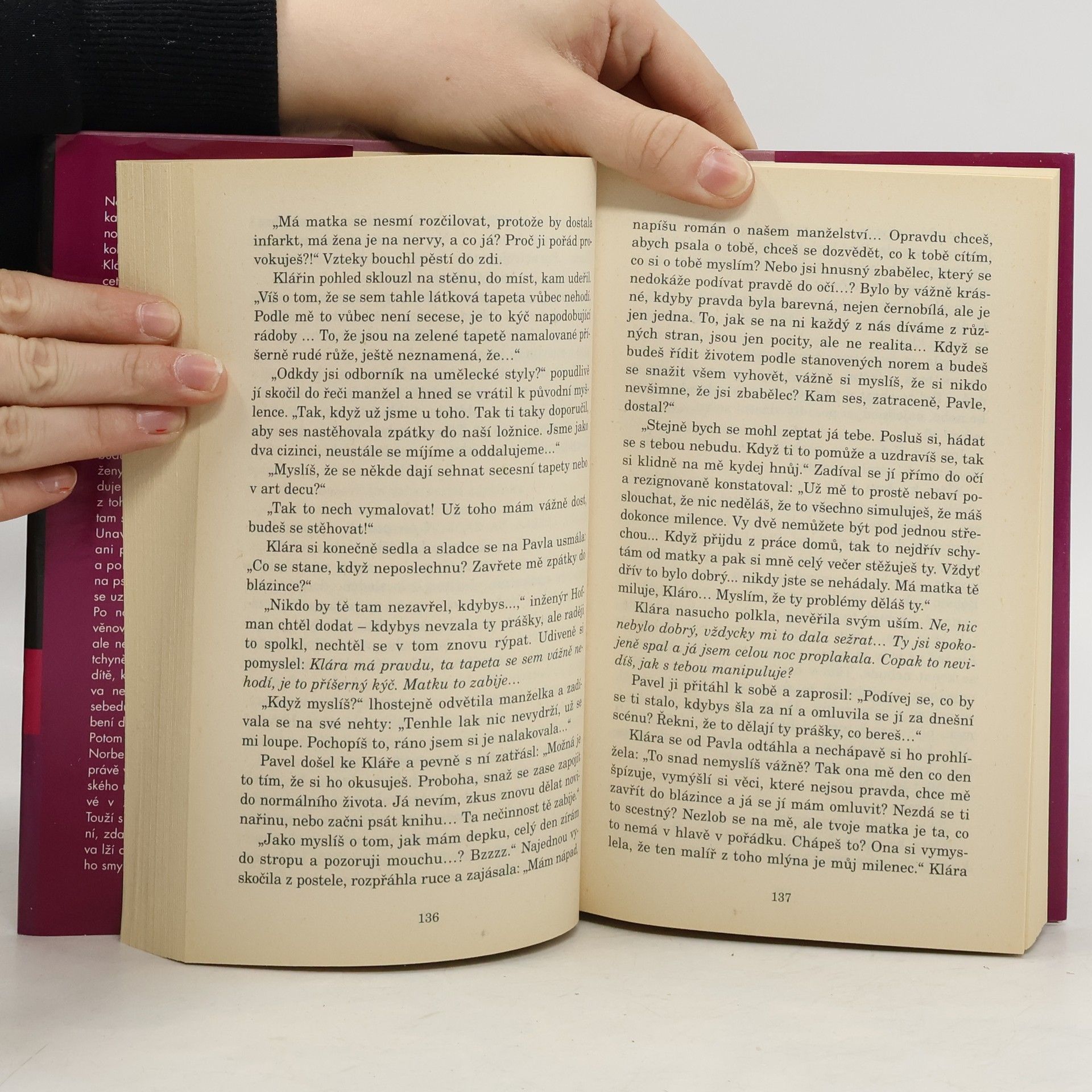 Na první pohled manželství jako každé jiné. Navíc inženýru Hofmanovi, náměstku ředitele banky, všichni kolegové jeho krásnou ženu závidí. Klára Hofmanová, atraktivní pětatřicetiletá tmavovláska, šéfredaktorka F-revue a autorka vyhledávaných sloupků a povídek o osudech žen, však prochází těžkou zkouškou. Nedokáže se vyrovnat se smrtí pětiletého synka a ztrácí smysl života. V dusné atmosféře rodinné secesní vily, kde bydlí pod stálým dohledem sobecké, kruté tchyně, v manželství, o němž ztratila poslední iluze, a po boku manžela, jenž si bezohledně buduje kariéru a psychický stav své ženy ani nezaznamená, pronásleduje Kláru jediná myšlenka: odejít z tohoto světa a konečně se někde tam setkat se svým Lukáškem. Unavená a zhroucená nedokáže psát, odchází ze zaměstnání a pokusí se o sebevraždu. Léčí se na psychiatrické léčebně a pomalu se uzdravuje. Po návratu domů se Klára snaží věnovat každodenním povinnostem, ale nesnesitelné psychické vydírání tchyně, tlak okolí, aby měla další dítě, které jí zhojí rány, a manželova nevěra znovu rozleptávají její sebedůvěru a přispívají k prohloubení duševní choroby. Potom se však v sousedství objeví Norbert, úspěšný malíř, který se právě vrátil ze Států. Klára bohémského umělce okouzlí a on se poprvé v životě zamiluje na první pohled. Touží s Klárou žít, ale záleží jen na ní, zda se dokáže vymanit z přediva lží a překročit práh do skutečného smysluplného života...