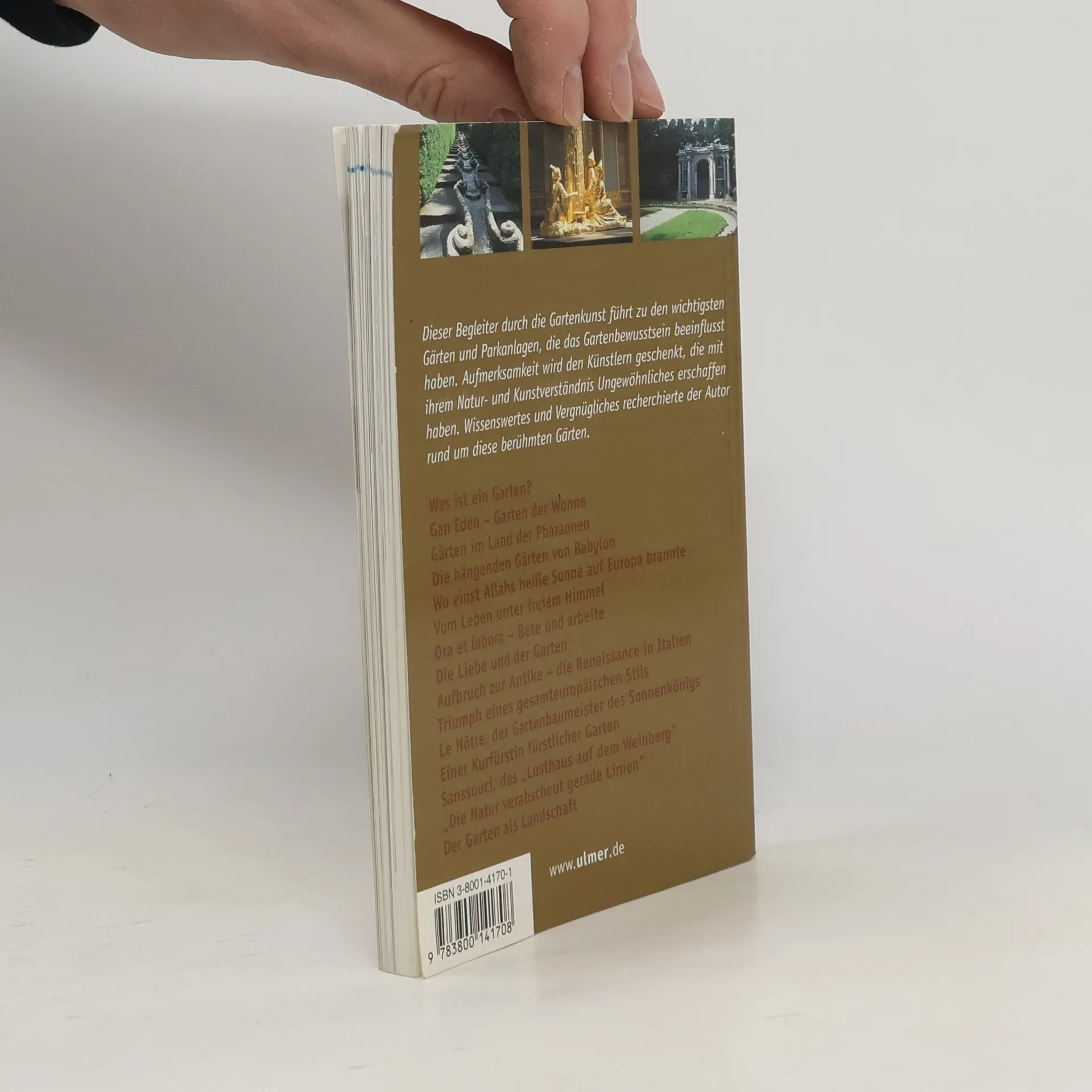 Gärten tragen das Gesicht ihrer Zeit, mit diesem Buch entdecken Sie es! Was sich heute als stiller Park präsentiert, könnte einst ein lautes Kunstwerk gewesen sein, das Macht und Einfluss des Eigentümers demonstrieren sollte. Die Entstehungsgeschichte eines Gartens und die Anekdoten, die über Gestalter und Auftraggeber kursieren, erläutern die Gestalt der Anlage ebenso wie das Verständnis von Kunst und Natur in der jeweiligen Epoche. Erzählt wird von den berühmten Gärten, die europäische Gartenkunst massgeblich beeinflussten. Hingewiesen wird auf die Besonderheiten der Gestaltung, die heute noch ablesbar sind. Gärten tragen das Gesicht ihrer Zeit, mit diesem Buch kann es entdeckt werden. Dieser Begleiter durch die Gartenkunst führt zu den wichtigsten Gärten und Parkanlagen, die das Gartenbewusstsein beeinflusst haben. Aufmerksamkeit wird den Künstlern geschenkt, die mit ihrem Natur- und Kunstverständnis Ungewöhnliches erschaffen haben. Wissenswertes und Vergnügliches recherchierte der Autor rund um diese berühmten Gärten.