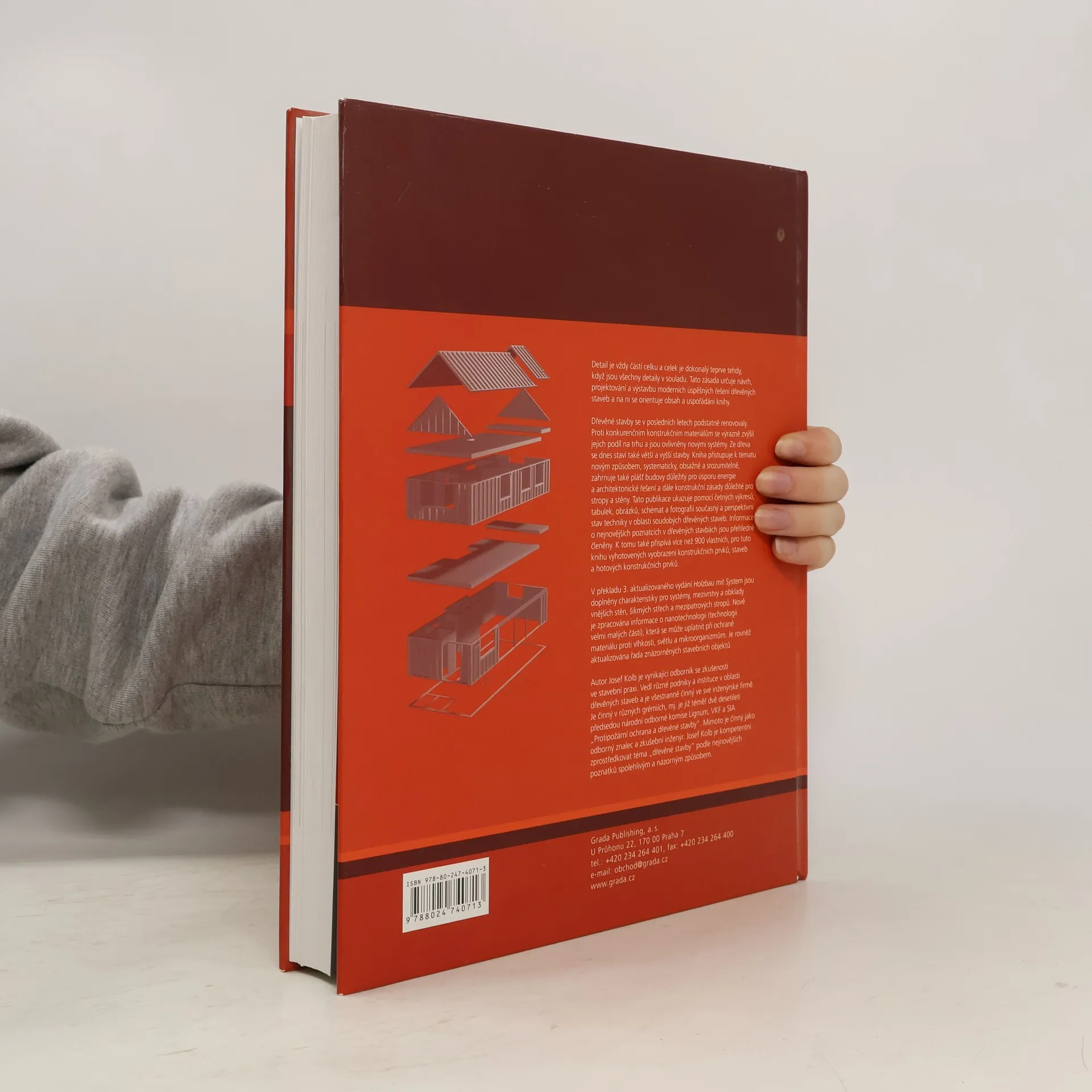 Publikace Josef Kolb Dřevostavby je překladem 3. aktualizovaného vydání ve Švýcarsku/Německu s německým názvem Holzbau mit System. Kniha ukazuje aktuální a výhledový stav techniky, který je úspěšně používán ve Švýcarsku, Německu a Rakousku - předních evropských zemích moderních dřevěných staveb - a v některých ohledech předbíhá svoji dobu. Jsou vysvětleny vzájemné vztahy mezi návrhem a konstrukcí od jednoduchých rodinných domů až po vícepodlažní velké budovy mj. na základě více než 900 obrázků a vlastních konstrukčních výkresů. Pozornost je věnována především rámovým, skeletovým a masivním dřevěným stavbám včetně stropů, dělících stěn a pláště budovy. V překladu tohoto nového vydání jsou doplněny charakteristiky pro systémy, mezivrstvy a obklady vnějších stěn, šikmých střech a mezipatrových stropů. Nově je zpracována informace o nanotechnologii (technologii velmi malých částí), která se může uplatnit při ochraně materiálu proti vlhkosti, světlu a mikroorganizmům. Je rovněž aktualizována řada znázorněných stavebních objektů.