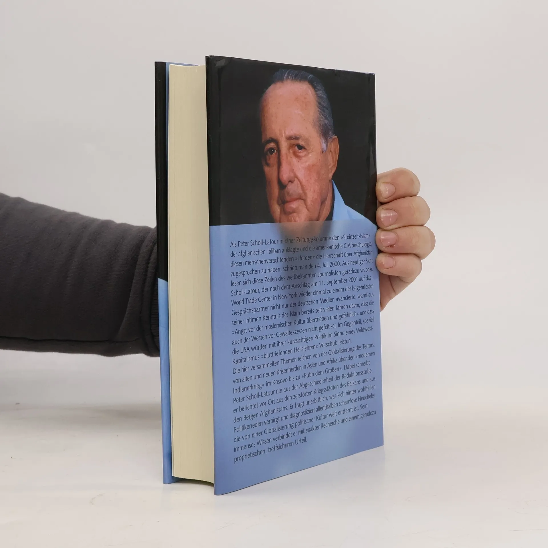 Als Peter Scholl-Latour in einer Kolumne den „Steinzeit-Islam“ der Taliban anprangerte und die CIA beschuldigte, diesen „Horden“ die Herrschaft über Afghanistan zugesprochen zu haben, war es der 4. Juli 2000. Rückblickend wirkt dieser Artikel des bekannten Journalisten visionär. Scholl-Latour, der nach den Anschlägen vom 11. September 2001 zu einem gefragten Gesprächspartner in den deutschen Medien wurde, warnt seit Jahren davor, dass die „Angst vor der moslemischen Kultur übertrieben und gefährlich“ sei und dass auch der Westen vor Gewaltexzessen nicht gefeit ist. Besonders die USA würden mit ihrer kurzsichtigen Politik „bluttriefenden Heilslehren“ Vorschub leisten. Die Themen seiner Beiträge reichen von der Globalisierung des Terrors und Krisenherden in Asien und Afrika bis zum „modernen Indianerkrieg“ im Kosovo und „Putin dem Großen“. Scholl-Latour schreibt nie aus der Abgeschiedenheit der Redaktionsstube, sondern berichtet vor Ort aus den zerstörten Kriegsstädten des Balkans und den Bergen Afghanistans. Politikerreden entlarvt er als schamlose Heuchelei, weit entfernt von einer globalisierten politischen Kultur. Sein immenses Wissen vereint er mit exakter Recherche und einem prophetischen Urteil.