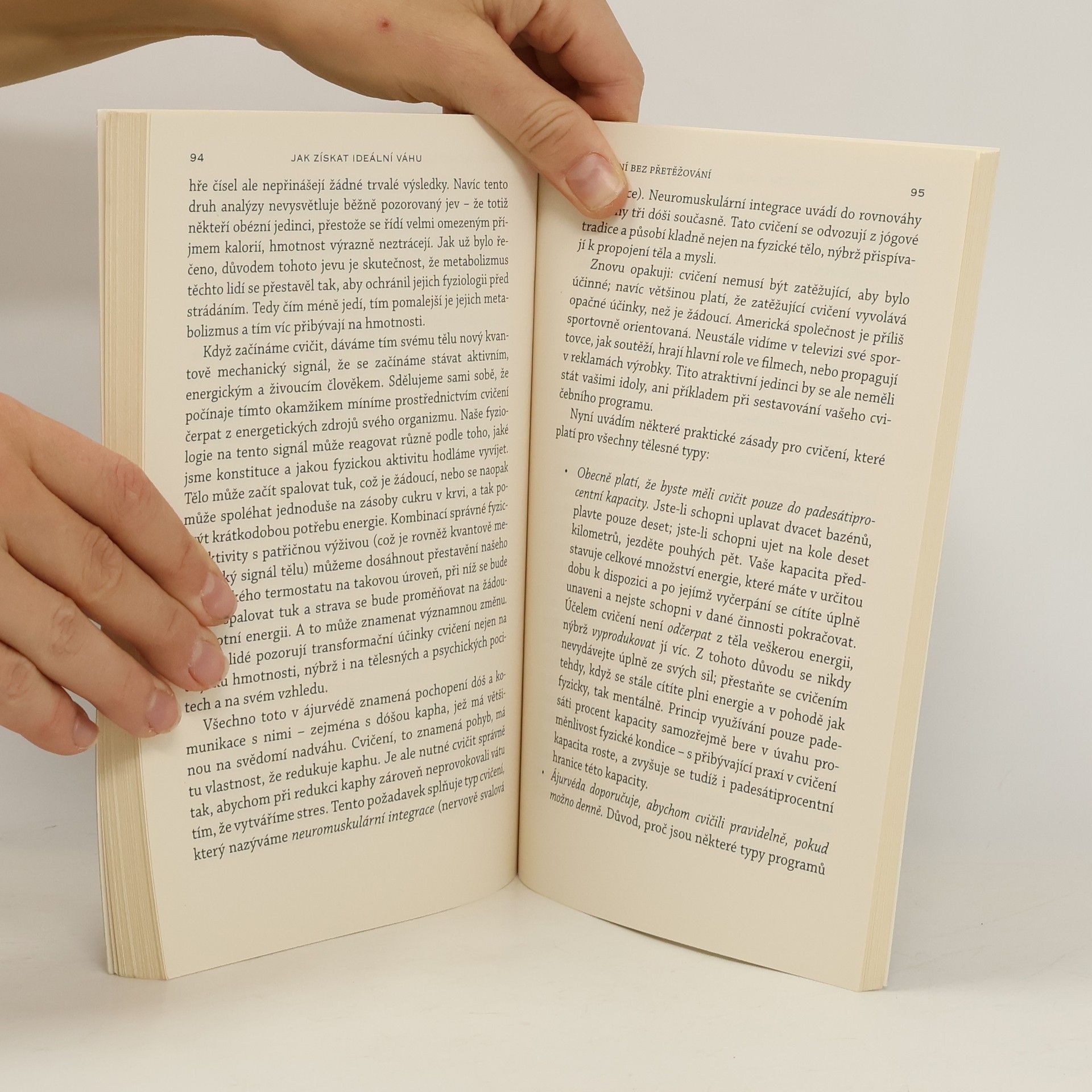 Deepak Chopra, M.D., nám tentokrát ve svojí knize nabízí podrobný program sestávající z jednoduchých a přirozených postupů založených na vyváženém propojení mysli a těla, jejichž prostřednictvím můžeme dosáhnout svojí ideální tělesné hmotnosti. Kniha obsahuje dotazník k určení tělesné konstituce vycházející z tradiční indické lékařské vědy známe jako ájurvéda. Ájurvédské chápání lidského organismu je nesmírně hluboké. Seznámení se s tímto pojetím a vyplnění zmíněného dotazníku nám okamžitě otevírá přístup k pět tisíc let staré nauce o lidském zdraví. Na základě získaných vědomostí si čtenář, možná poprvé v životě, bude schopen stanovit, jaké jsou jeho skutečné tělesné potřeby a rytmy. Naučí se rozpoznávat, v čem tyto rytmy narušuje a jak je obnovit. A konečně získá prostředky k dosažení své ideální tělesné hmotnosti, aniž by musel procházet jakýmkoli fyzickým utrpením či stresem.