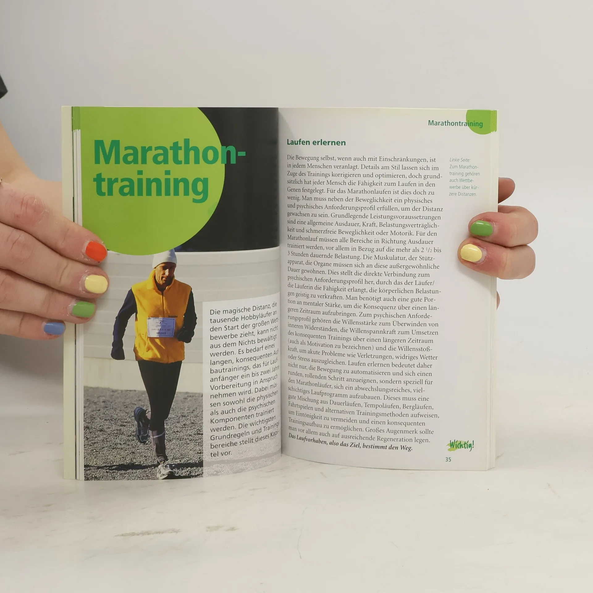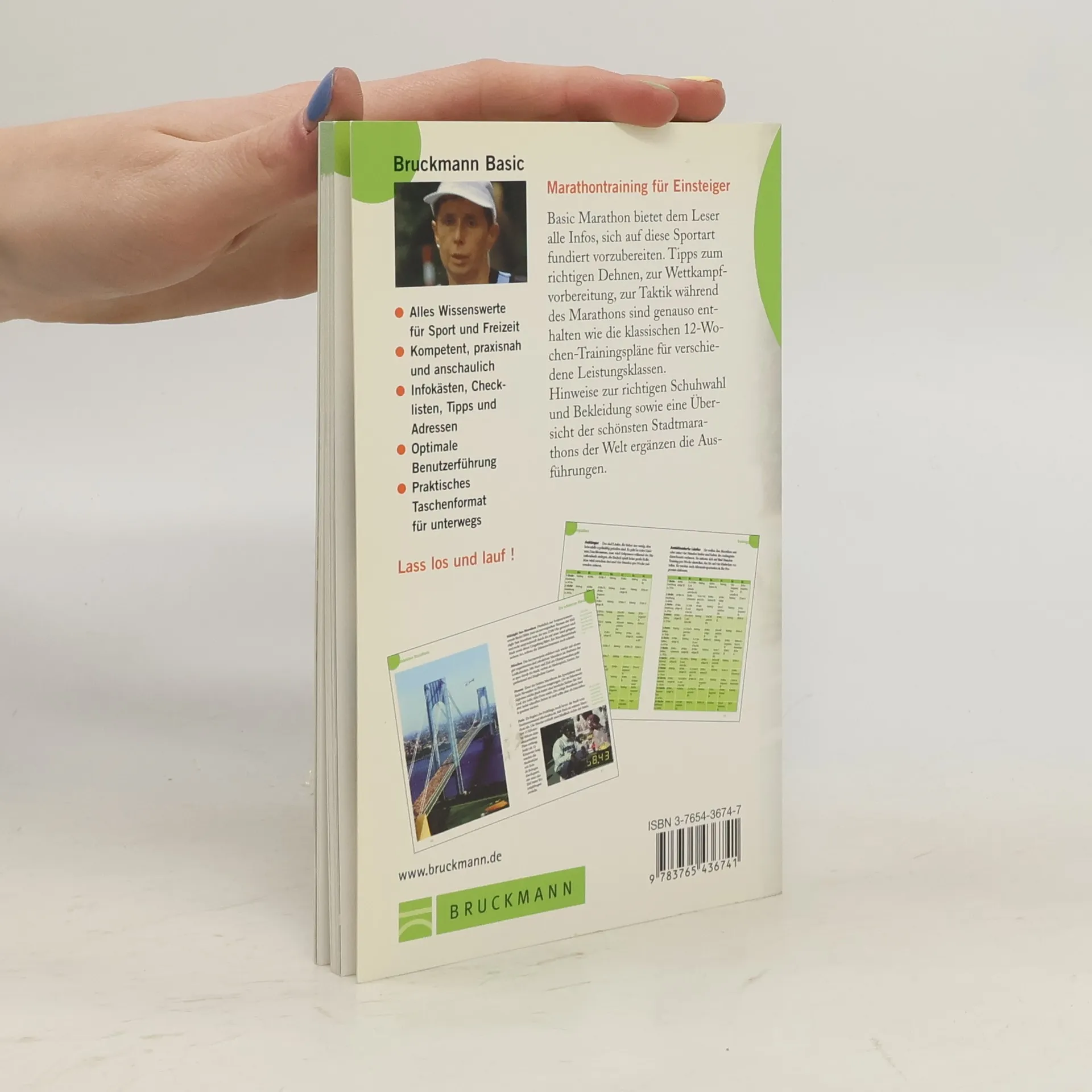 „Pták létá – ryba plave – člověk běhá“ – dieser Ausspruch von Emil Zátopek ist das Motto des Buches für alle Laufbegeisterten, die die „königliche Distanz“ Marathon ausprobieren möchten. Dieses Buch bietet dem Leser umfassende Informationen zum Training für den Marathon für Anfänger – eine fundierte Vorbereitung auf den Marathonsport. Sie finden grundlegende Begriffe, Trainingsarten, Trainingsalternativen, Informationen zum Aufwärmen, zur Regeneration, zur Ernährung und zum Energieverbrauch, zum Laufen unter extremen Wetterbedingungen sowie die zehn wichtigsten Punkte für das Marathontraining, häufige Trainingsfehler und klassische 12-wöchige Trainingspläne für verschiedene Leistungsgruppen. Anschließend folgt das Kapitel „Der große Tag“ – wie man sich in den letzten zwei Wochen vorbereitet, eine Checkliste für das Rennen, die Anreise zum Marathon und was in Ihrem Gepäck nicht fehlen sollte. Tipps zum richtigen Dehnen der Muskeln, zur Vorbereitung auf das Rennen und zur Taktik während des Rennens. Das Buch endet mit praktischen Ratschlägen zur richtigen Auswahl von Schuhen und Kleidung sowie einer Übersicht über die schönsten Stadtmarathons der Welt.
