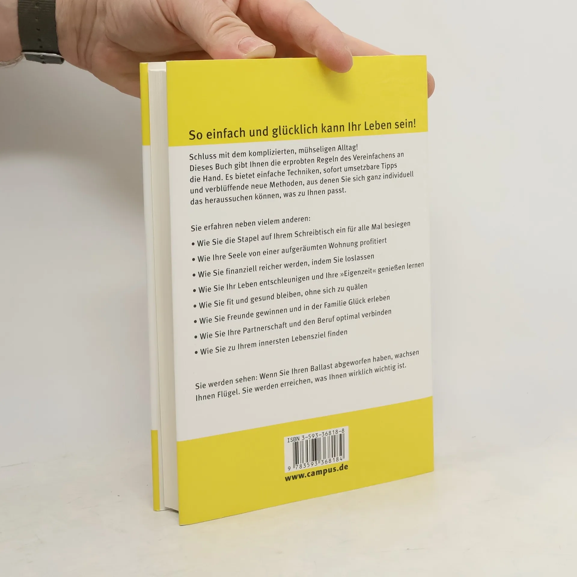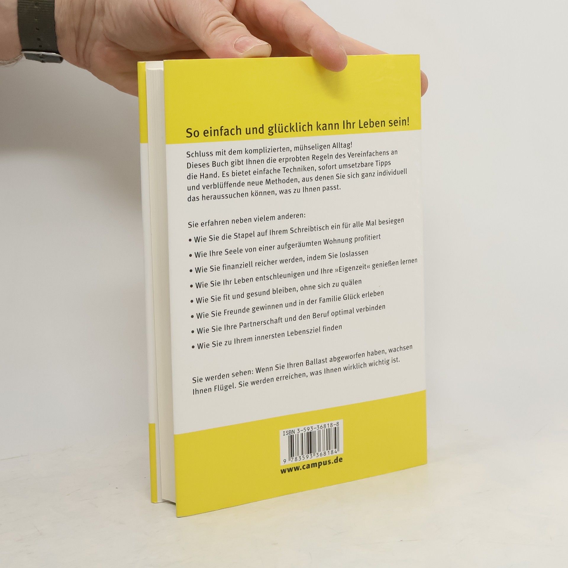 Die meisten Menschen leiden unter der Kompliziertheit des Lebens. simplify your life schafft Abhilfe, indem es jedem Leser die einfachen Regeln des Vereinfachens an die Hand gibt, mit denen er individuell und auf seine Bedürfnisse zugeschnitten sein Leben gestalten kann. Der simplify-Prozess ist ein spannender und einzigartiger Weg in sieben Etappen, an dessen Ende ein glückliches und zufriedenes Leben steht. Die Reise verläuft dabei vom Äußeren zum Inneren. Man beginnt mit dem Aufräumen und Vereinfachen des Schreibtischs, der Organisation der Zeit, gelangt zu den sozialen Beziehungen und Partnerschaften und bringt seine Geldangelegenheiten in Ordnung. Schließlich führt der simplify-Prozess weiter zum Körper und der Gesundheit und endet bei der zentralen Frage nach dem Selbst und dem Sinn des Lebens. Wie eine Raupe, die die Flügel des Schmetterlings als Anlage schon in sich trägt, wird der Leser den Weg zur Mitte - seinem Ich - und zum Wesentlichen finden. Am Ende, wenn er alle sieben Wege durchlaufen und sämtlichen Ballast abgeworfen hat, wachsen ihm Flügel und er kann endlich das erreichen, was ihm wirklich wichtig ist.