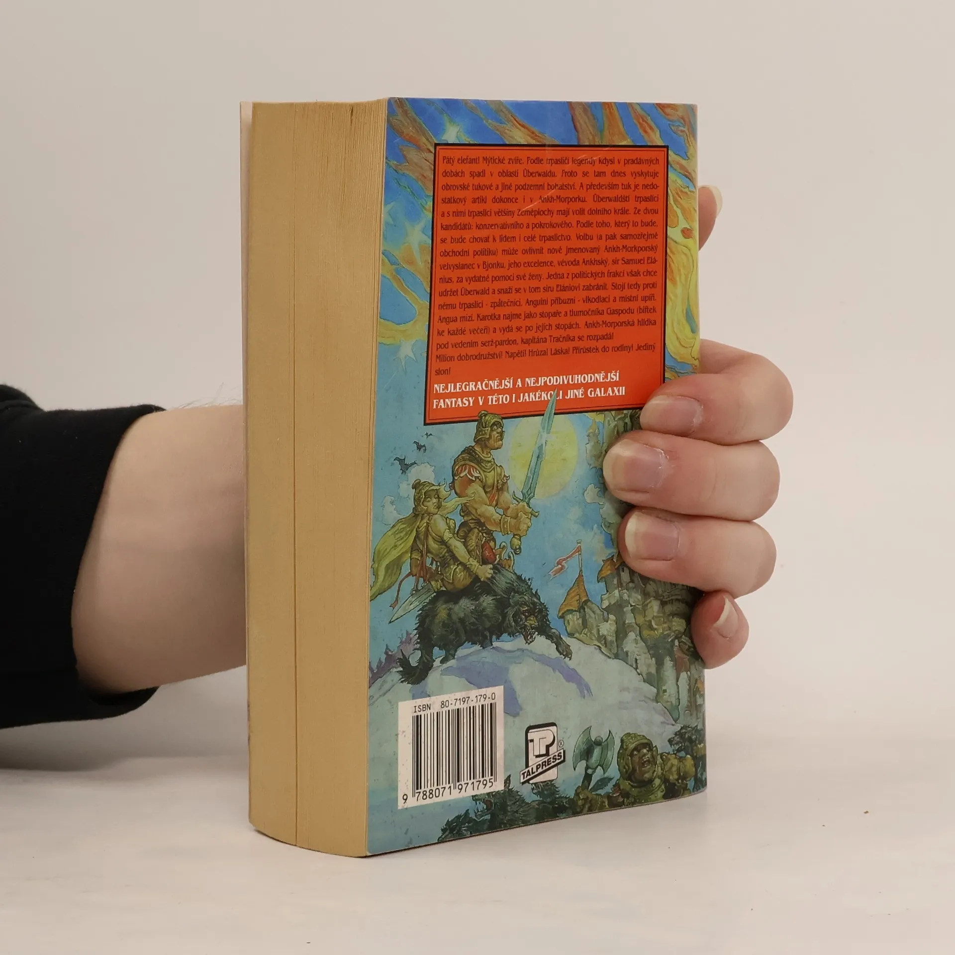 Pátý elefant! Mýtické zvíře. Podle trpasličí legendy kdysi v pradávných dobách spadl v oblasti Uberwaldu. Proto se tam dnes vyskytují obrovská tuková a jiná podzemní bohatství. A především tuk je nedostatkový artikl dokonce i v Ankh-Morporku. Uberwaldští trpaslíci a s nimi trpaslíci většiny Zeměplochy mají volit dolního krále. Ze dvou kandidátů: konzervativního a pokrokového. Podle toho, který to bude, se bude chovat k lidem i celé trpaslictvo. Volbu (a pak samozřejmě obchodní politiku) může ovlivnit nově jmenovaný Ankh-Morporský velvyslanec v Bjonku, jeho excelence, vévoda Ankhský, sir Samuel Elánius, za vydatné pomoci své ženy. Jedna z politických frakcí však chce udržet Uberwald a snaží se v tom siru Elániovi zabránit. Stojí tedy proti němu trpaslíci - zpátečníci, Anguini příbuzní - vlkodlaci a místní upíři. Angua mizí. Karotka najme jako stopaře a tlumočníka Gaspodu (biftek ke každé večeři) a vydá se po jejich stopách. Ankh-Morporská hlídka pod vedením serž-pardon, kapitána Tračníka se rozpadá! Milion dobrodružství! Napětí! Hrůza! Láska! Přírůstek do rodiny! Jediný slon!