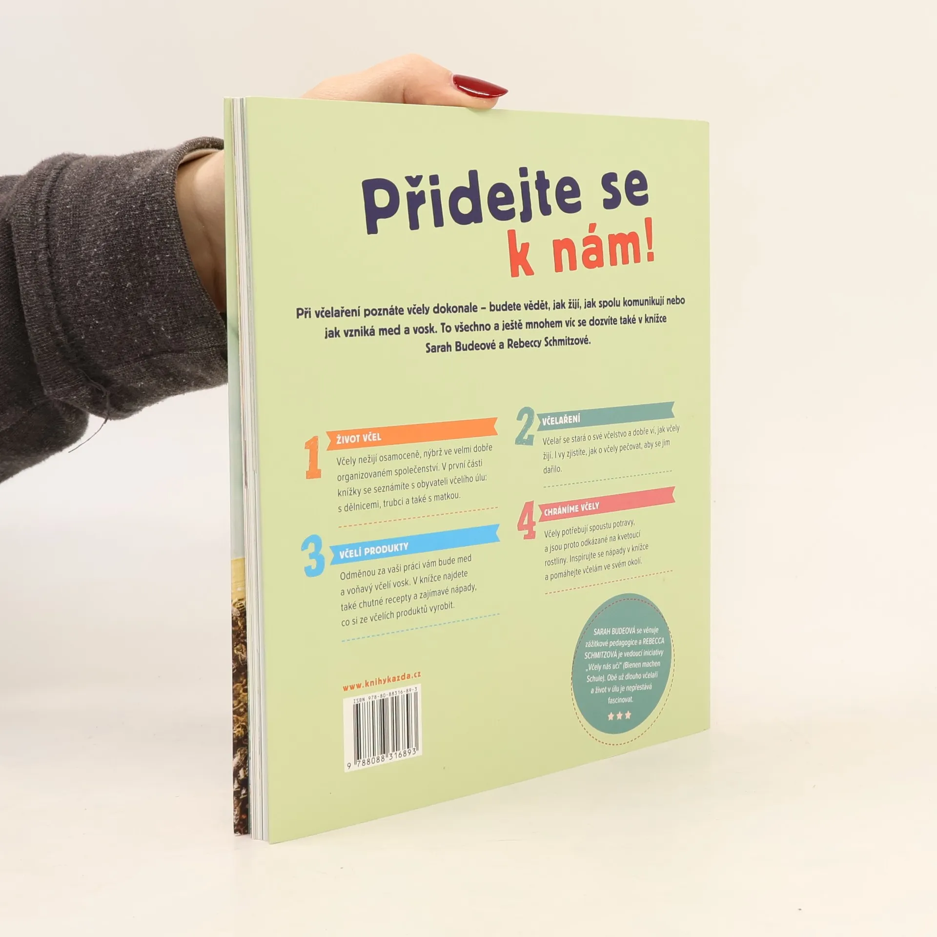 Při včelaření poznáte včely dokonale - budete vědět, jak žijí, jak spolu komunikují nebo jak vzniká med a vosk. To všechno a ještě mnohem víc se dozvíte také v knížce Sarah Budeové a Rebeccy Schmitzové. 1. Život včel Včely nežijí osamoceně, nýbrž ve velmi dobře organizovaném společenství. V první části knížky se seznámíte s obyvateli včelího úlu: s dělnicemi, trubci a také s matkou. 2. Včelaření Včelař se stará o své včelstvo a dobře ví, jak včely žijí. I vy zjistíte, jak o včely pečovat, aby se jim dařilo. 3. Včelí produkty Odměnou za vaši práci vám bude med a voňavý včelí vosk. V knížce najdete také chutné recepty a zajímavé nápady, co si ze včelích produktů vyrobit. 4. Chráníme včely Včely potřebují spoustu potravy, a jsou proto odkázané na kvetoucí rostliny. Inspirujte se nápady v knížce a pomáhejte včelám ve svém okolí.