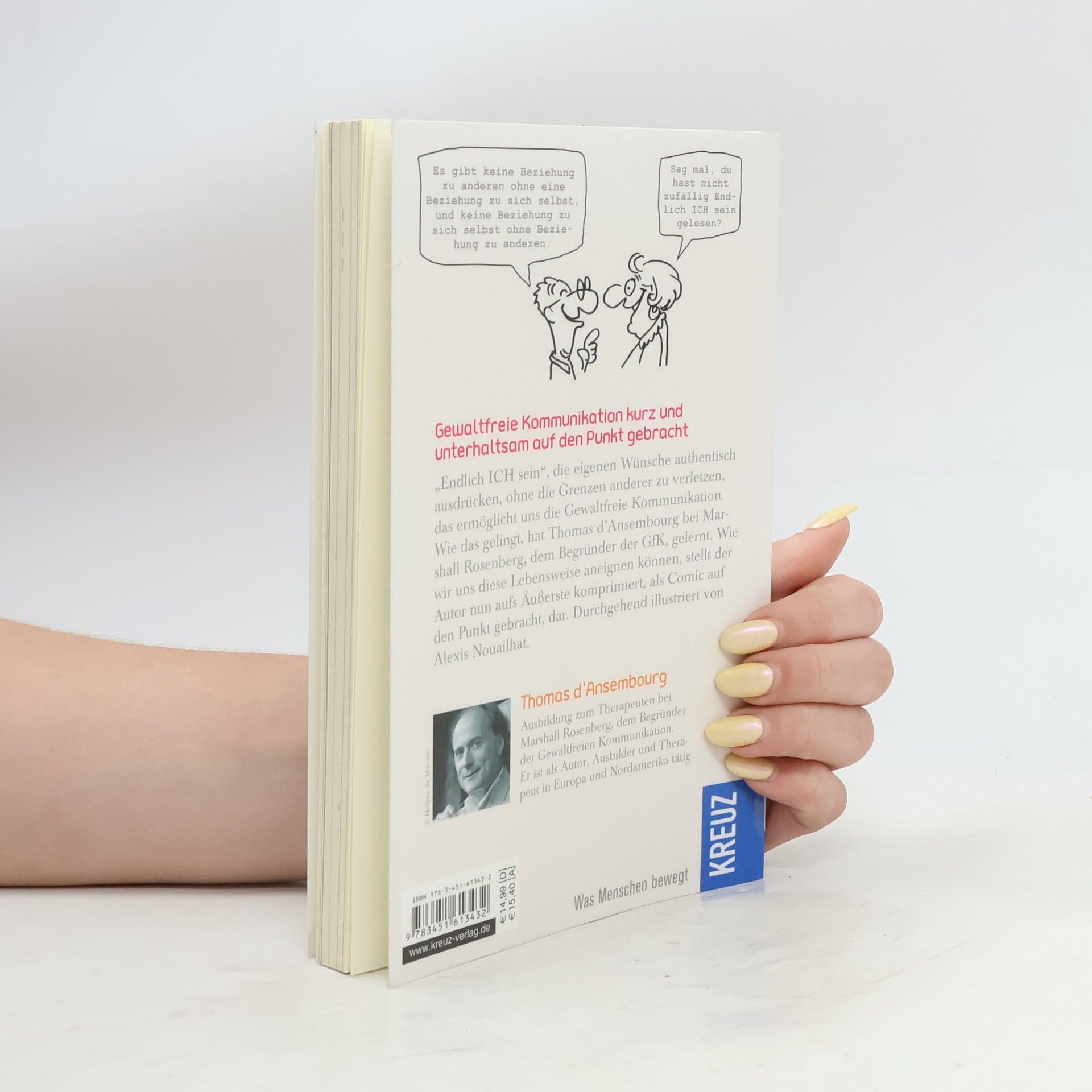 „Endlich ICH sein“, die eigenen Wünsche authentisch ausdrücken, ohne die Grenzen anderer zu verletzen, das ermöglicht uns die Gewaltfreie Kommunikation. Wie das gelingt, hat Thomas d'Ansembourg bei Marshall Rosenberg, dem Begründer der GfK, gelernt. Wie wir uns diese Lebensweise aneignen können, stellt der Autor nun aufs Äußerste komprimiert, als Comic auf den Punkt gebracht, dar. Durchgehend illustriert von Alexis Nouailhat. Ein Buch für alle, die auf humorvolle Weise lernen möchten, harmonischer in Gemeinschaft zusammenzuleben