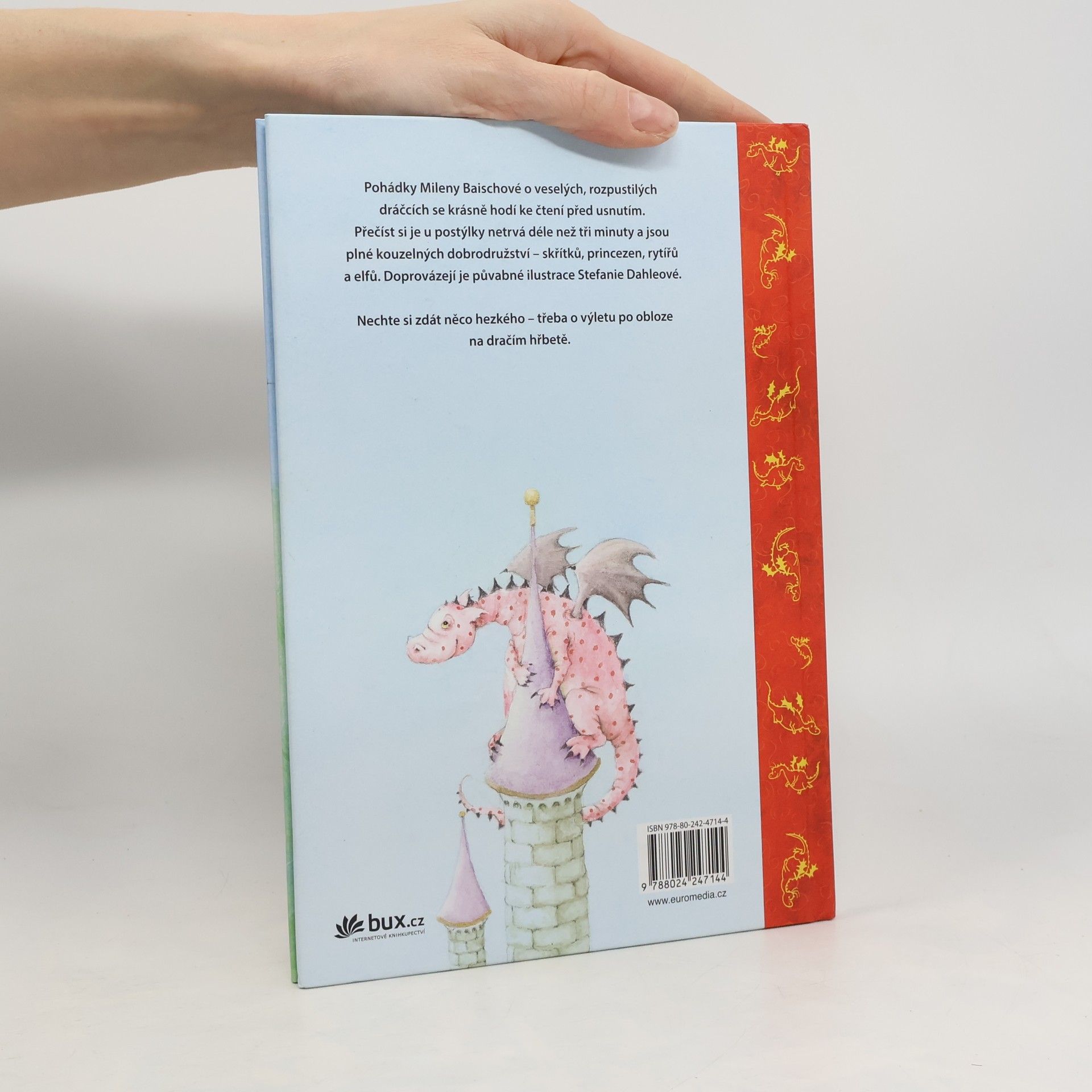 Krátké, tříminutové pohádky Mileny Baischové jsou ideální pro čtení před usnutím. Vyprávějí o veselých a drzích dráčcích, kteří přilétají do našeho světa a zažívají v něm kouzelná dobrodružství se skřítky, princeznami, rytíři a elfy. Doplňují je půvabné ilustrace Stefanie Dahleové. Kdopak by nechtěl s takovým dráčkem odletět do sna?