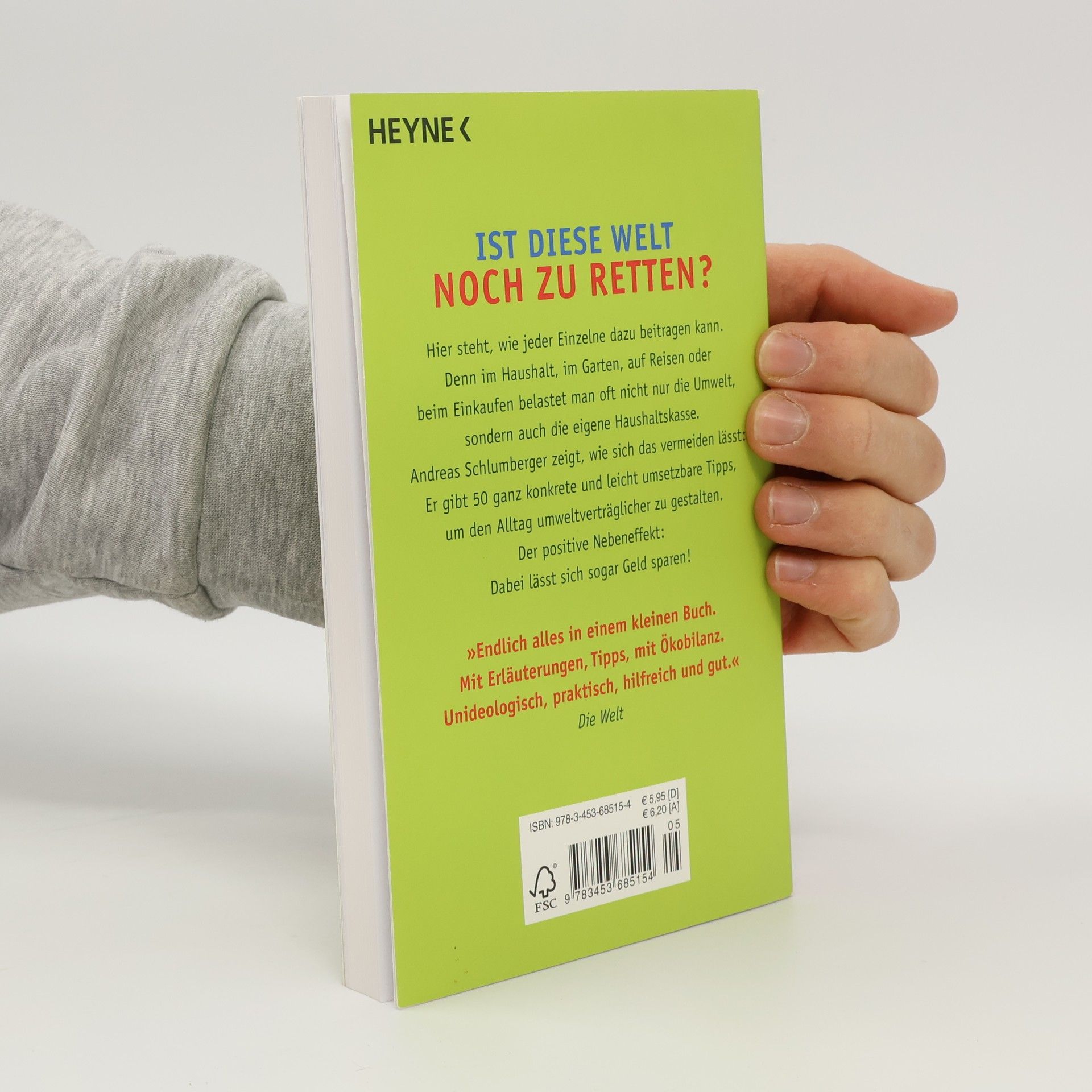 Ist diese Welt noch zu retten? Hier steht, wie jeder Einzelne dazu beitragen kann. Ob im Haushalt, im Garten, auf Reisen oder beim Einkaufen: Andreas Schlumberger hat 50 ganz konkrete und leicht umsetzbare Tipps für den Alltag parat, die helfen, die Natur zu schützen, natürliche Ressourcen zu erhalten, und die - als positiver Nebeneffekt - auch noch die Haushaltskasse entlasten.