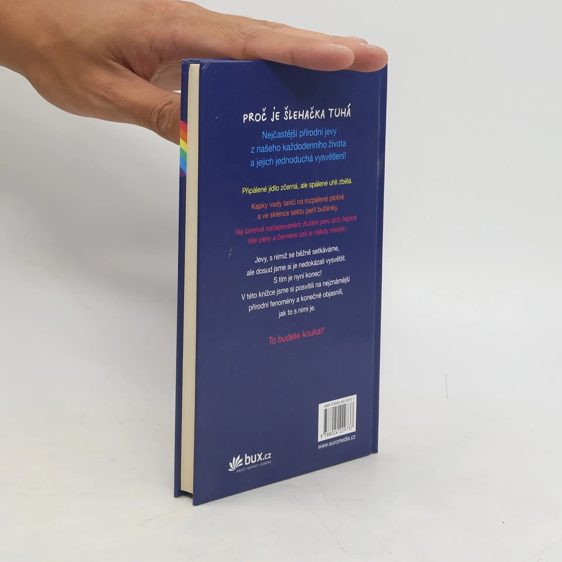 Některé všední věci nám někdy připadají nevysvětlitelné. Jedná se o jevy, které všichni známe a už jsme je někdy viděli, a některé nám dokonce vadí, například škraloup na mléce. Pokud mléko nepijete a kávu máte raději černou, tak jste se už možná ptali u sklenky sektu, co to tu vlastně bublá? Mnohé pivaře pak jistě napadla – přinejmenším po třetím pivu – vskutku filozofická otázka: Jak to, že má žluté pivo bílou pěnu a proč ta pěna tak pěkně drží. Tak co, věděli byste to? Úskalím totiž je, že za těmito a všemi dalšími přírodními fenomény, které jsou popsány v této knize, nevězí nic jiného než základy fyziky, biologie a chemie – tedy oborů, které ve škole patřily k oblíbeným jen pro málokteré z nás. Bruno B. Kremer a Bärbel Oftringová v této knize shromáždili výběr velmi zajímavých jevů z neživé i živé přírody, které nedokážeme snadno pochopit, a přidali k nim samozřejmě i správná vysvětlení.