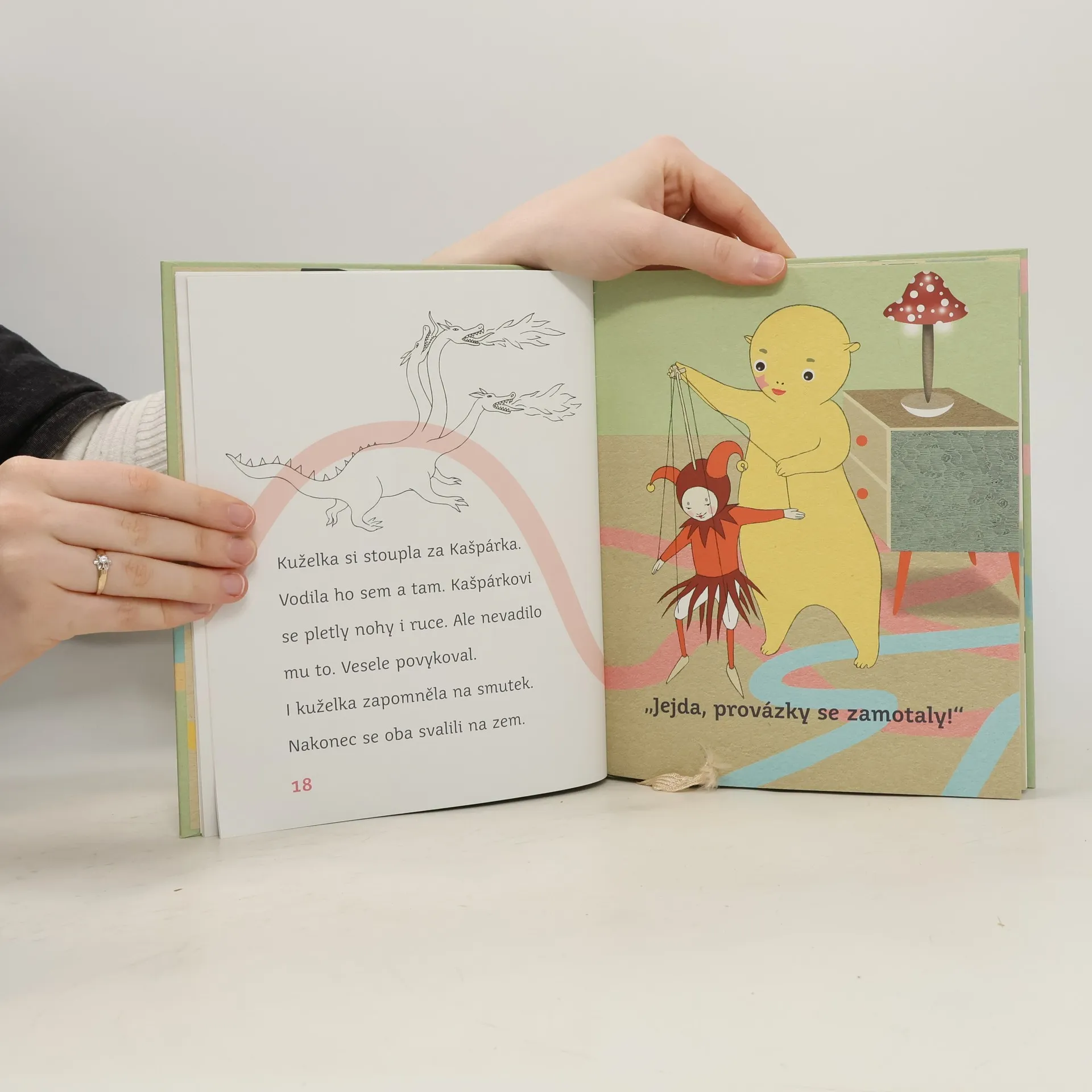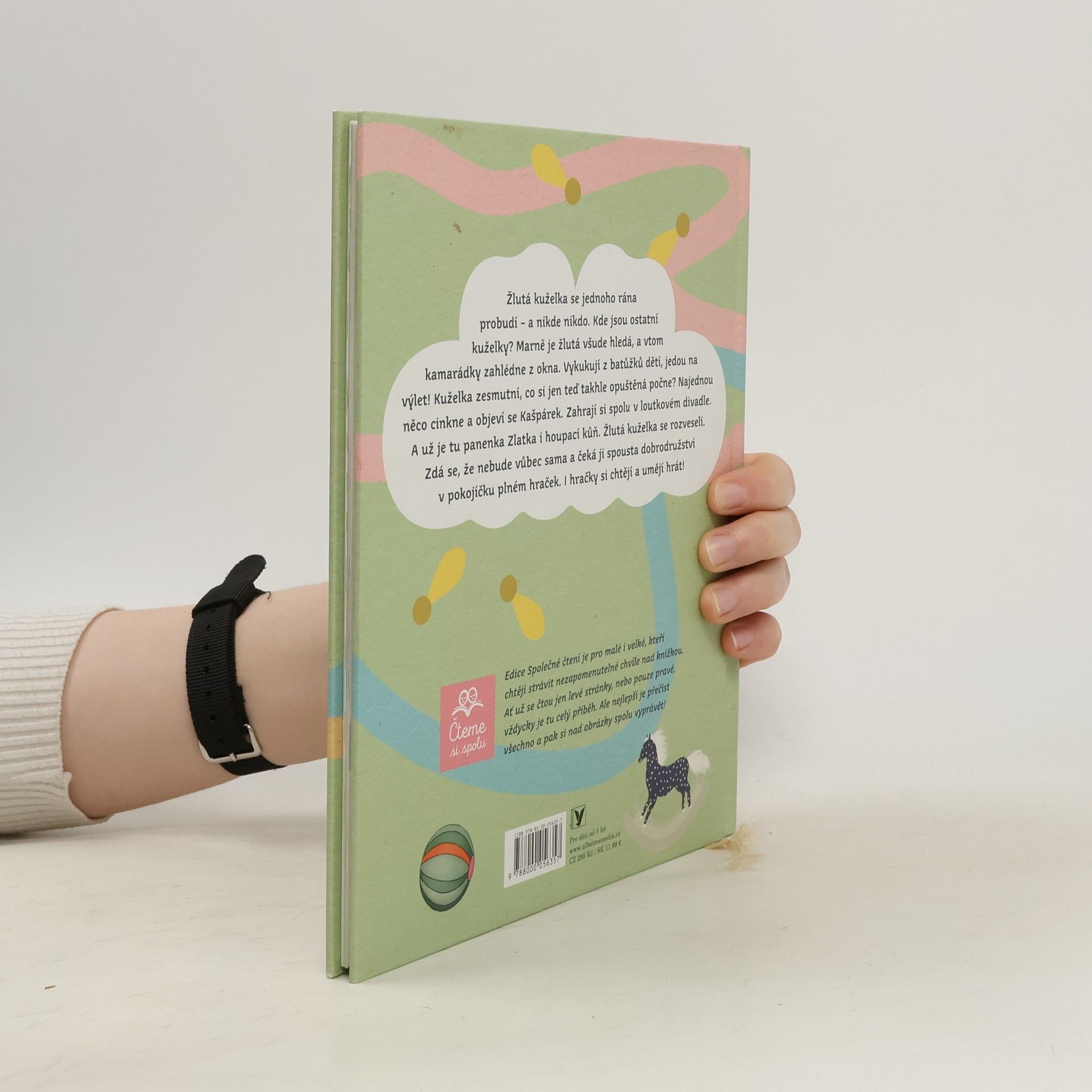 Žlutá kuželka zůstala sama doma, ostatní si vzaly děti na výlet. Co si jen opuštěná kuželka počne? Taky by si chtěla hrát jako její kamarádky. Vtom se ale objeví Kašpárek a zahrají si spolu loutkové divadlo. A hrát si chce i zlatovlasá panenka! Za ní zavrže houpací kůň – hop! a kuželka mu sedí na hřbetě. Potom si pohraje s kostkami a proletí se s papírovým drakem. I když žlutá kuželka nejela na výlet, rozhodně se nenudila a našla spoustu nových přátel.