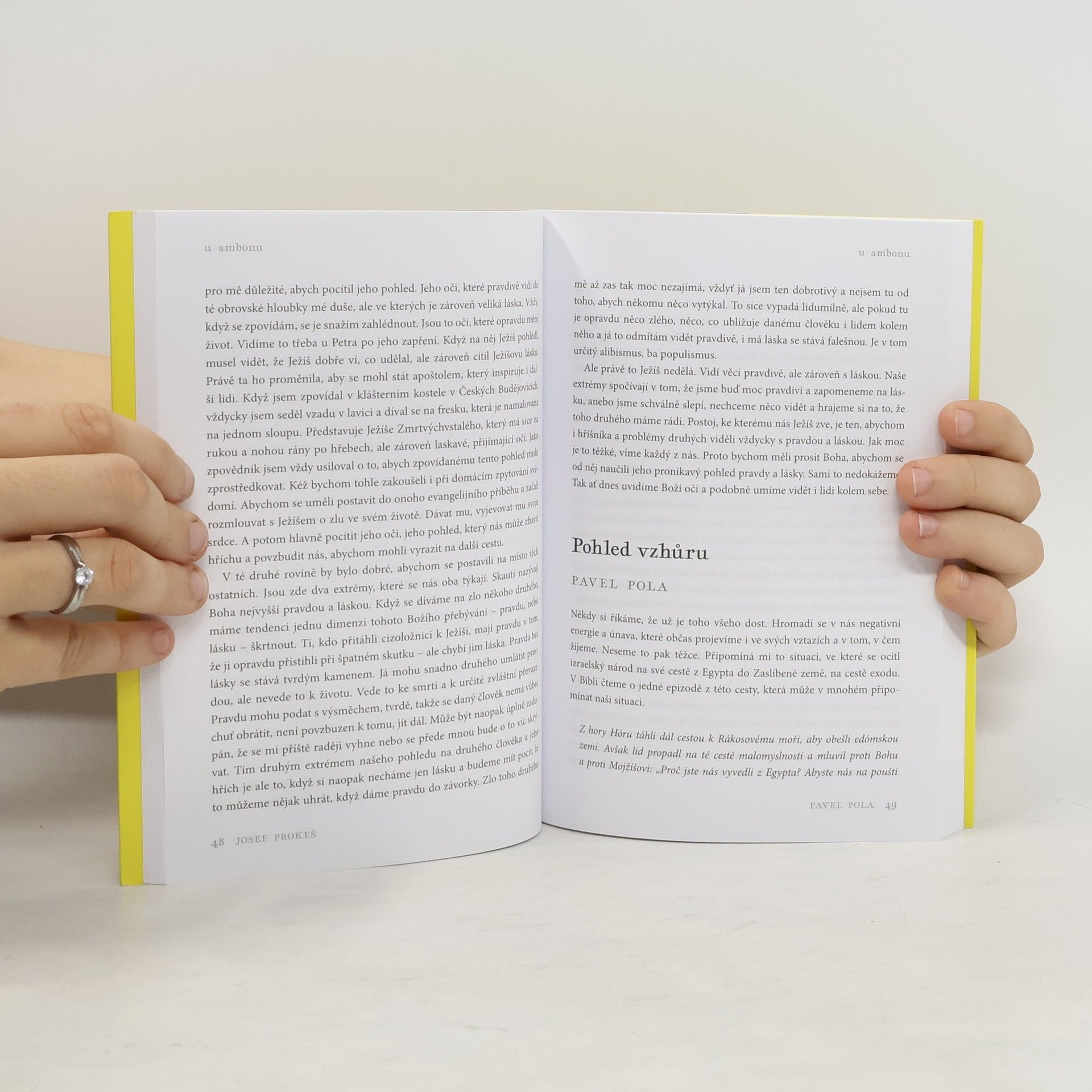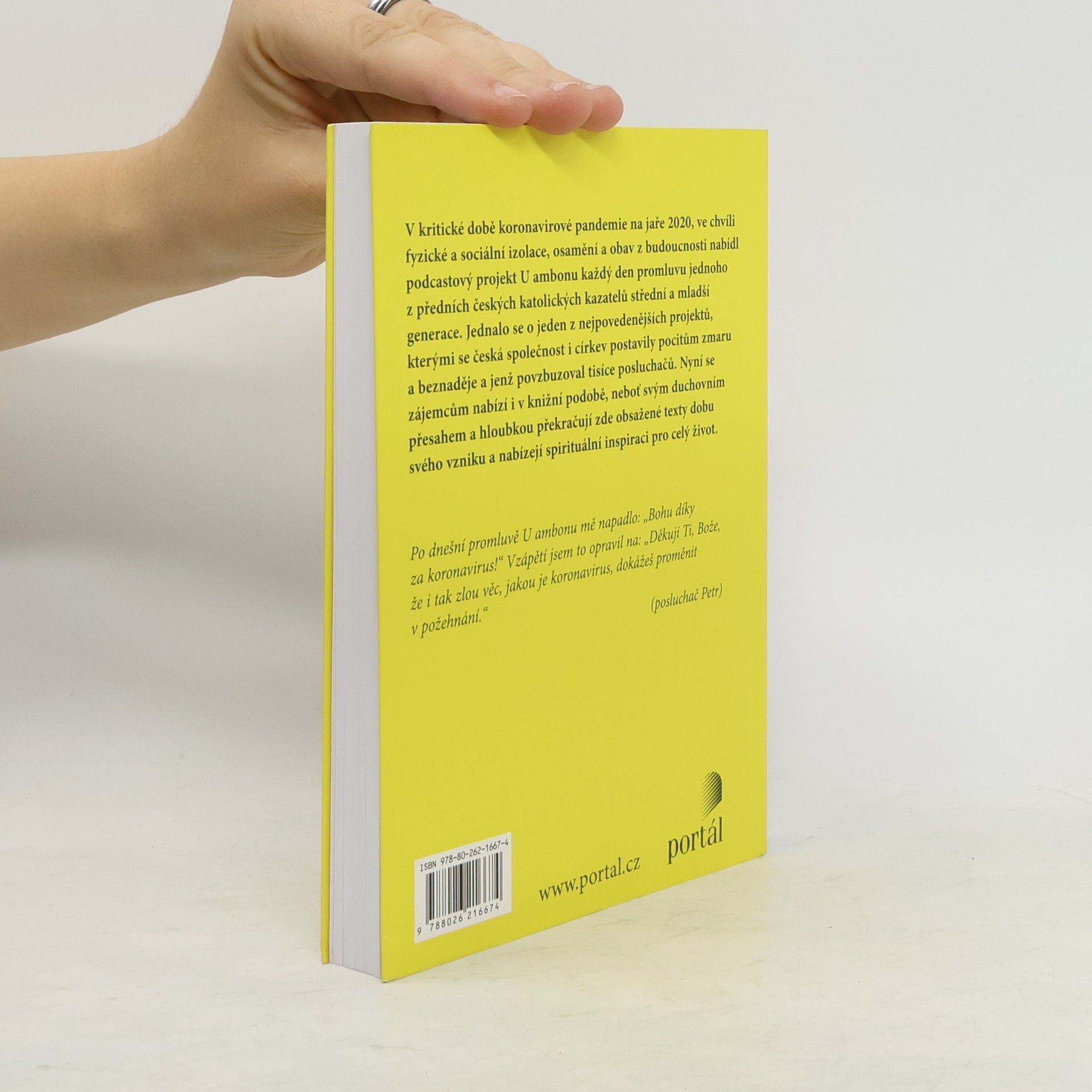 Od chvíle, kdy se kvůli koronavirové krizi uzavřely všechny kostely, odstartoval podcastový projekt U ambonu, v jehož rámci šest známých kněží každý den komentovalo evangelijní čtení. Vznikl tak unikátní soubor duchovních promluv, které nejen zajímavě vykládají text Písma a související témata, ale zachycují i nové přemýšlení o tom, jak v moderním světě žít křesťanství, jak se vyrovnávat s nečekanými a zásadními zvraty, které představovala například daná krize, jak vystoupit ze zabydleného prožívání víry směrem k větší dospělosti a autenticitě. Výběr z promluv z doby koronavirové je tak nejen dokumentem své doby, ale i výzvou k novému vykročení a dobře ukazuje, že každá krize je zároveň i šancí.