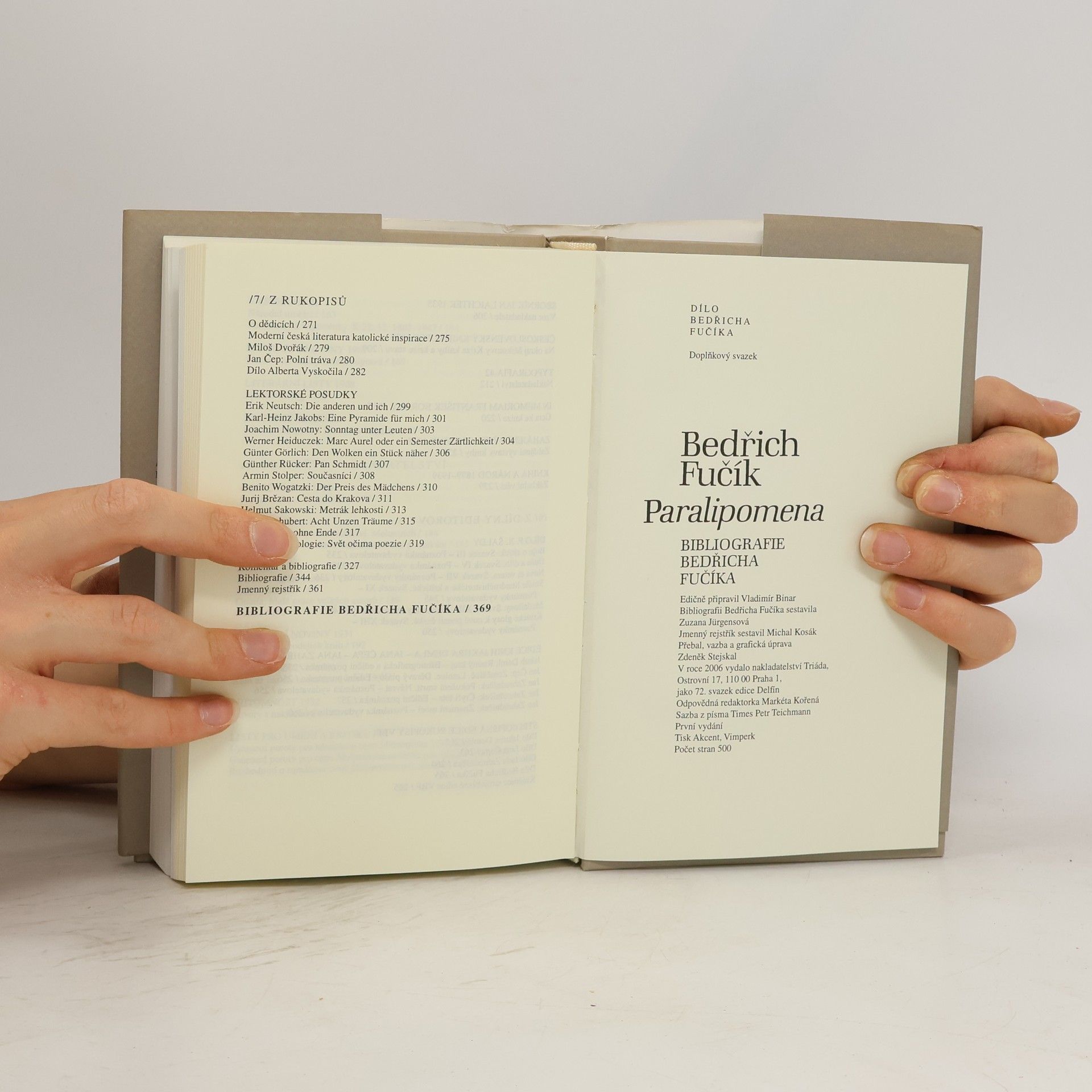 Sedmý, doplňkový svazek k šestidílnému DÍLU BEDŘICHA FUČÍKA, soustřeďují texty Bedřicha Fučíka z let 1918–1984, juvenilie, recenze, účast v anketách, redakční prohlášení, polemické glosy, přednášky či „vyznání“ napsaná pro rukopisné sborníky. Zvláštní oddíl tvoří texty a projevy týkající se problematiky vydávání knih či vedení nakladatelství, která řídil a oddíl shrnující vše podstatné k jeho významné práci editorské- ať už šlo o Dílo F. X. Šaldy nebo o Díla J. Demla, J. Čepa a J. Zahradníčka, jež vycházela ve Fučíkově strojopisné edici Rukopisy VBF. Druhou část svazku tvoří Bibliografie Bedřicha Fučíka, která poprvé v plném rozsahu představuje jeho kritické, ediční a nakladatelské projevy.