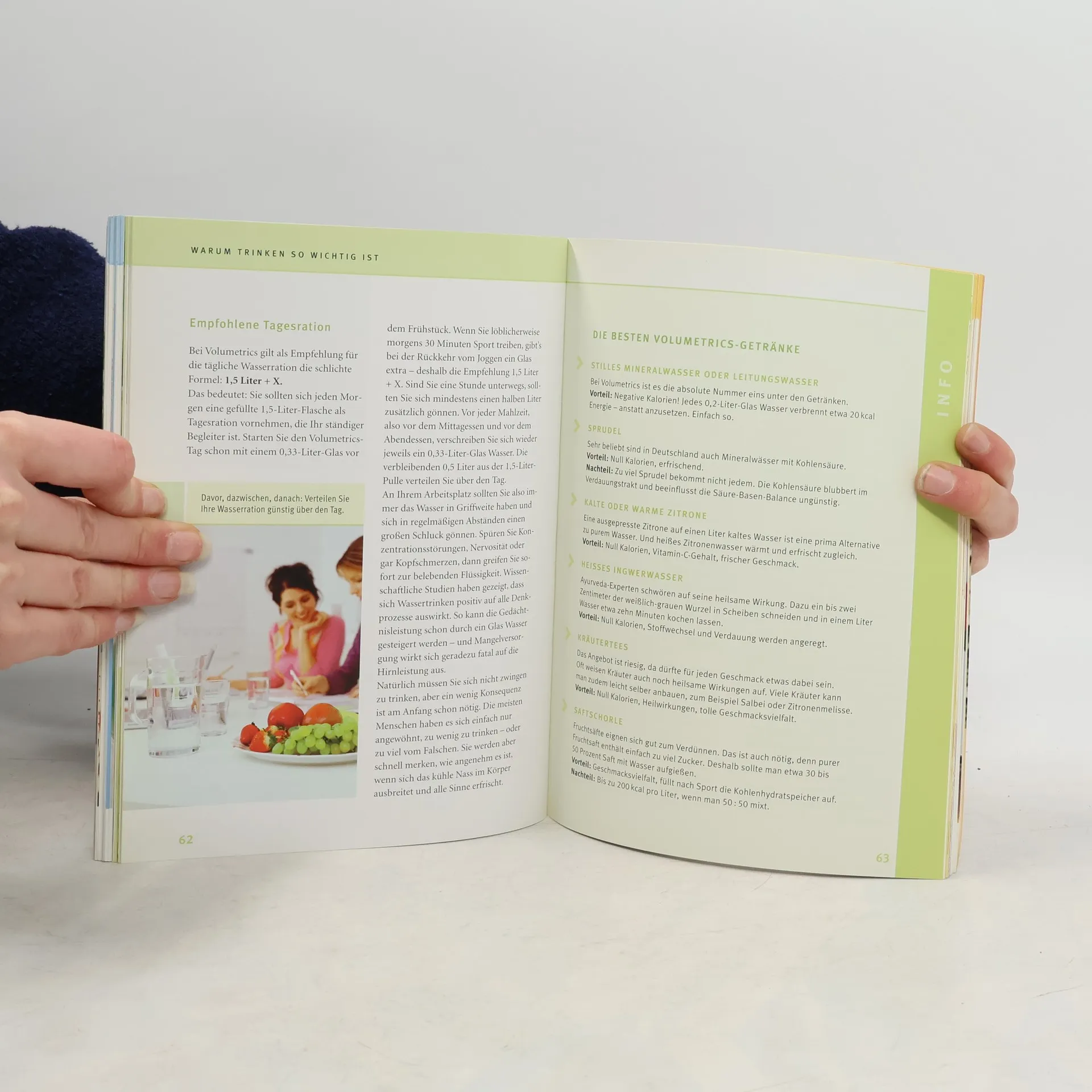 Nie wieder hungern und trotzdem gesund abnehmen – die Volumetrics-Diät macht’s möglich! Studien haben jüngst erwiesen, dass das Sättigungsgefühl über das Volumen der Nahrung läuft. Deswegen darf man bei Volumetrics große, sättigende Portionen essen, die jedoch – ganz wichtig – eine geringe Kaloriendichte aufweisen. Wasser spielt dabei eine zentrale Rolle: Zum einen gibt Wasser der Nahrung Volumen, zum anderen kurbelt es den Energieverbrauch im Körper an. Der Ratgeber erklärt, welche Lebensmittel in der Volumetrics-Ernährungspyramide „spitze“ sind (vor allem Obst und Gemüse), warum der Speiseplan bei dieser Diät automatisch gesund ist und gleichzeitig der schlanken Linie dient. Zudem gibt es Tipps für die richtigen Getränke, „wasserreiche“ Zubereitungstricks und Rezepte für alle Tageszeiten, darunter viele leckere Suppen.