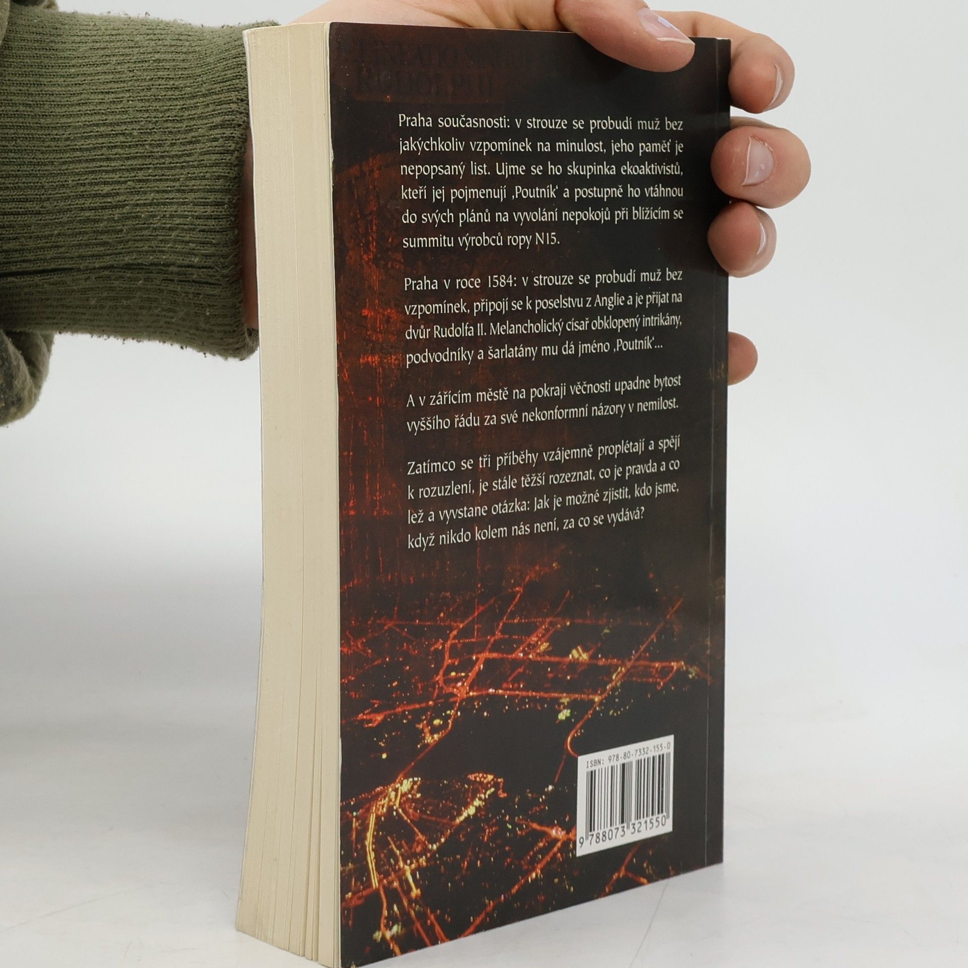 Praha současnosti: ve strouze se probudí muž bez jakýchkoliv vzpomínek na minulost, jeho paměť je nepopsaný list. Ujme se ho skupinka ekoaktivistů, kteří jej pojmenují „Poutník" a postupně jej vtáhnou do svých plánů na vyvolání nepokojů při blížícím se summitu výrobců ropy N15. Praha v roce 1584: ve strouze se probudí muž bez vzpomínek, připojí se k poselstvu z Anglie a je přijat na dvůr Rudolfa II. Melancholický císař obklopený intrikány, podvodníky a šarlatány mu dá jméno „Poutník"… A v zářícím městě na pokraji věčnosti upadne bytost vyššího řádu za své nekonformní názory v nemilost. Zatímco se tři příběhy vzájemně proplétají a spějí k rozuzlení, je stále těžší rozeznat, co je pravda a co lež a vyvstane otázka: Jak je možné zjistit, kdo jsme, když nikdo kolem nás není, za co se vydává? -- zdroj: www.legie.info --