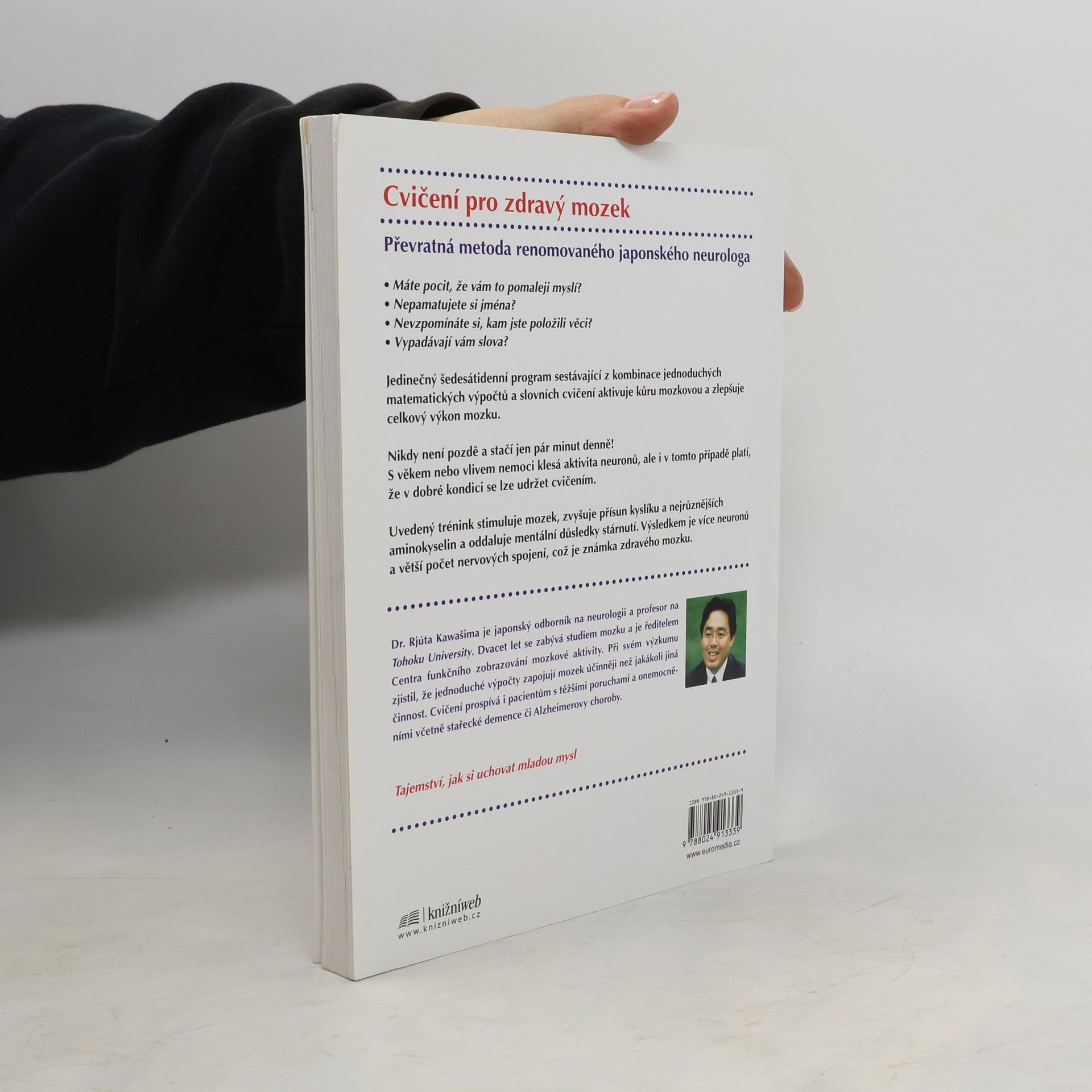 Podtitul: zlepšení za 60 dnů Cvičení pro zdravý mozek Převratná metoda renomovaného japonského neurologa Máte pocit, že vám to pomaleji myslí? Nepamatujete si jména? Nevzpomínáte si, kam jste položili věci? Vypadávají vám slova Jedinečný šedesátidenní program sestávající z kombinace jednoduchých matematických výpočtů a slovních cvičení aktivuje kůru mozkovou a zlepšuje celkový výkon mozku. Nikdy není pozdě a stačí jen pár minut denně! S věkem nebo vlivem nemoci klesá aktivita neuronů, ale i v tomto případě platí, že v dobré kondici se lze udržet cvičením. Uvedený trénink stimuluje mozek, zvyšuje přísun kyslíku a nejrůznějších aminokyselin a oddaluje mentální důsledky stárnutí. Výsledkem je více neuronů a větší počet nervových spojení, což je známka zdravého mozku. Autor je japonský odborník na neurologii a profesor na Tohoku University. Dvacet let se zabývá studiem mozkových aktivit a je ředitelem Centra funkčního zobrazování mozkové aktivity. Při svém výzkumu zjistil, že jednoduché výpočty zapojují mozek účinněji než jakákoli jiná aktivita. Cvičení prospívá i pacientům s těžšími poruchami a onemocněními včetně stařecké demence či Alzheimerovy choroby. Japonský hit, jehož se prodaly miliony výtisků. Tajemství, jak si uchovat mladou mysl