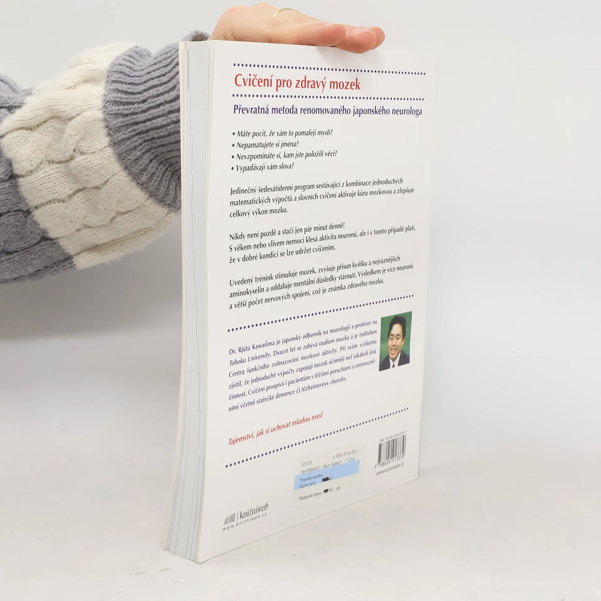 Podtitul: zlepšení za 60 dnů Cvičení pro zdravý mozek Převratná metoda renomovaného japonského neurologa Máte pocit, že vám to pomaleji myslí? Nepamatujete si jména? Nevzpomínáte si, kam jste položili věci? Vypadávají vám slova Jedinečný šedesátidenní program sestávající z kombinace jednoduchých matematických výpočtů a slovních cvičení aktivuje kůru mozkovou a zlepšuje celkový výkon mozku. Nikdy není pozdě a stačí jen pár minut denně! S věkem nebo vlivem nemoci klesá aktivita neuronů, ale i v tomto případě platí, že v dobré kondici se lze udržet cvičením. Uvedený trénink stimuluje mozek, zvyšuje přísun kyslíku a nejrůznějších aminokyselin a oddaluje mentální důsledky stárnutí. Výsledkem je více neuronů a větší počet nervových spojení, což je známka zdravého mozku. Autor je japonský odborník na neurologii a profesor na Tohoku University. Dvacet let se zabývá studiem mozkových aktivit a je ředitelem Centra funkčního zobrazování mozkové aktivity. Při svém výzkumu zjistil, že jednoduché výpočty zapojují mozek účinněji než jakákoli jiná aktivita. Cvičení prospívá i pacientům s těžšími poruchami a onemocněními včetně stařecké demence či Alzheimerovy choroby. Japonský hit, jehož se prodaly miliony výtisků. Tajemství, jak si uchovat mladou mysl