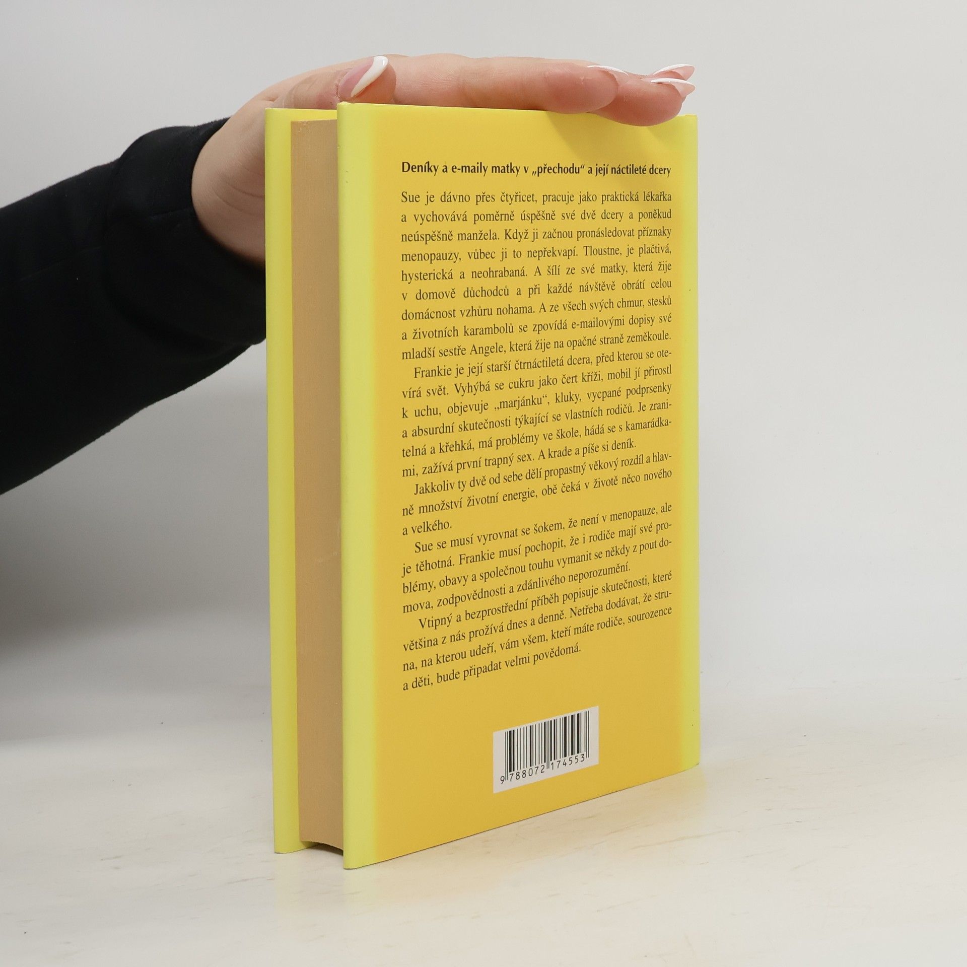 Šestačtyřicetiletá Sue je praktická lékařka se dvěma dětmi a jedním manželem. Frankie je její starší dcera, před níž se ve čtrnácti otevírá svět. Jakkoliv ty dvě od sebe dělí propastný věkový rozdíl a množství životní energie, obě čeká v životě něco dalšího a velkého.Pro Sue to znamená vyrovnat se zároveň s menopauzou i pubertou své dcery, pronásledují ji úzkostné stavy a nejlépe se cítí, když si může konečně zalézt do postele. A co Frankie? Ta se vyhýbá cukru jako čert kříži, mobil jí přirostl k uchu, objevuje kluky, vycpané podprsenky a absurdní skutečnosti týkající se jejích rodičů. Že nemají nic společného? Stačí jen vzít v úvahu jejich obavy, problémy s muži a společnou touhu vymanit se z pout domova. Vtipný, citlivě podaný příběh vyprávěný skrze deníkové záznamy a e-maily popisuje věci, které většina z nás prožívá dnes a denně. Netřeba dodávat, že struna, na kterou udeří, vám bude připadat velmi povědomá.