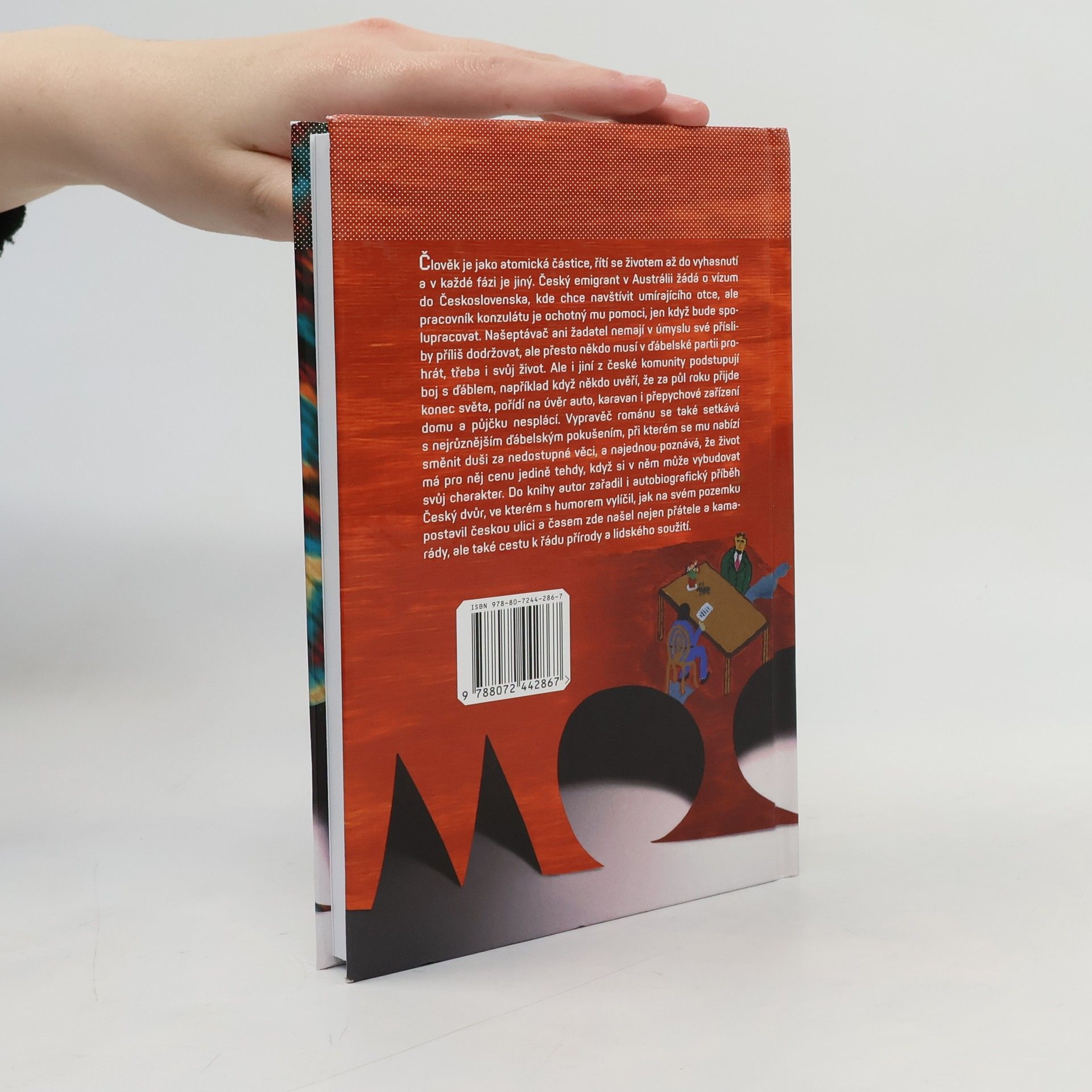 Příběh českého emigranta, který jako občan Austrálie žádá o vízum do Československa, kde chce navštívit umírajícího otce Při schůzkách s ďáblem člověk ztrácí svou tvář, začne směňovat duši za nedostupné věci, a když se konečně odhodlá vzepřít se ďáblovi, ztratí sám sebe. V komunitě českých emigrantů v Austrálii prošel nějakým ďábelským pokušením každý. Alkohol, nevěry, nesolidnost při vracení půjčených peněz, zlomyslnosti a podrazy, které se dají omlouvat těžkým životem. S tím se hrdinové knihy vyrovnali každý po svém a jinak. Například když jeden z kamarádů uvěřil, že do půl roku přijde konec světa, a pořídil na úvěr auto, karavan i přepychové zařízení domu. A jak se konec světa zvolna přibližoval, další z nich se s ďáblem opravdu scházel. Jako občan Austrálie zažádal o vízum do Československa, kde chce navštívit umírajícího otce. Kulturní atašé na ambasádě s nejasnými kompetencemi je ochotný mu pomoci, když bude spolupracovat. Našeptávač ani žadatel nemají v úmyslu své přísliby příliš dodržovat, ale přesto někdo musí v ďábelské partii prohrát, třeba i svůj život. Stanislav Moc ale píše také o tom, jak bludný úděl emigranta změnit. V druhé části knihy nazvané Český dvůr vylíčil v humorných i dobrodružných příbězích, jak vznikala převážně česká čtvrť v nové zástavbě, jaká se zde zrodila přátelství, jaké zkušenosti vedou k nalezení pozitivní filozofie, k poznání řádu přírody i lidského soužití
