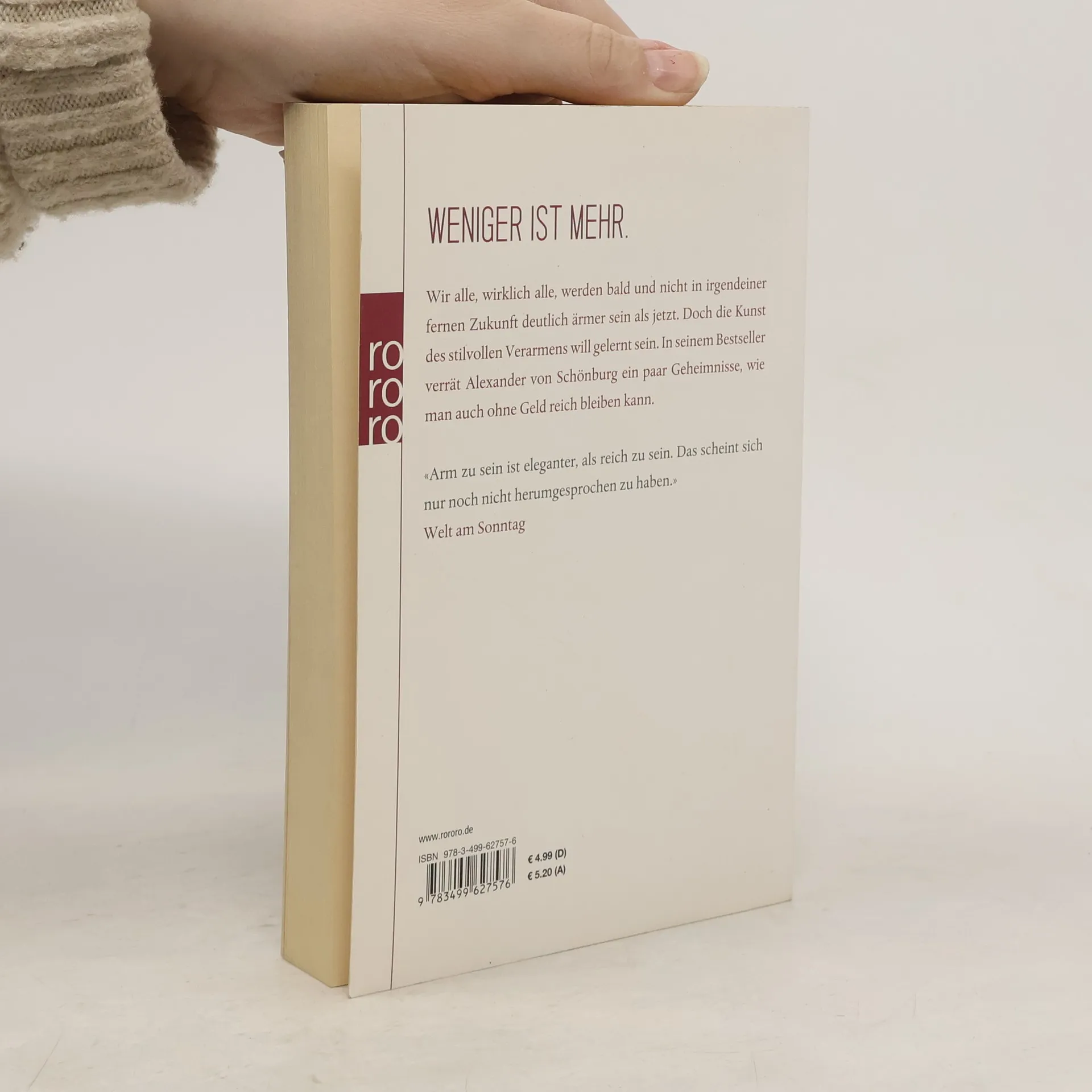 WENIGER IST MEHR. Wir alle, wirklich alle, werden bald und nicht in irgendeiner fernen Zukunft deutlich ärmer sein als jetzt. Doch die Kunst des stilvollen Verarmens will gelernt sein. In seinem Bestseller verrät Alexander von Schönburg ein paar Geheimnisse, wie man auch ohne Geld reich bleiben kann. «Arm zu sein ist eleganter, als reich zu sein. Das scheint sich nur noch nicht herumgesprochen zu haben.» Welt am Sonntag