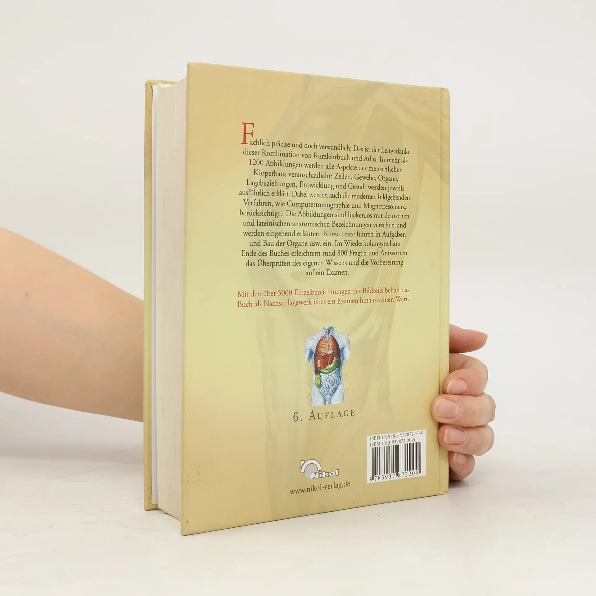 Fachlich präzise und doch verständlich: Das ist der Leitgedanke dieser Kombination von Kurzlehrbuch und atlas. In mehr als 1200 Abbildungen werden alle Aspekte des menschlichen Körperbaus veranschaulicht: Zellen, Gewebe, Organe, Lagebeziehungen, Entwicklung und Gestalt werden jeweils ausführlich erklärt. Dabei werden auch die modernen bildgebenden Verfahren, wie Computertomographie und Magnetresonanz, berücksichtigt. Die Abbildungen sind lückenlos mit deutschen und lateinischen anatomischen Bezeichnungen versehen und werden eingehend erläutert. Kurze Texte führen in Aufgaben und Bau der Organe usw. ein. Im Wiederholungsteil am Ende des Buches erleichtern rund 800 Fragen und Antworten das Überprüfen des eigenen Wissens und die Vorbereitung auf ein Examen. Mit den über 5000 Einzelbezeichnungen des Bildteils behält das Buch als Nachschlagewerk über ein Examen hinaus seinen Wert.