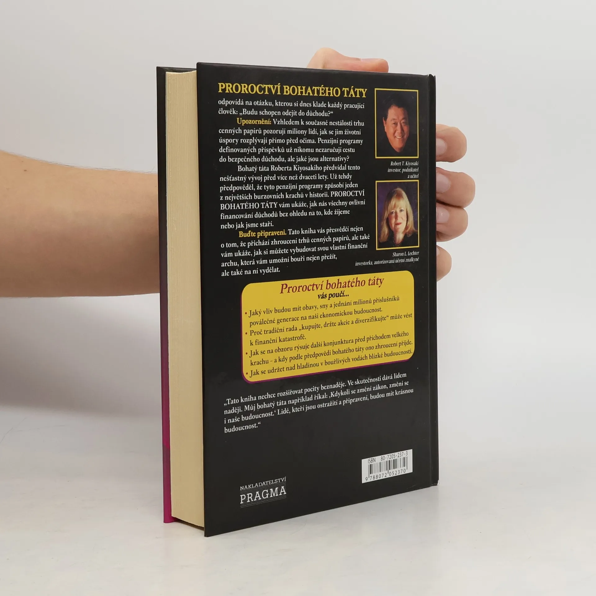 Bohatý táta Roberta Kiyosakiho předvídal před více než dvaceti lety, že penzijní programy způsobí jeden z největších burzovních krachů v historii. V této knize se dozvíte, jak nás všechny ovlivní financování důchodů bez ohledu na to, kde žijeme nebo jak jsme staří. Buďte připraveni. Tato kniha vás přesvědčí nejen o tom, že přichází zhroucení trhů cenných papírů, ale také vám ukáže, jak si můžete vybudovat svou vlastní finanční archu, která vám umožní bouři nejen přežít, ale také na ni vydělat.