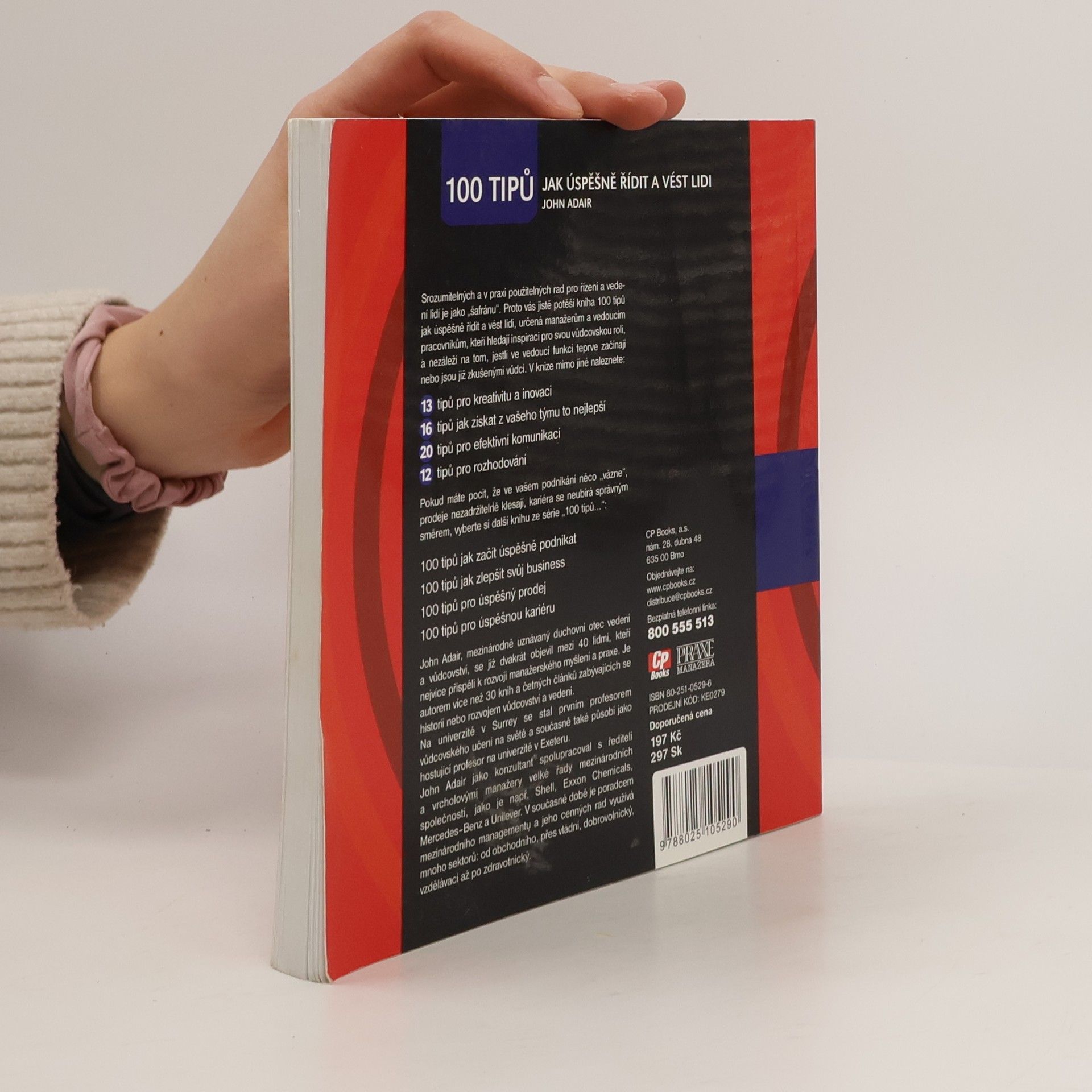 Srozumitelných a praktických rad pro řízení a vedení lidí je málo. Tato kniha nabízí 100 tipů pro manažery a vedoucí pracovníky, kteří hledají inspiraci bez ohledu na úroveň své zkušenosti. Obsahuje 13 tipů pro kreativitu a inovaci, 16 tipů, jak získat z týmu to nejlepší, 20 tipů pro efektivní komunikaci a 12 tipů pro rozhodování. Pokud máte pocit, že vaše podnikání stagnuje, prodeje klesají nebo kariéra se neubírá správným směrem, můžete také zvolit další tituly ze série, které se zaměřují na úspěšné podnikání, zlepšení byznysu, prodej a kariéru. Autor, John Adair, je mezinárodně uznávaný odborník na vedení a dvakrát byl zařazen mezi 40 lidí, kteří nejvíce přispěli k rozvoji manažerského myšlení. Napsal více než 30 knih a článků o historii a rozvoji vůdcovství. Na univerzitě v Surrey se stal prvním profesorem vůdcovského učení a působí také jako hostující profesor na univerzitě v Exeteru. Jako konzultant spolupracoval s řadou mezinárodních společností, včetně Shell a Unilever, a jeho rady využívají různé sektory, od obchodního po zdravotnický.