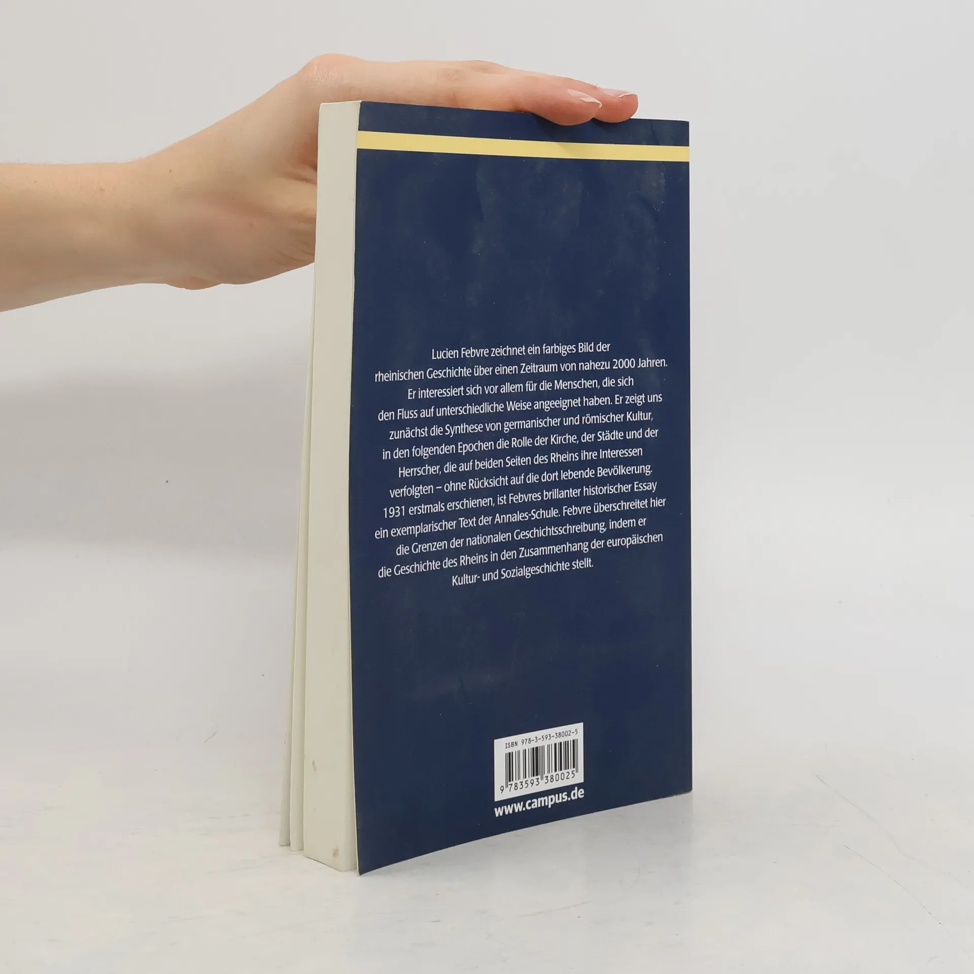 Lucien Febvre zeichnet ein farbiges Bild der rheinischen Geschichte über einen Zeitraum von nahezu 2000 Jahren. Er interessiert sich vor allem für die Menschen, die sich den Fluss auf unterschiedliche Weise angeeignet haben. Er zeigt uns zunächst die Synthese von germanischer und römischer Kultur, in den folgenden Epochen die Rolle der Kirche, der Städte und der Herrscher, die auf beiden Seiten des Rheins ihre Interessen verfolgten – ohne Rücksicht auf die dort lebende Bevölkerung. 1931 erstmals erschienen, ist Febvres brillanter historischer Essay ein exemplarischer Text der Annales- Schule. Febvre überschreitet die Grenzen der nationalen Geschichtsschreibung, indem er zum ersten Mal die Geschichte des Rheins in den Zusammenhang der europäischen Kulturund Sozialgeschichte stellt.