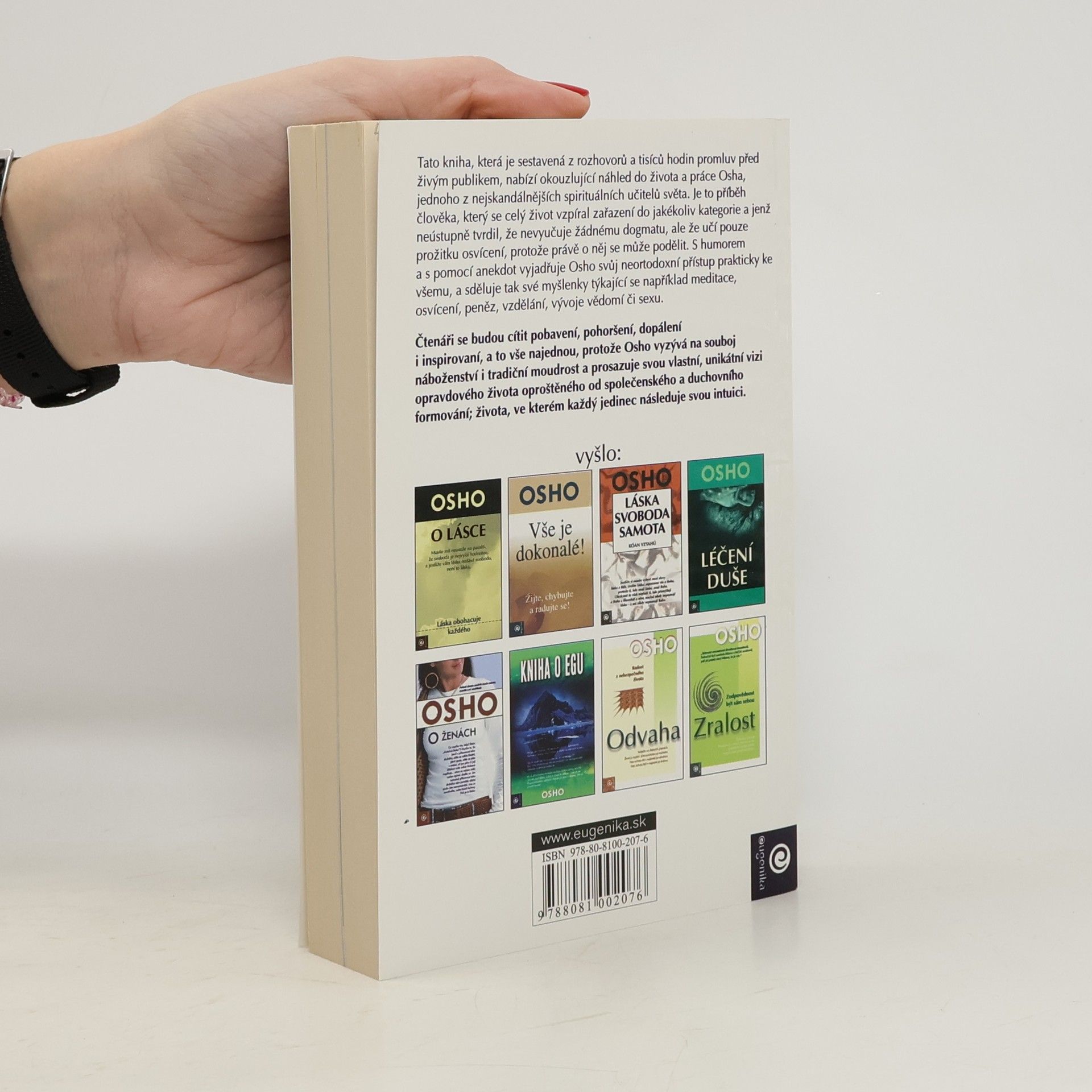 Tato kniha ,která je sestavená z rozhovorů a tisíců hodin promluv před živým publikem,nabízí okouzlující náhled do života a práce Osha,jednoho z nejskandálnějších spirituálních učitelů světa. Je to příběh člověka,který se po celý život vzpíral zařazení do jakékoliv kategorie a jenž neústupně tvrdil,že nevyučuje žádnému dogmatu,ale že učí pouze prožitku osvícení,protože právě o něj se může podělit. S humorem a s pomocí anekdot vyjadřuje Osho svůj neortodoxní přístup prakticky ke všemu, a sděluje tak své myšlenky týkající se například meditace,osvícení,peněz,vzdělání,vývoje vědomí či sexu. Čtenáři se budou cítit pobavení,pohoršení,dopálení i inspirovaní, a to vše najednou,protože Osho vyzývá na souboj náboženství i tradiční moudrost a prosazuje svou vlastní,unikátní vizi opravdového života oproštěného od společenského a duchovního formování,života,ve kterém každý jedinec následuje svou intuici.