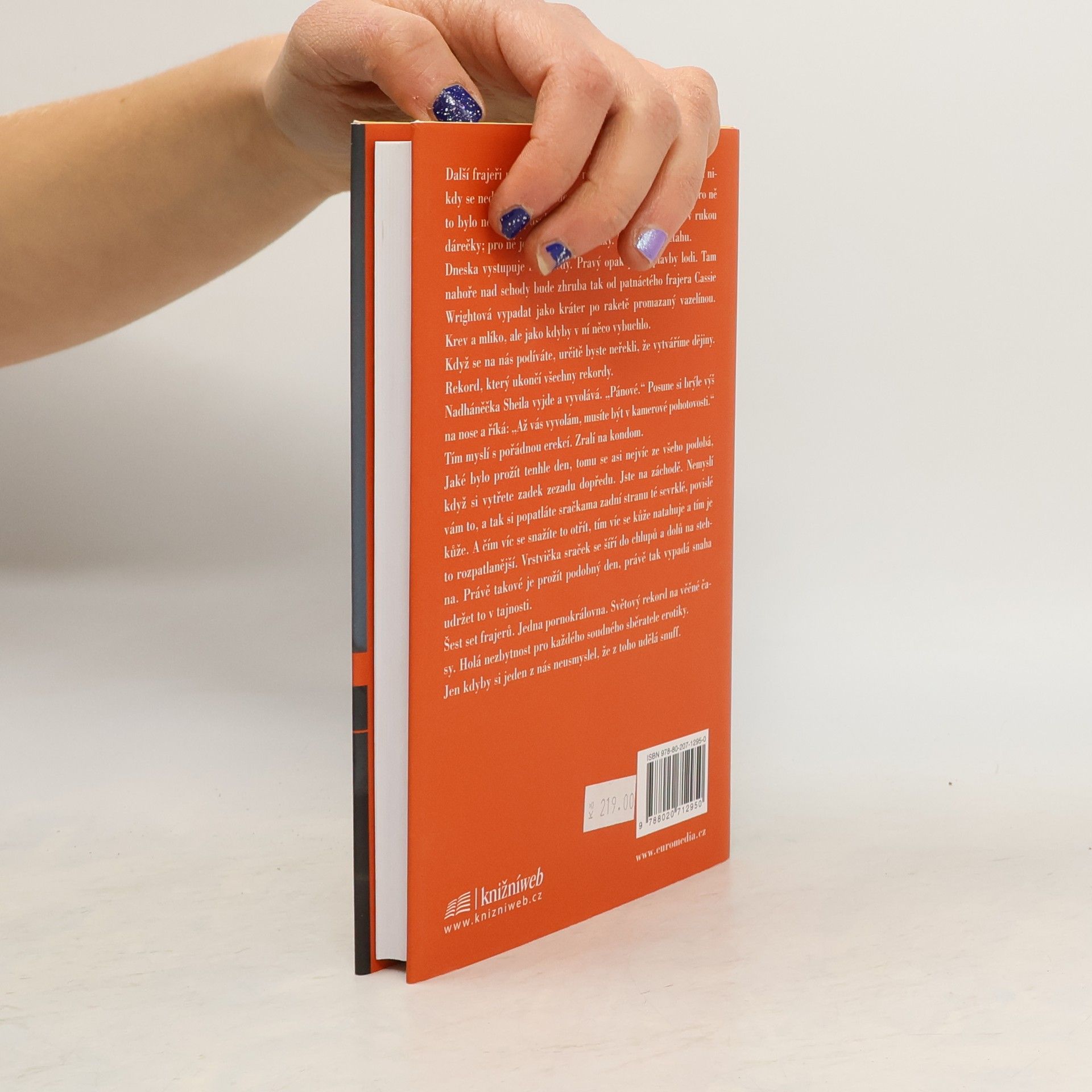 Román pro tři pornoherce a jednu asistentku. Termínem "snuff" se označují ilegální pornofilmy, v nichž je zachycena vražda či zabití. Nebo předstírání téhož, ale to už není ono. Jde o žádané zboží na trhu. V Palahniukově románu jde o smrt netradiční a přízračnou - jinak to ani u něj být nemůže: slavná pornoherečka Cassie Wrightová chce překonat stávající rekord v souložení s muži, který vytvořila Annabel Chong. Ta za deset hodin absolvovala 251 milostných aktů se zhruba sedmdesáti muži. Cassie nechce podvádět, a tak hodlá obsloužit rovných 600 mužů. A smrt? Podle Palahniuka nedokáže lidské tělo zvládnout takovou zátěž, herečka předpokládá, že při tom zemře na embolii. Cassie chce utvořit rekord na věčné časy: doufá, že když při něm zemře, oficiální místa honbu za dalšími rekordy zakáží a její výkon zůstane navždy nejlepší. Každý z oněch 600 mužů má svůj specifický důvod. Číslo 600 je bývalý slavný pornoherec Branch Bacardi, který s Cassie, které je skoro čtyřicet, natočil spoustu scén. Číslo 137 by si Cassie chtěl vzít a pořád se dopuje viagrou. A číslo 72 je její odložený syn, jenž touží po setkání s matkou. Všichni tři čekají v místnosti k prasknutí nacpané dalšími muži, kteří se udržují neustále připraveni k akci, v čemž je podporují i slavné filmové kousky z profesionální minulosti hlavní aktérky. Show může začít.