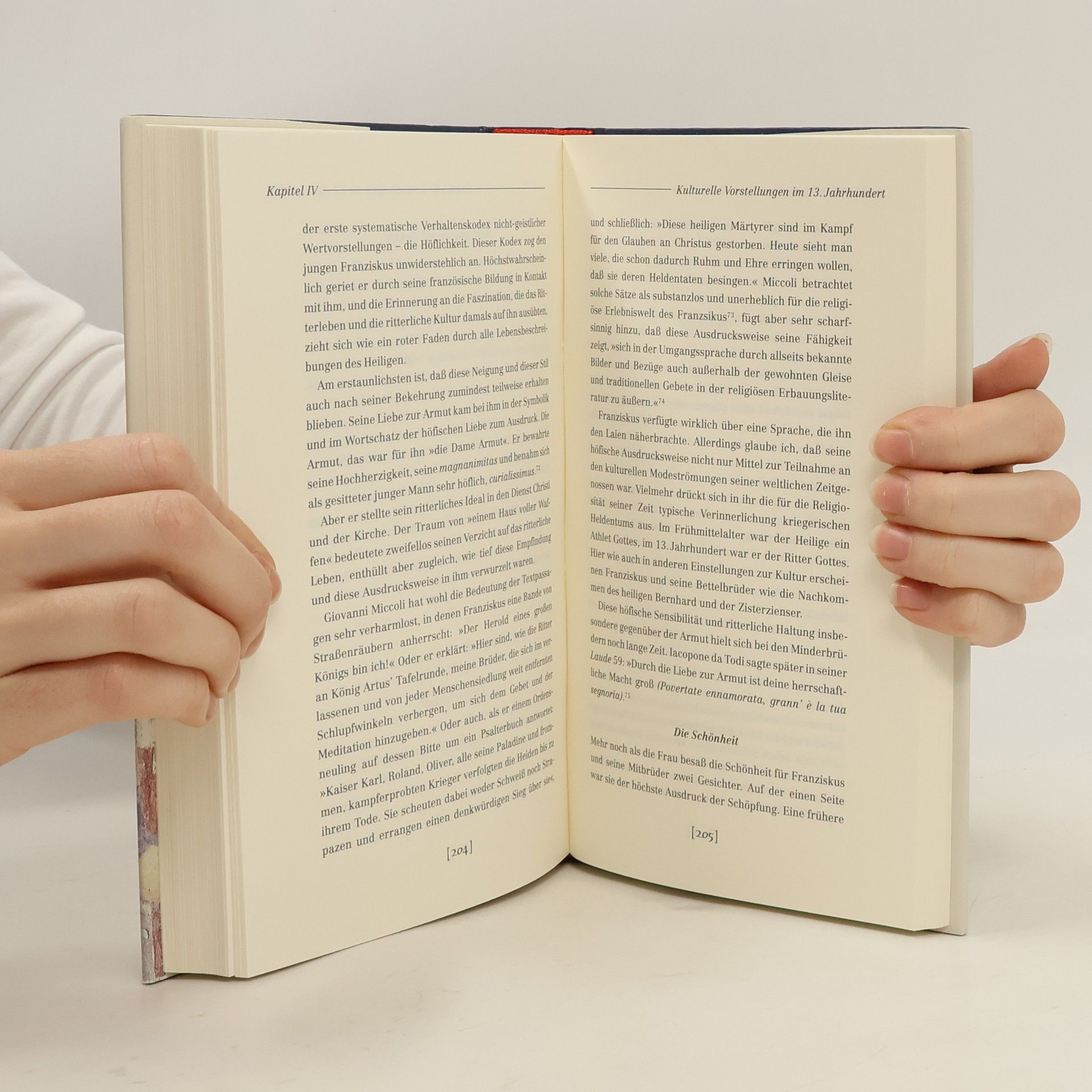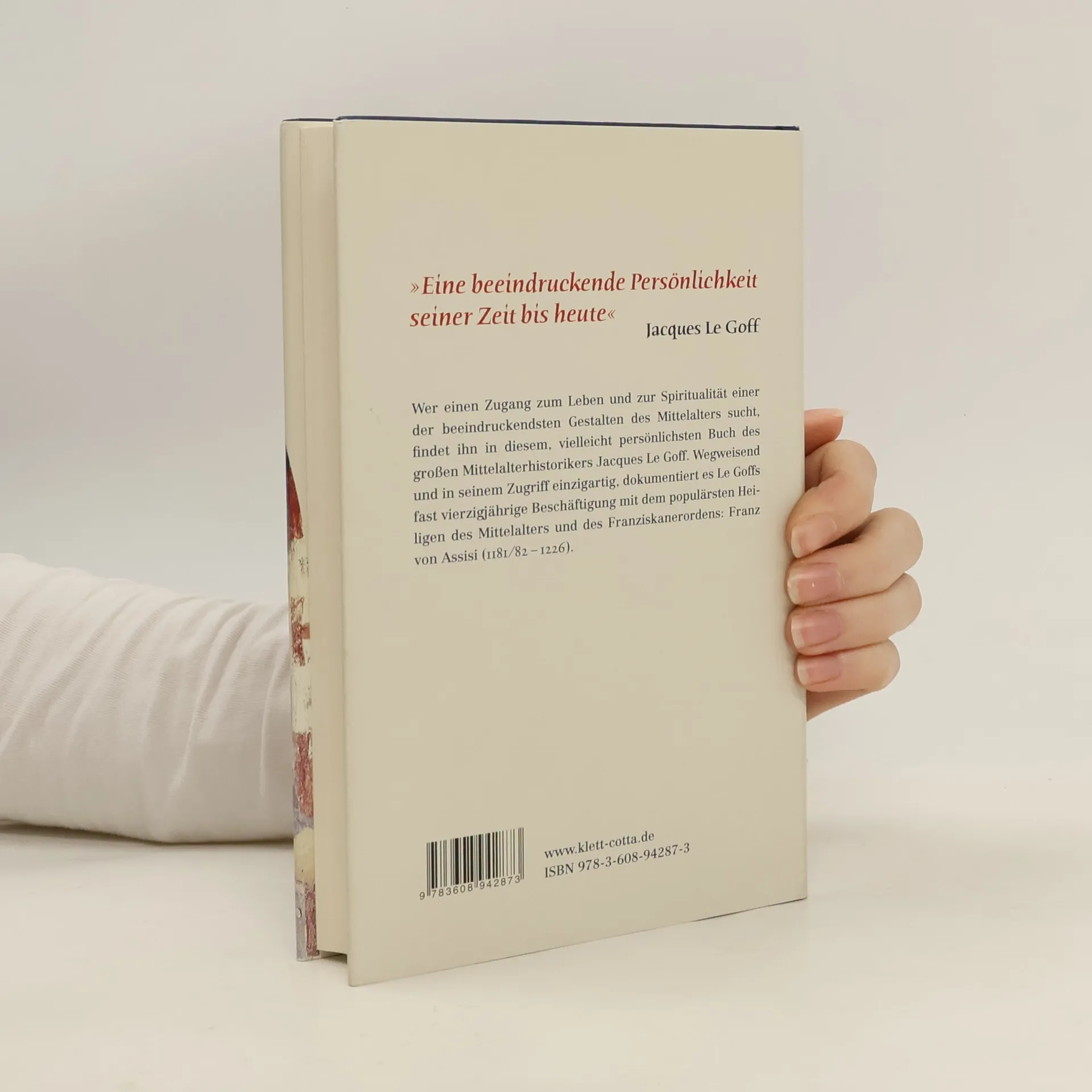 »Halb Mönch, halb Weltkind, verschrieb er sich in den aufstrebenden Städten, auf den Straßen, in der Zurückgezogenheit der Einsiedelei und mitten in der Hochblüte der höfischen Kultur einem neuen Lebensstil der Armut, Erniedrigung und Predigt am Rand der offiziellen Kirche, ohne dabei in Häresie zu verfallen, und sein Aufbegehren hatte nichts mit Unglauben zu tun. Er trug entscheidend zum Aufschwung der neuen Bettelorden bei und verbreitete in einer christlichen Gesellschaft ein neues Evangelium, das die christliche Spiritualität um eine neue Verbundenheit mit allem Lebendigen bereicherte, weshalb er auch als Begründer eines neuen Naturgefühls im Mittelalter gilt, das sich in der Religion, in der Literatur und in der Malerei niederschlug. ... Aber auch der Mensch Franz von Assisi, so wie er in seinen Schriften, in den Berichten seiner Biographen und in Bildern wiederauflebt, hat mich in seinen Bann gezogen. In ihm vereinigen sich Schlichtheit mit hohem Ansehen, Demut mit Autorität und ein ganz unauffälliges Äußeres mit einer ungewöhnlichen Ausstrahlung ...« Jacques Le Goff