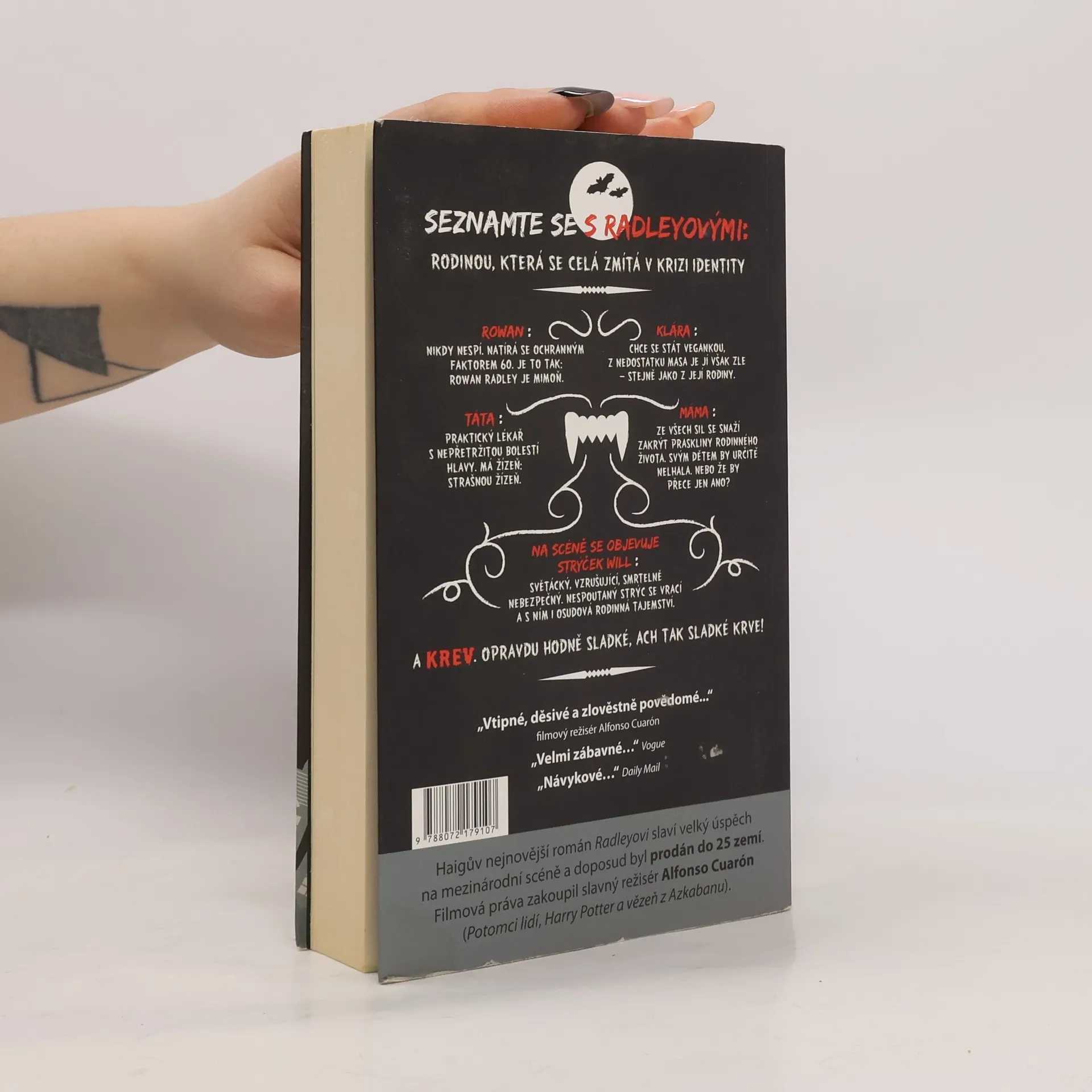 Prosím, seznamte se s Radleyovými: Petr, Helena a jejich dospívající potomci Klára a Rowan žijí v poklidné příměstské vesnici. Mohlo by se zdát, že jde o úplně obyčejnou rodinku – průměrně nefunkční a průměrně spokojenou. Jenomže manželé Radleyovi skrývají před celým světem – včetně svých dětí – jedno hrůzné rodinné tajemství. Jsou upíři, kteří se před mnoha lety rozhodli, že budou „abstinovat“ a pokusí se žít jako normální lidské bytosti. Jejich život se však obrací naruby, když se na Kláru jedné noci vrhne opilý spolužák, dívka zpanikaří, a aniž sama ví, co dělá, roztrhá ho na kusy. A rodiče jsou konečně nuceni jít s barvou ven – konkrétně s červenou, karmínovou, rudou, prostě barvou krve. A aby toho všeho nebylo málo, na rodinné scéně se objevuje temná postava strýčka Willa, bezskrupulózního upíra ze staré školy, jehož přítomnost v domě zapříčiní celou řadu dalších katastrofických situací. Tento napínavý, zábavný a neobvyklý portrét jedné mimořádné rodiny si klade otázku, v co dospíváme, když dospíváme, a ze všech stran zkoumá, co získáváme a ztrácíme, když zapřeme své „chutě“.