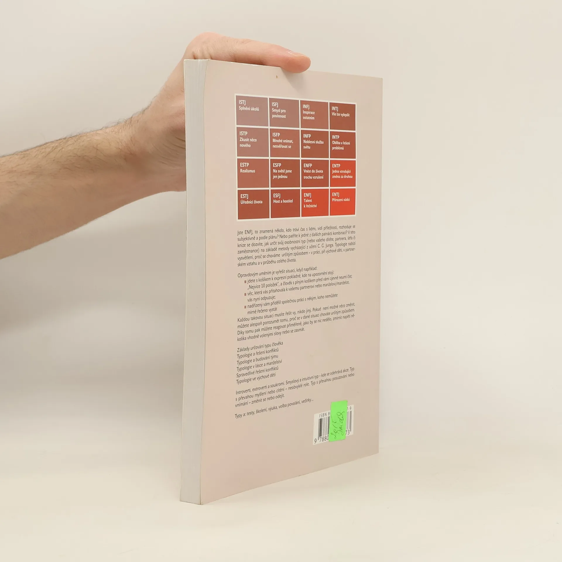 Je naší přirozeností soudit a zařazovat lidi do kategorií, i když značně subjektivně a často nepřesně. Předsudky však nejsou jen negativní. Zařazování do škatulek usnadňuje vzájemnou komunikaci s jinými lidmi, přáteli a kolegy. Rozdělení na typy je vhodnou odpovědí na škatulkování lidí, protože ho lze provádět objektivně a konstruktivně. Typologie neodstraní mezilidské problémy na pracovišti ani v partnerských vztazích, ale naučí vás chápat vaše kolegy a partnery a rozumět jejich odlišným povahám. V této knize se dozvíte, jak určit osobnostní typy na základě vědecky prokázané metody vycházející z učení C. G. Junga.... celý text